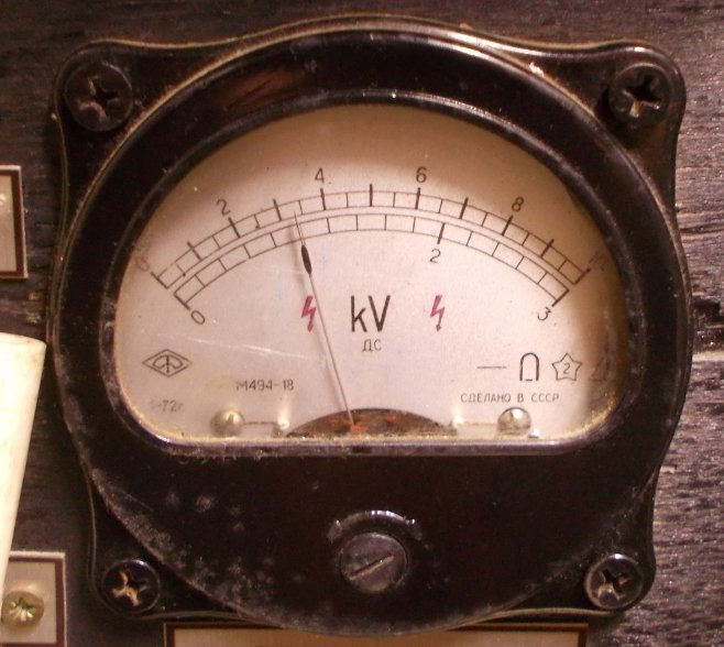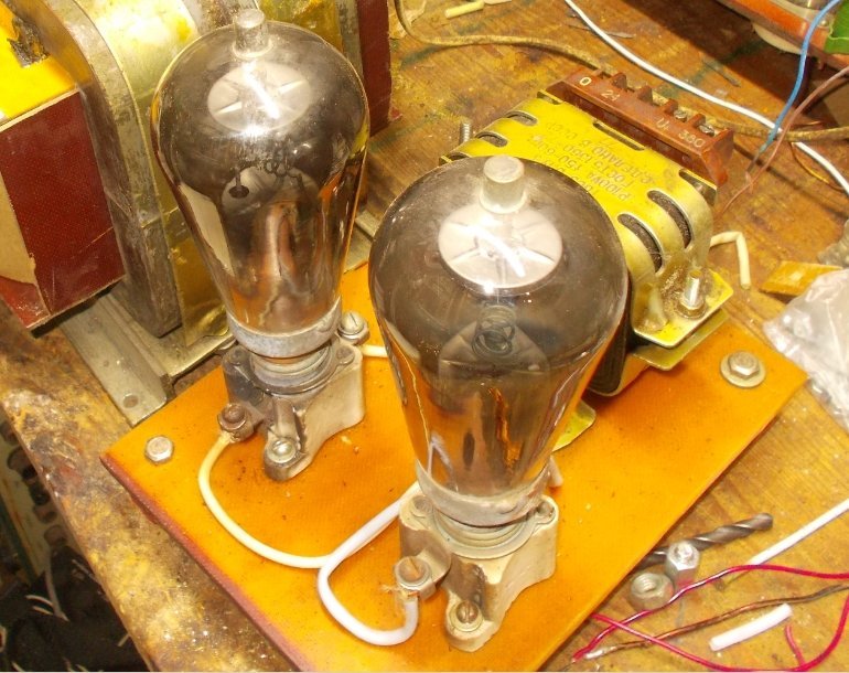 Выходной каскад требует серьезного анодного питания -- до 3.5 кВ при силе тока до 1А в пике. Высоковольтный трансформатор анодного питания -- самодельный, намотан на большом ШЛ-железе от какого-то неизвестного трансформатора, по габаритам похожего на ОСМ-1.6. Сечение сердечника составляет порядка 50 кв. см. Первичная обмотка имеет отводы для подстройки необходимой величины анодного напряжения, вторичная обмотка намотана на напряжение 6 кВ и имеет отвод от средней точки для использования трансформатора с двухполупериодным выпрямителем. Настолько высокое напряжение уже затрудняет создание такого трансформатора в сухой конструкции и после неудачной попытки трансформатор был помещен в бак с маслом, тоже самодельный. Все выводы сделаны через изоляторы в боковых стенках бака. В выпрямителе применены ртутные газотроны ВГ-129, выбор которых обусловлен исключительно их готичным внешним видом и зловещим свечением в темноте. А ещё удобным резьбовым цоколем Е27, что сразу снимало вопрос с достпуностью панелек. Накал газотронов питается от отдельного трансформатора на сердечнике от ОСМ-0.063. Изоляция накальной обмотки должна выдерживать хотя бы полуторакратное значение анодного напряжения. Выпрямленное напряжение фильтруется двухзвенным LC-фильтром. Дроссели фильтра имеют индуктивности 0.8Гн первый и 0.5Гн второй, конденсаторы -- к75-40а по 100мкф 3 кВ. После такого фильтра питание подается в анодную цепь выходного каскада. Питание второй сетки отбирается из анодной цепи драйвера на ГУ50. Также подается положительное смещение +100В на третью сетку от отдельного выпрямителя. Смещение на 1 сетку берется от источника -200В через делитель. Тут мы подходим к ключевому элементу выходного каскада -- выходному трансформатору. Выходной трансформатор дался мне нелегко и работоспособная конструкция получилась лишь с шестой попытки. Очевидно, что большая выходная мощность требует большого выходного трансформатора. Поскольку нужно, чтобы он работал от 25Гц, то грубая прикидка ставит минимальную габаритную мощность в 2.5 кВт для желаемых 1000Вт на выходе при нормальном (в электротехническом смысле) значении магнитной индукции. Очевидно, что нужно было искать железо подходящего размера. Надо отметить, что в статье об усилителе на ГУ81 был применен выходной трансформатор от, собственно, УПВ-1.25 у которого сечение керна порядка 70 кв. см. Мне же такое не было доступно, ближайший аналог такого трансформатора -- высоковольтный масляный ОМП4\10-220, применяемый в малогабаритных понижающих подстанциях с 10 кВ до 220В. Но и такой покупать лишь для того чтобы разобрать на железо жаба заквакала. На базаре подвернулась куча каких-то самодельных трансформаторов на стержневом ленточном железе напоминающем ОСМ-2.5. С ними я и начал попытки изготовления выходного трансформатора. Первую версию выходника пробило высоким практически сразу же -- сказалось отсутствие опыта и неверная оценка пиковых перенапряжений действующих на его изоляцию.6 points