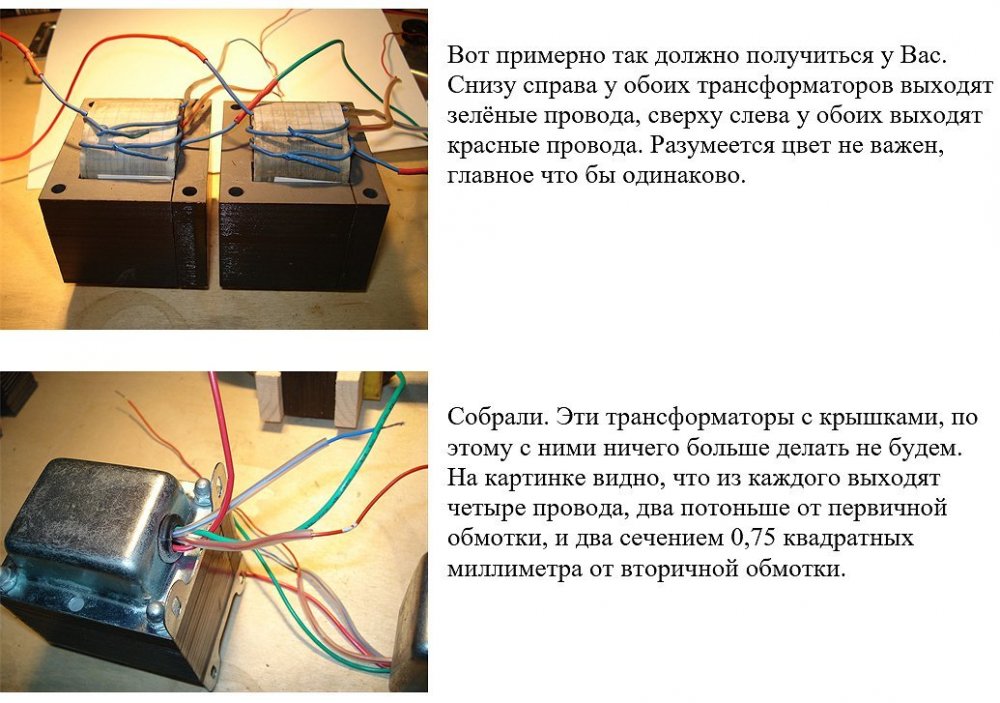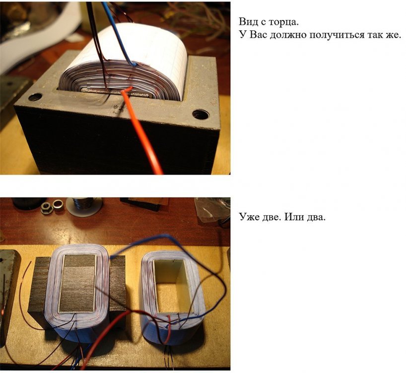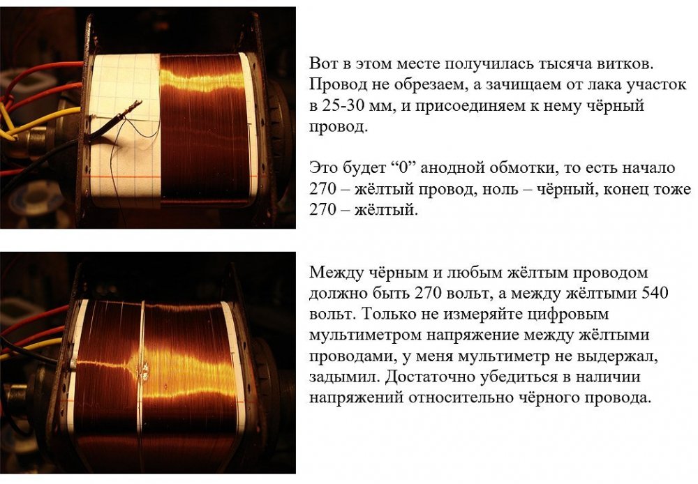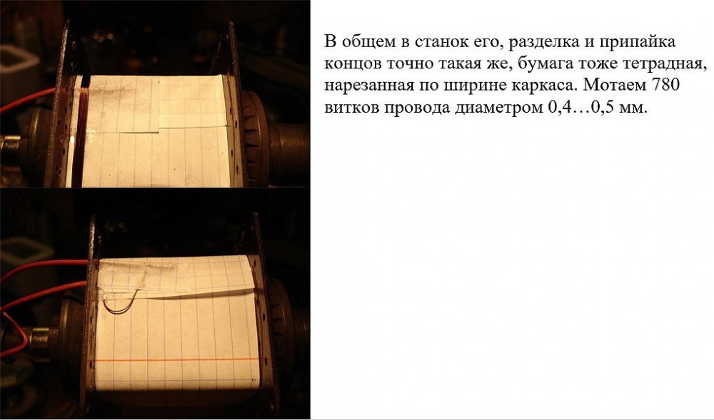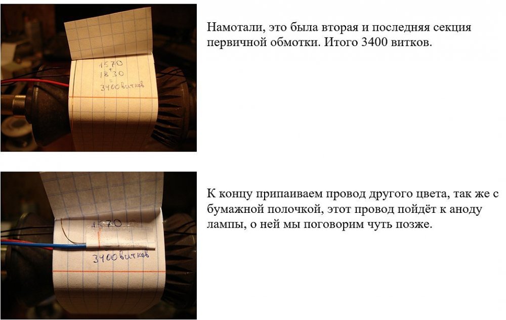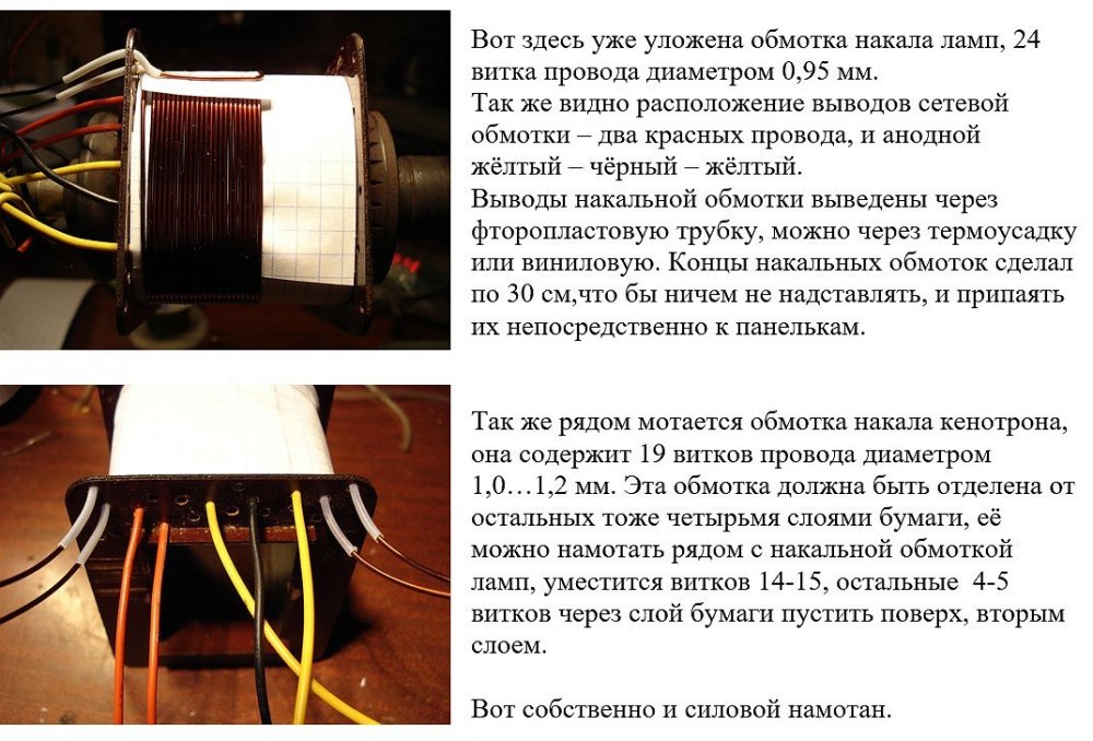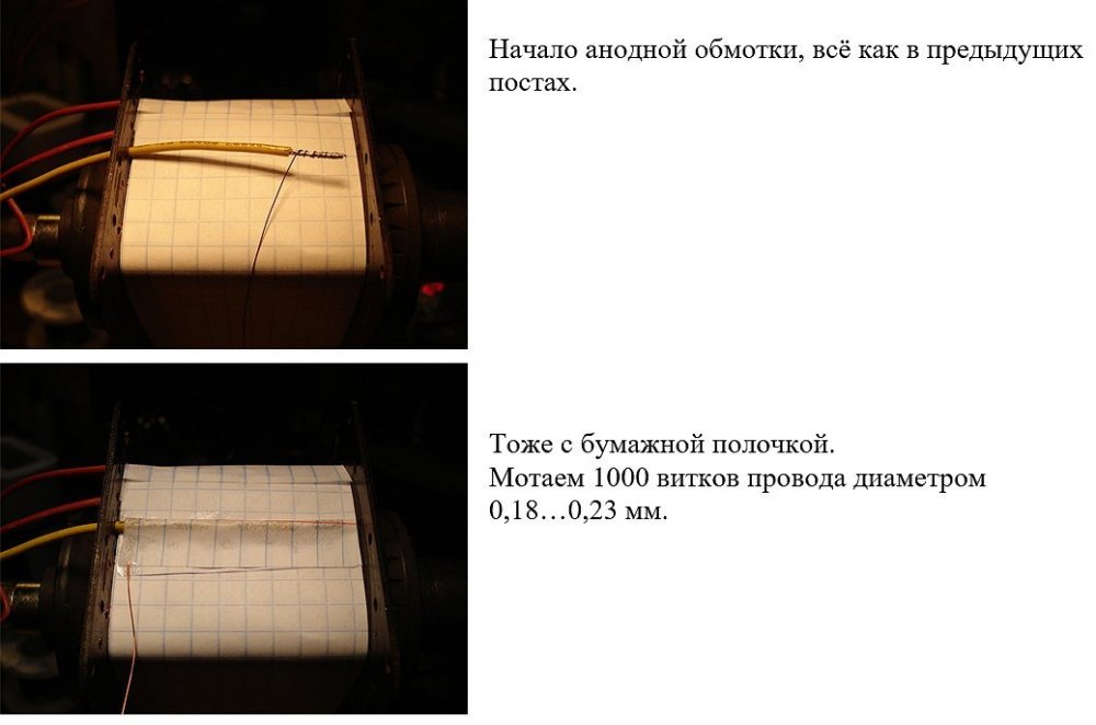 Продолжаем первичную обмотку. То есть сейчас пойдёт вторая секция первичной обмотки Для этого берём конец тонкого провода, который мы ранее отрезали и отогнули влево, перекладываем его на правую сторону, и примерно вот так укорачиваем. Зачищаем кончик от лака, примерно на 12-15 мм. На самом деле, количество витков в половинках первичной обмотки может отличаться от того, что у меня получилось. Я примерно представлял, что в окно такого размера войдёт немногим более 3000 витков провода диаметром 0,2 мм, и три слоя провода диаметром 0,63 мм. По этому в первую половину решил намотать 1500 витков ( уместилось 1570) , а во втору сколько уместится (уместилось 1830).Вполне можно уложить 1700+1700, вряд ли что от этого изменится. Если Вы задумаете применить железо от вышеуказанных ОСМ – 0,1 , то в их окно уместится 2 х 1600 витков 0,265. или 2 х 1500 х 0,28 или 2 х 2000 х 0,2. Вторичная обмотка будет иметь 3 секции по 49 витков провода диаметром 0,75 мм. Здесь можно сделать выбор, исходя из имеющегося провода. ГЛАВА ТРЕТЬЯ – СИЛОВОЙ ТРАНСФОРМАТОР. Мы решили сначала всё намотать, а уже потом всё проварить в воске, собрать, скрутить, причесать и покрасить. Значит так, для силового, или анодно – накального нам подойдёт практически любой трансформатор, мощностью от 100 ватт. Например вышеупомянутый ОСМ – 0,1 Тогда это будет выглядеть так : Сетевая обмотка 990 витков провода диаметром 0,41мм. Анодная обмотка 1250 витков провода диаметром 0,25 мм. Обмотка накала ламп 30 витков провода 0,75 – 0,8 мм. Обмотка накала кенотрона 24 витка провода 0,95 – 1,0 мм. Но у трансформаторов ОСМ – 0,1 довольно маленькое окно, мы не сможем разместить “правильную” анодную обмотку, то есть нам нужно выпрямленных 270 вольт, кенотрон представляет из себя два диода, и что бы нам получить двухполупериодный выпрямитель, нужно иметь обмотку 270 – 0 – 270 вольт, то есть 540 с отводом от середины. Как я уже писал, в окно ОСМ – 0,1 столько провода не войдёт, уместится только одна обмотка на 270 вольт, и к кенотрону придётся добавить пару полупроводниковх диодов, в принципе ничего страшного, мы часто так делаем, но хочется что бы было по настоящему, как в те времена, когда полупроводниковых диодов ещё не было. Более подробно мы вернёмся к обсуждению выпрямителя, когда перейдём к основной схеме. А сейчас продолжаем мотать. У нас ничего не должно, и не может гудеть. Сетевая обмотка этого трансформатора содержала слишком мало витков, всего 660. Внешний размер железа 105 х 90 мм. , толщина набора 50 мм. , в общем трансформатор с излишней мощностью, но для усилителя это даже полезно, да и греться не будет. Размер окна 17 х 52 мм. Думаю нет смысла описывать его разборку и разматывание. Сетевая обмотка готова, выводы сделаны проводом сечением 0,5 квадратных мм. , в изоляции красного цвета. Дальше три слоя бумаги. Начали вторую тысячу. Здесь видно как сделан нулевой отвод. Собственно так же точно мотается вторая половина анодной обмотки, и заканчивается припаиванием к ней второго жёлтого провода. Сверху кладём четыре слоя бумаги. Предвижу справедливый вопрос уважаемого читателя, хороший вопрос J , а всё таки, что же мы делаем ? Вот теперь, когда у нас материализовались трансформаторы, мы уже можем из них что-то сложить. Мы выбрали вот такой корпус из имеющихся у нас. Как говорится не низок не высок, именно то, что нужно, всё умещается. Это прикидочная расстановка, что бы было понят