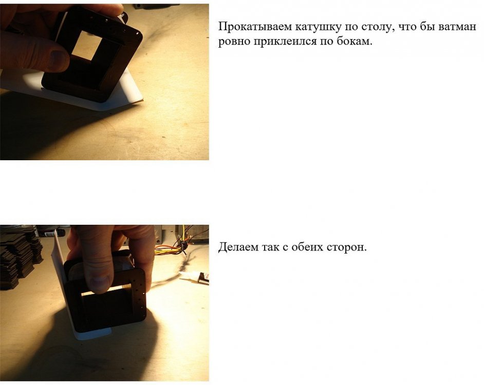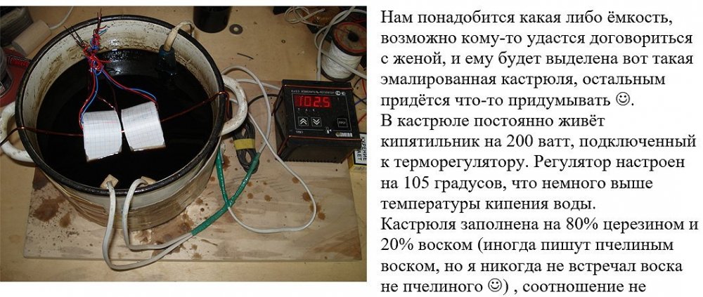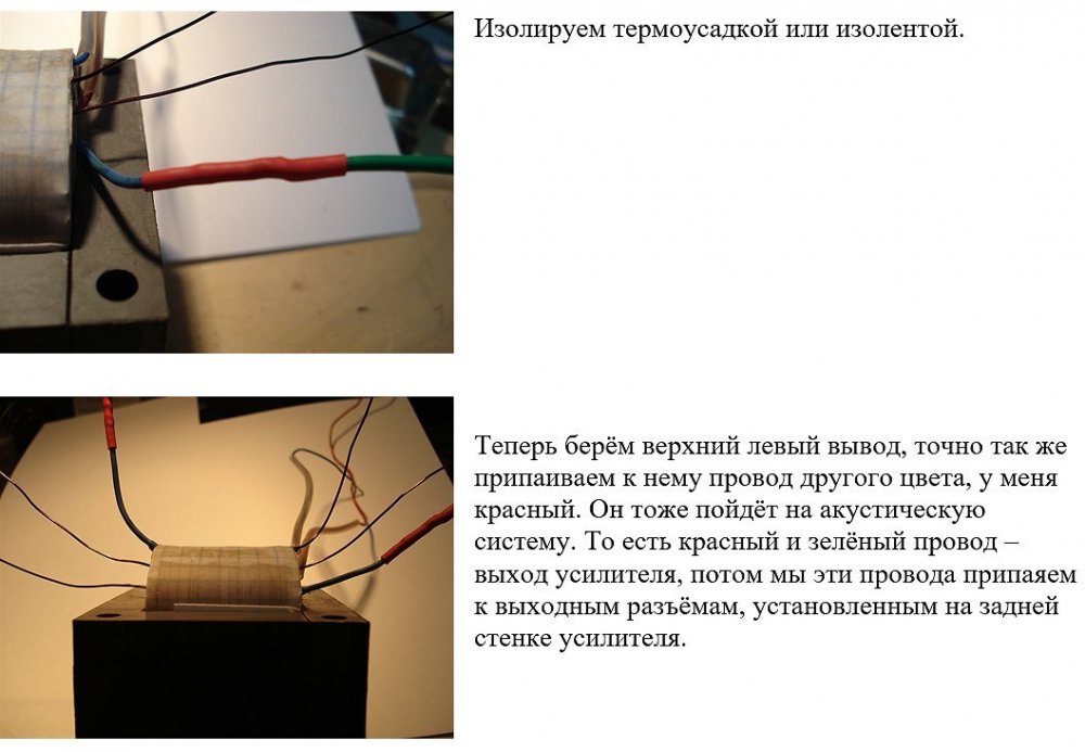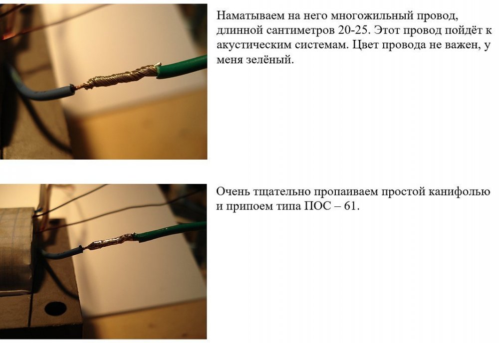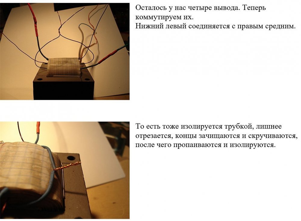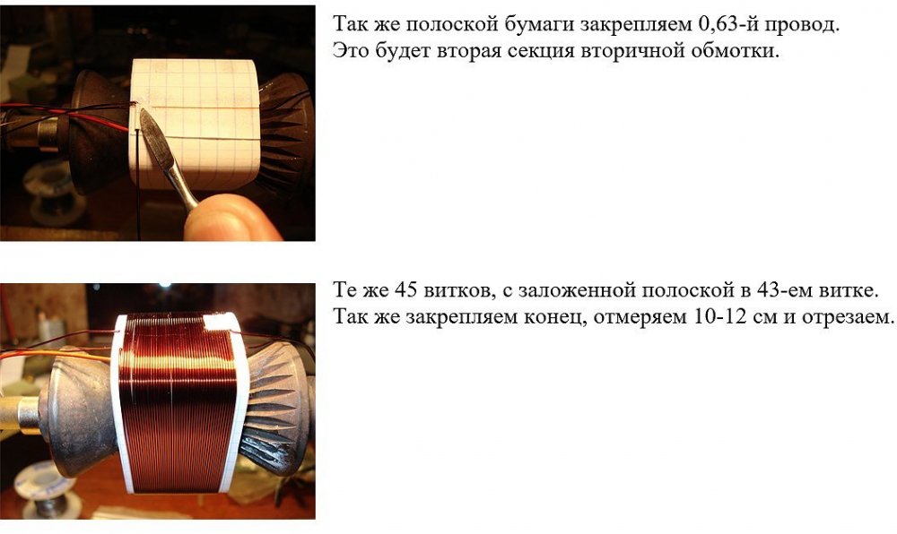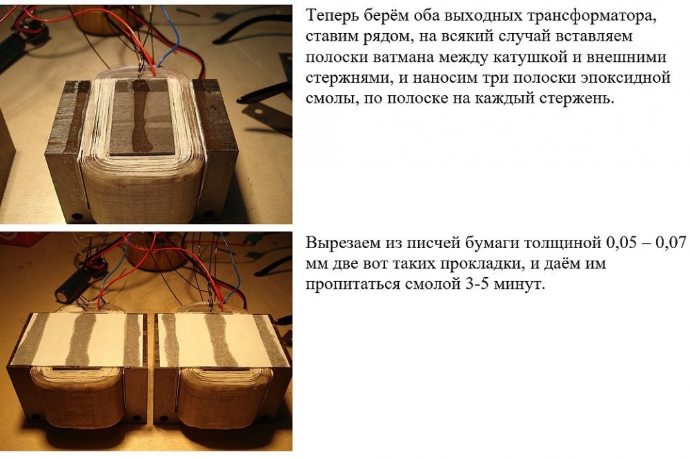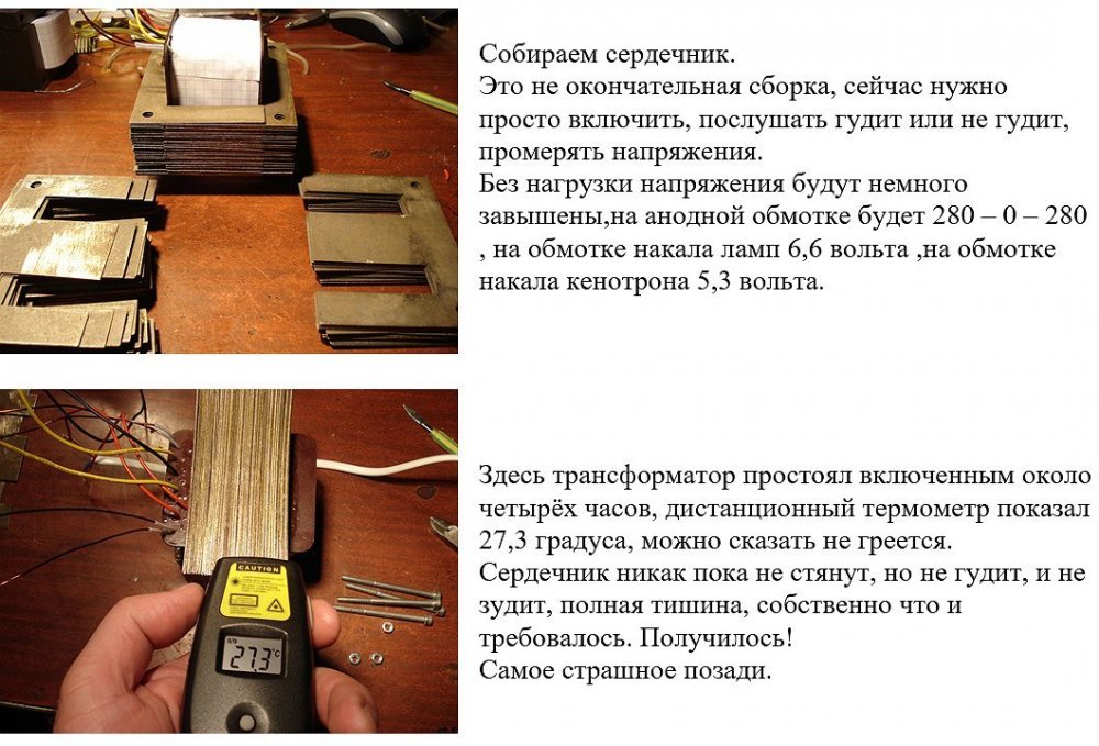 Продолжаем первичную обмотку. То есть сейчас пойдёт вторая секция первичной обмотки Для этого берём конец тонкого провода, который мы ранее отрезали и отогнули влево, перекладываем его на правую сторону, и примерно вот так укорачиваем. Зачищаем кончик от лака, примерно на 12-15 мм. На самом деле, количество витков в половинках первичной обмотки может отличаться от того, что у меня получилось. Я примерно представлял, что в окно такого размера войдёт немногим более 3000 витков провода диаметром 0,2 мм, и три слоя провода диаметром 0,63 мм. По этому в первую половину решил намотать 1500 витков ( уместилось 1570) , а во втору сколько уместится (уместилось 1830).Вполне можно уложить 1700+1700, вряд ли что от этого изменится. Если Вы задумаете применить железо от вышеуказанных ОСМ – 0,1 , то в их окно уместится 2 х 1600 витков 0,265. или 2 х 1500 х 0,28 или 2 х 2000 х 0,2. Вторичная обмотка будет иметь 3 секции по 49 витков провода диаметром 0,75 мм. Здесь можно сделать выбор, исходя из имеющегося провода. ГЛАВА ТРЕТЬЯ – СИЛОВОЙ ТРАНСФОРМАТОР. Мы решили сначала всё намотать, а уже потом всё проварить в воске, собрать, скрутить, причесать и покрасить. Значит так, для силового, или анодно – накального нам подойдёт практически любой трансформатор, мощностью от 100 ватт. Например вышеупомянутый ОСМ – 0,1 Тогда это будет выглядеть так : Сетевая обмотка 990 витков провода диаметром 0,41мм. Анодная обмотка 1250 витков провода диаметром 0,25 мм. Обмотка накала ламп 30 витков провода 0,75 – 0,8 мм. Обмотка накала кенотрона 24 витка провода 0,95 – 1,0 мм. Но у трансформаторов ОСМ – 0,1 довольно маленькое окно, мы не сможем разместить “правильную” анодную обмотку, то есть нам нужно выпрямленных 270 вольт, кенотрон представляет из себя два диода, и что бы нам получить двухполупериодный выпрямитель, нужно иметь обмотку 270 – 0 – 270 вольт, то есть 540 с отводом от середины. Как я уже писал, в окно ОСМ – 0,1 столько провода не войдёт, уместится только одна обмотка на 270 вольт, и к кенотрону придётся добавить пару полупроводниковх диодов, в принципе ничего страшного, мы часто так делаем, но хочется что бы было по настоящему, как в те времена, когда полупроводниковых диодов ещё не было. Более подробно мы вернёмся к обсуждению выпрямителя, когда перейдём к основной схеме. А сейчас продолжаем мотать. У нас ничего не должно, и не может гудеть. Сетевая обмотка этого трансформатора содержала слишком мало витков, всего 660. Внешний размер железа 105 х 90 мм. , толщина набора 50 мм. , в общем трансформатор с излишней мощностью, но для усилителя это даже полезно, да и греться не будет. Размер окна 17 х 52 мм. Думаю нет смысла описывать его разборку и разматывание. Сетевая обмотка готова, выводы сделаны проводом сечением 0,5 квадратных мм. , в изоляции красного цвета. Дальше три слоя бумаги. Начали вторую тысячу. Здесь видно как сделан нулевой отвод. Собственно так же точно мотается вторая половина анодной обмотки, и заканчивается припаиванием к ней второго жёлтого провода. Сверху кладём четыре слоя бумаги. Предвижу справедливый вопрос уважаемого читателя, хороший вопрос J , а всё таки, что же мы делаем ? Вот теперь, когда у нас материализовались трансформаторы, мы уже можем из них что-то сложить. Мы выбрали вот такой корпус из имеющихся у нас. Как говорится не низок не высок, именно то, что нужно, всё умещается. Это прикидочная расстановка, что бы было понят