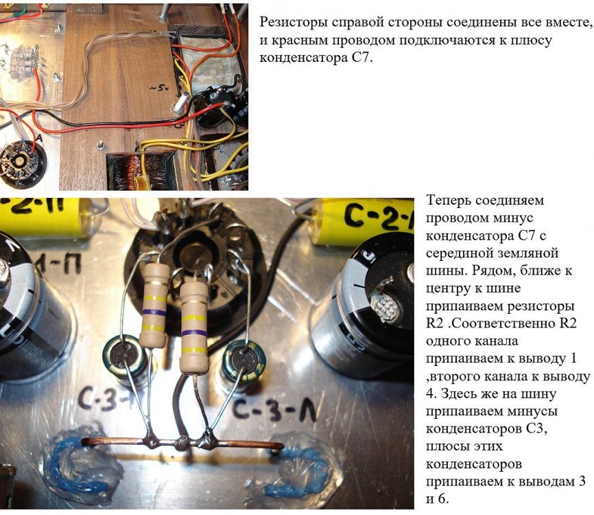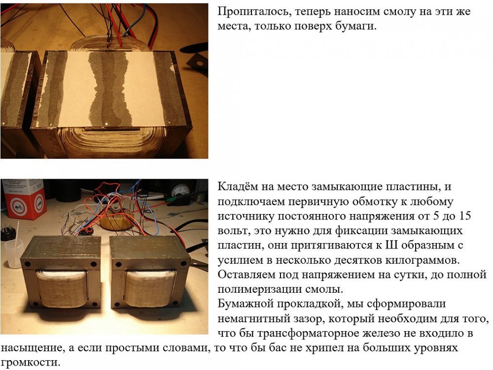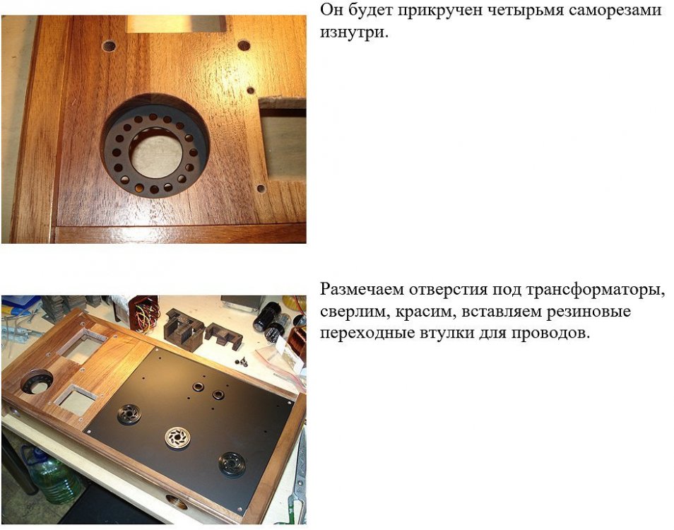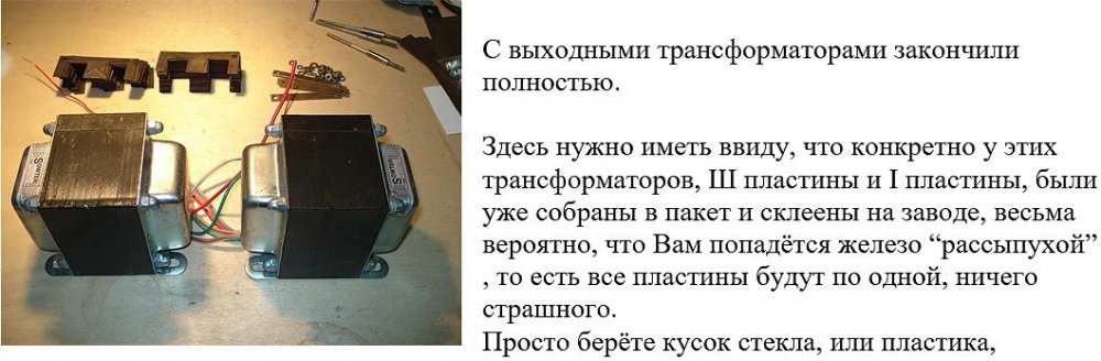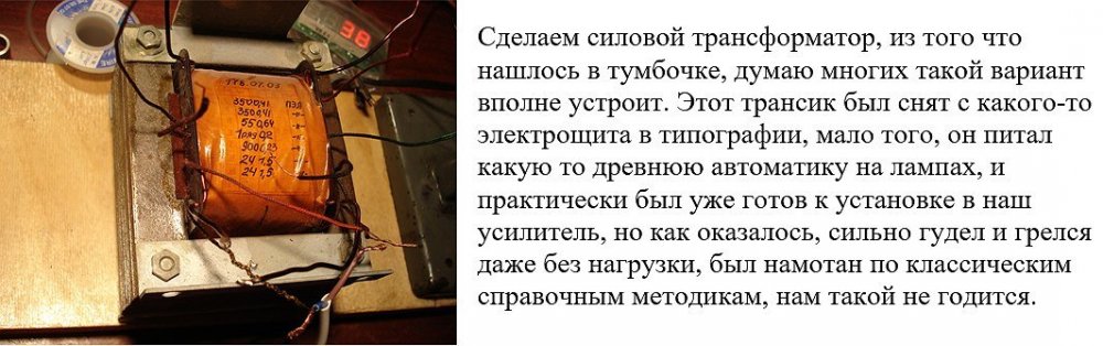 Выкладываю на всеобщее обозрение своё творение. Может кому поспособствует. Адептов брендовых трансформаторов, конденсаторов, регуляторов и прочего - прошу категорически воздержаться от комментирования, тема не об этом. _________________________________________________________________ Собираем усилитель. Краткое, но очень полезное руководство по самостоятельной сборке лампового усилителя. Руководство содержит принципиальную схему,а так же поэтапную монтажную схему усилителя с пояснениями и фото,а так же методику намотки всех трансформаторов с подробнейшим описанием и фото. Здравствуйте уважаемые читатели. В нашем первом номере, мы хотим донести до Вас, как, и из чего можно собрать ламповый усилитель. Это одно из очень немногих изданий, в котором будет описан весь процесс, включая намотку силового и выходных трансформаторов, как быстро и бюджетно сделать намоточный станок, а самое главное, как именно нужно расположить детали будущего усилителя, куда припаять, и где заземлить. Сразу скажу, что схема очень простая, я бы сказал классика 50-х годов, в ней нет никаких стабилизаторов, полупроводниковых и батарейных источников смещения и диодных выпрямителей. Есть тысячи схем, сотни различных авторских концепций, но мы решили начать со схемы приведённой практически в каждом справочнике радиолюбителя. Не смотря на простоту, звучит она замечательно, надеемся что и Вам понравится. Внешний вид и корпус Вам сейчас представить пока ещё трудно, потому что возможно Вы ещё не задумывались всерьёз над конструктивом, да и сложить что-то из того чего нет, в общем проблематично. Требуется визуализация компонентов, по этому предлагаю начать с трансформаторов. Вы спросите, почему с них ? Отвечу, потому что ими печально завершились многие успешно начатые проекты, у многих людей. Кто-то применил готовые ТАН, ТН в качестве силовых, у кого-то работают, у кого-то гудят громче играющего усилителя. Кто-то применил в качестве выходных, трансформаторы от телевизоров, радиол или купил где-то готовые, вроде как для аудио, но оказалось они намотаны внавал, не секционированы, и вообще человек от них избавился, а не продал. К тому же готовые трансформаторы могут быть просто не для Вашего комплекта ламп, или от гитарного усилителя, а хуже того – китайские. Я не кидаю камень в чей-то огород, добросовестных производителей достаточно, но и негатива хватает. Ну, приступим. ГЛАВА ПЕРВАЯ – НАМОТОЧНЫЙ СТАНОК. Для намотки нам потребуется прежде всего намоточный станок, если его нет, можно использовать например ручную дрель, зажатую в тиски, но это не удобно, плоскость вращения рукоятки не та, трудно будет укладывать витки. Мы можем сделать его сами, потребуется три куска толстой фанеры или доски, пара подшипников с внутренним диаметром 8 мм. ,резьбовая шпилька, шайбы и гайки. Из приведённых фото, думаю будет всё понятно. Две вертикальные детали приклеиваются эпоксидной смолой к третьей горизонтальной. Естественно перед склеиванием, нужно просверлить отверстия под подшипники, с таким расчетом, что бы подшипники свободно входили. Далее устанавливаем вертикальные детали на горизонтальную, снизу прихватываем парой тонких саморезов, и обливаем по кругу эпоксидной смолой, можно нагреть феном, для ускорения полимеризации. Собственно станок почти готов, почти можно пользоваться, то есть не хватает счётчика