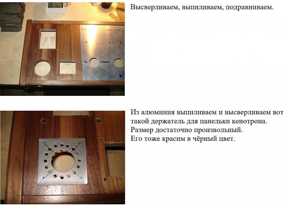 Продолжил работу по доработке конструкции, боремся за каждый миллиметр. Изменил крепление межкаскадных трансформаторов к основанию, убрал шайбы и сточил головки болтов на корпусе МКТ, в подвале стало свободней, теперь все удобно монтируется не мешая друг другу. Накальный блок выполнен как самостоятельный элемент, включает в себя; основу из сплава алюминия, к ней шпильками притянут трансформатор, на нее крепятся конденсаторы фильтра, будут смонтированы четыре диода Д305. Предусмотрена возможность установки двух вентиляторов, диаметром 80х15-25мм, примерочная панель их установки будет заменена на лист резины т.3-4мм. Проведена работа по увеличению сечения каналов охлаждения и снижения динамического сопротивления потоку воздуха (на фото внутри корпуса черным цветом показано движение воздуха, чертилкой обозначено расположение ламповой и вентиляторной панелей). Выполнено два варианта верхней декоративной панели (панель с большим общим окном, позволяет реализовать новое по дизайну ограждение ГМ70, с центральной стойкой между лампами). Были изготовлены новые шаблоны для фрезернокопировального станка, прежние отверстия были выполнены перовыми сверлами. Крепление к основанию накального блока и двух МКТ, усиленно стальными (нерж.) вставками.13 points