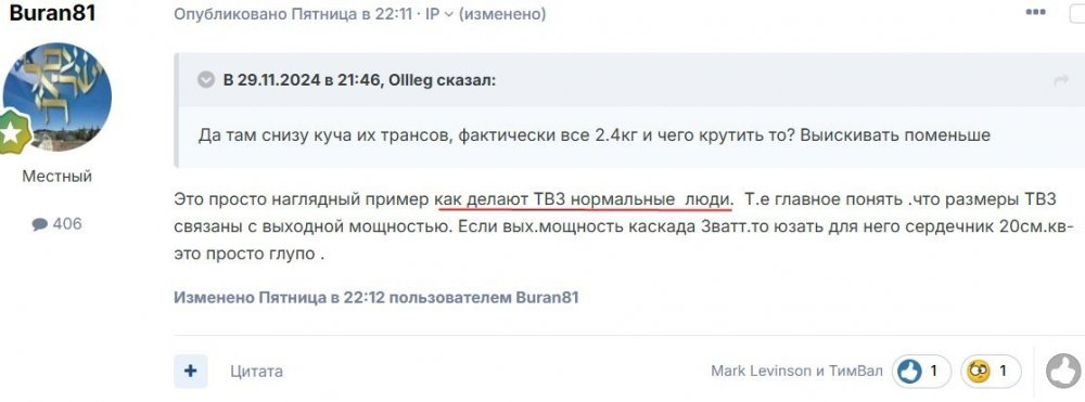 Еще вопрос в какую сторону влияют. Ну подняли вы "низ" до 1,5 Гц. или опустили, хрен разберёт. А "середина" окривела и "верх" зазвенел. Зато у ТВЗ появился свой "голос"! Боже упаси кого то куда то засовывать. Даже в мыслях не было. Ну это уж вы сами... Мы тут ни при чем. Опять же и не нормальность разная бывает. Гений то же в принципе не нормален. "Мы тут ни при чем." это отождествление с кем? За "нормальность" топит Буран, сколько не изменял коммент, смысл остался тот-же, лучше бы в первом варианте и оставил, а то по 10 раз нужно возвращаться и перечитывать - чего он там ещё наисправлял и дописал... Уже писал , но повторюсь, дохлый тонкий звук, будь он хоть трижды ровен от 30гц до 20.000гц , считаю обычным ширпотребом, на радость массам, заимевшим недорогой лампадник и сравнившим его со своим 100 ватным транзисторным - а лампа то хлюпкий звук, вот транзисторный сразу слышно - 100 ваттная мощь играет! А услышав тот же осм 0.25 народец у меня дома просто не верил, что играет 3 ватный усь ! По мощи и динамике он Luxman L540 100 ватному ничем не уступает - и середина на месте и верхов хватает , да и сравнить можно сразу - всё в одной стойке. Но вот я прекрасно помню, как звучали ТВЗ замухрышки, а Вы, уважаемый Валерий, не слышали и сравнить Вам не с чем, так как свято верите в то, что раз ОСМ 0.063 по ачх достаточен, то нечего иным и заморачиваться.... А зря! Всё должно познаваться в сравнении - только тогда можно рассуждать, что плохо, что хорошо, а что одинаково.... Нужно сначала мозгами осмыслить, для чего нижняя полоса в 1.5 гц на ТВЗ, а уже потом писать, что я ниже 30гц не слышу и мне этого НЕ НАДА.. Цикин сказал достаточно так , я сделал , я молодец, я не заморачиваюсь , я нормальный человек... Про Бурана молчу, там рулит иное, там покупатели должны читать, он же не дурак, как Д.Д. или я, он понимает, чем больше - тем дороже, а чем дороже, тем меньше шансов продать - вот тебе и вся "политика партии" . И кто его знает, за что он "топил бы" , не будь сего ограничения, как потока на продажу.....9 points