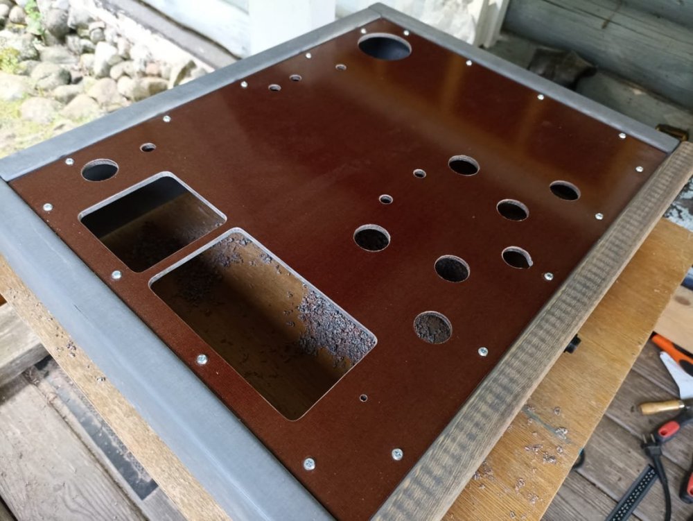 Пока трудился над этим усилителем, читал ветки про серьезные усилители в 50-70кг в моноблоке, мкт под 10кг весом, со стабилизаторами на каждый каскад отдельно. И как-то неловко стало за свои поделки.Ну да ладно, мне и так кайфово. Намотал выходники. Сделал монтажные платы. Примотал к жалу паяльника (60Вт),медный экран медной проволокой. Получилась кисточка. Прогрел и пропитал её припоем. Дорожки смазал спирто-канифольной смесью и "покрасил" их припоем. Наносится очень быстро, равномерно, тонким слоем, без перегрева поверхности. На панели сделал все крепежные элементы. Шляпки винтов чуть уменьшил, и углубил в панели ниже поверхности на 1мм. Шляпки залил эпоксидкой и зашлифовал в ровень поверхностью панели. Деревянную рамку покрыл тонирующим масло-воском. Остальное покрасил из баллончика краской на акриловой основе. Два слоя грунта, шлифовка, три слоя краски с промежуточной шлифовкой. Окончательно панель немного отполировал автомобильной полировочной пастой.Нравится мне вот такое оформление. Решил такого цвета сделать панель. Вот так выглядит у меня. Осталось набить платы деталями.12 points