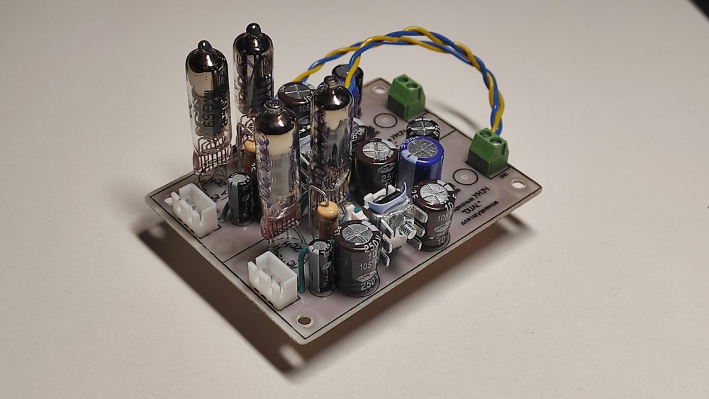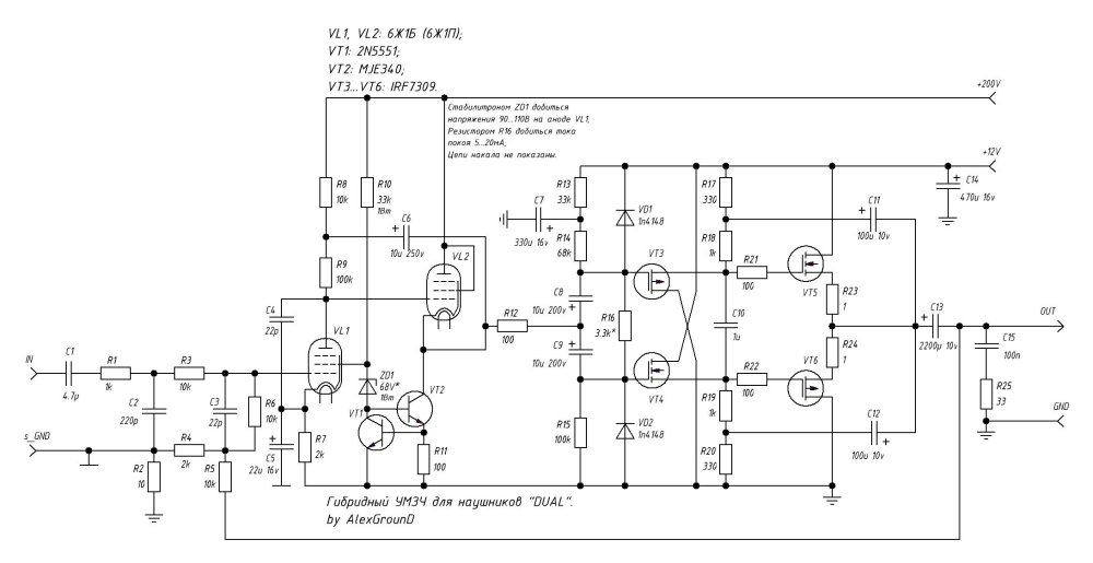 Делюсь новой схемой гибридного усилителя от AlexGround: Доброго времени суток! Я давно хотел сделать гибрид, используя современную схемотехнику и полностью раскрыть его потенциал. Однако гибриды, которые я видел в открытом доступе в интернете (по крайней мере, те, которые мне попадались), схемотехнически не представляют ничего интересного на мой взгляд. Они начинаются с откровенно неудачных решений, таких как однотактные печки в классе А без ООС с питанием лампы напряжением 12...24 В, и заканчиваются гибридами с претензией на серьезность, например, "Заратустра" или "Муген". В них применены достаточно странные решения, преимущества которых не очевидны, а недостатки ощутимы, не говоря уже о том, что в большинстве гибридных усилителей выходной каскад не охвачен общей обратной связью. Результатом таких странных решений станет целый спектр "приятных" и не очень искажений на выходе. Остальные попавшиеся мне на глаза гибридные усилители копируют в том или ином виде описанные выше структуры с не принципиальными изменениями. Я хочу предложить (или обратить внимание, если такие схемы есть, но они не попали в моё внимание) иную концепцию гибридных усилителей. Я решил воплотить ее в жизнь для проверки идеи в минимальной портативной версии, в качестве усилителя для наушников, под названием "Dual". Усилитель состоит из двух каскадов, ламповый каскад усилителя напряжения с повторителем на лампах 6Ж1Б (аналоги 6Ж1П, 6J1), и полупроводниковый выходной каскад на транзисторных(MOSFET) сборках. Усилитель напряжения выполнен на лампе VL1 в пентодном включении. Она нагружена на резистор R9, по переменному току имеется ПОС через конденсатор С6, так называемая "вольтдобавка", что повышает сопротивление нагрузки по переменному току, и как следствие усиление данного каскада возрастает, в комплексе с работой на повторитель выполненый на лампе VL2 имеем усиление 62 дБ (измеряно на частоте 1 кГц). Повторитель на VL2 нагружен на источник тока выполненый на транзисторах VT1, VT2 и особенностей не имеет. Касательно транзисторной части, по моему мнению, было применено достаточно изящное решение с применением сборок N+P канал типа IRF7309. Что позволяет получить близкую к идеалу термокомпенсацию, так как транзисторы выходного и предвыходного каскада имеют температурный контакт внутри корпуса. Сам каскад представляет собой хорошо знакомый параллельный повторитель, с вольтдобавкой через конденсаторы С11, С12. Это решение позволяет получить RAIL-TO-RAIL выходной каскад, так как напряжение на затворе легко превышает напряжение на выходе и позволяет открыть мосфет полностью. На выходе установлен конденсатор, который позволяет закрыть глаза на упрощение выходного каскада в вопросе слежения за постоянной составляющей на выходе (данный узел отсутствует). Однако выходной конденсатор охвачен общей обратной связью, и искажения вносимые им так же исправляются ООС. К сожалению у меня нет возможности снять все параметры которые хотелось бы, однако приложу характеристики и некоторые измеренные параметры усилителя: Питание ламповой части: 200 В (12...15 мА); Питание транзисторной части: 12 В; Выходная мощность: 500 мВт (32 Ом); Глубина ОС: 46 дБ/ 1 кГц, 35 дБ/ 20 кГц; Неравномерность АЧХ в диапазоне 20 Гц - 20 кГц не более: +/- 0.3 дБ; Коэффициент усиления: 6,4 раз (16 дБ). На мой взгляд именно концепция предложенная в гибриде "DUAL" явл