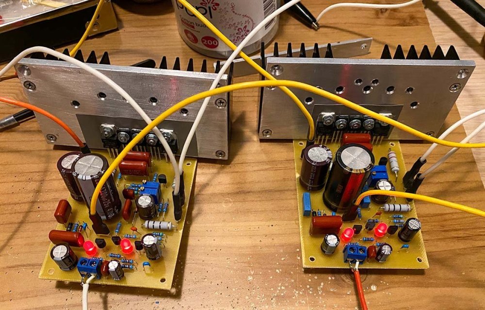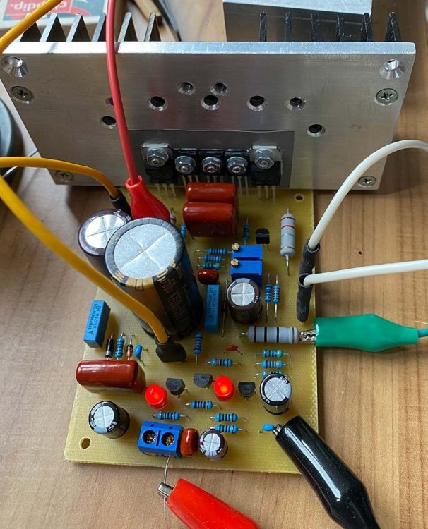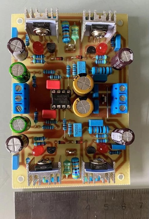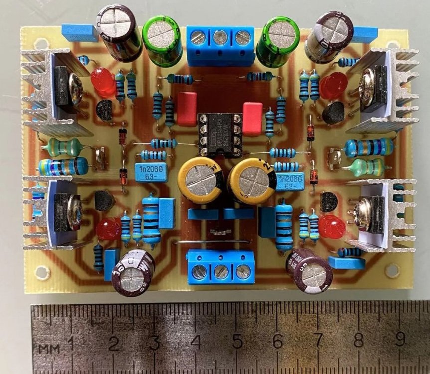 Собрал пробную плату из своего поста выше. Запустилось сразу без проблем. Первый запуск и наладку делаю всегда с ограничением по току на ЛБП. Выставил примерно половину напряжения питания в точке А, ток покоя установил в районе 100мА. В качестве эквивалента нагрузки подключил резистор 4,7 Ом. На максимальной мощности выставил напряжение в точке А точнее, чтобы ограничение нижней и верхней полуволн наступали одновременно. При напряжении питания 30В у меня получилось 14,82 В в точке А. При питании 30В получил 12,68 Вт максимальной неискаженной мощности на синусе. Форма прямоугольного сигнала на 1 кГц идеальная. И пара фоток в собранном виде: