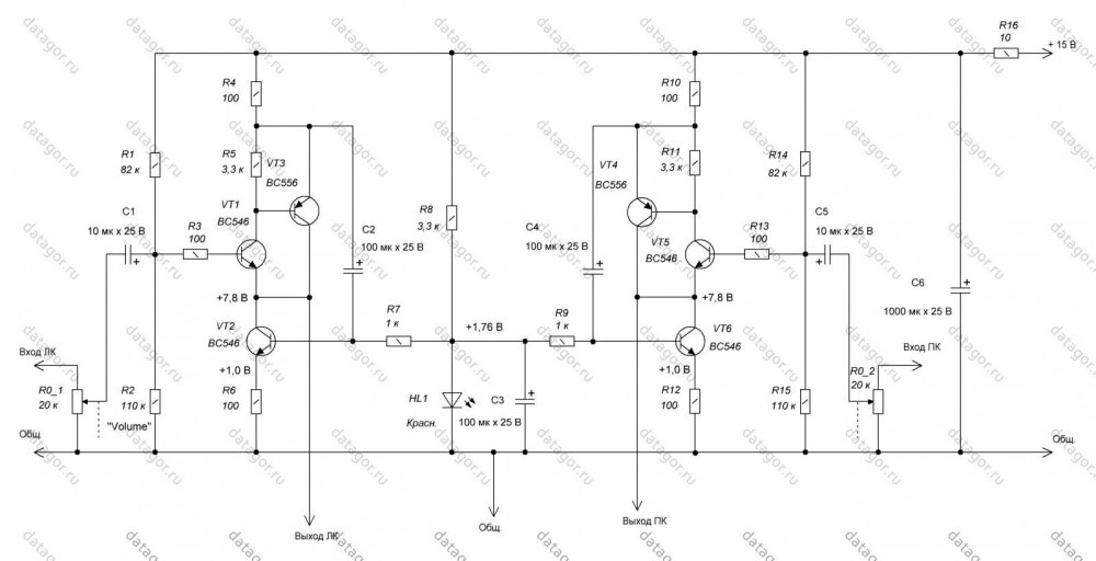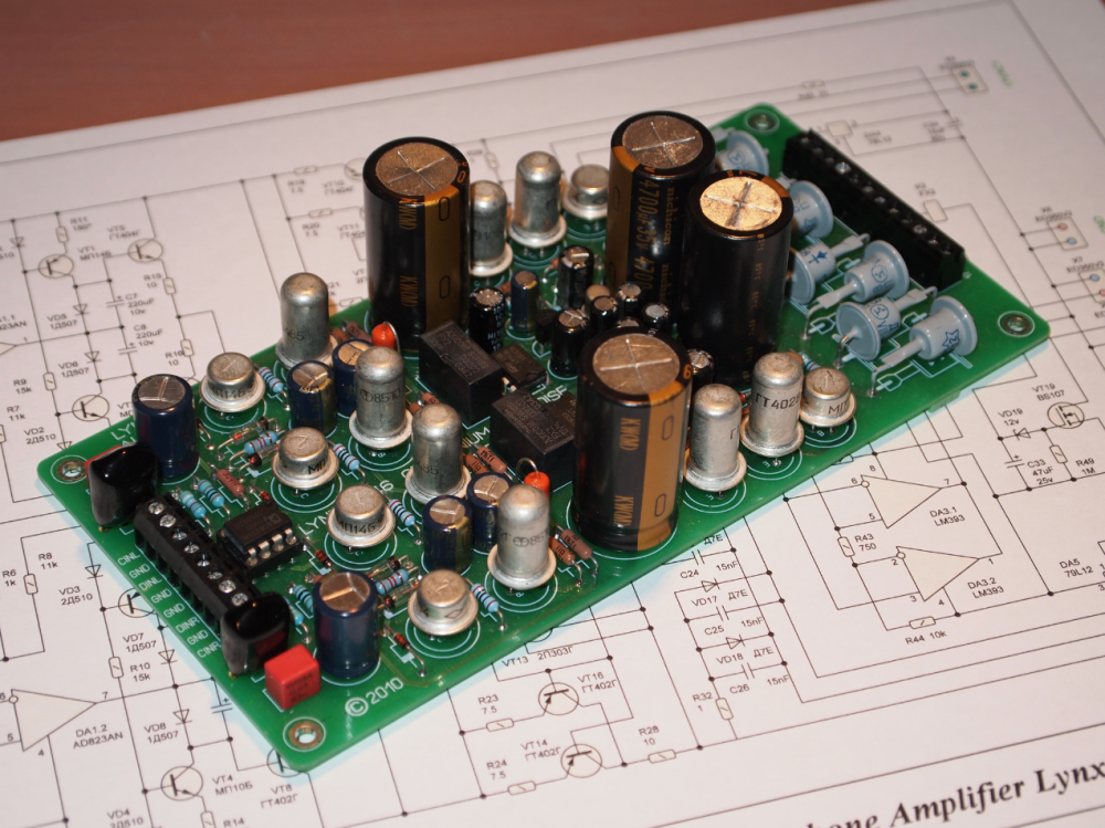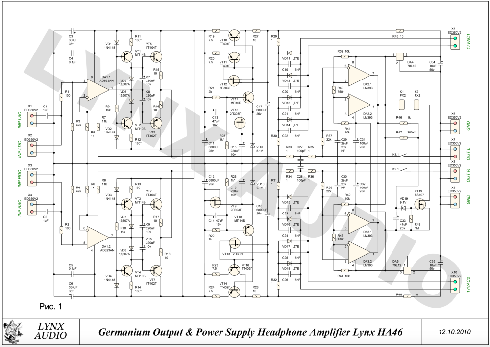 Некоторое время назад успешно повторил усилитель для наушников Lynx HA46. Результат порадовал. Авторскую ПП не заказывал, сделал все в виде отдельных блоков (усилитель+БП+защита) на обычных односторонних платах. Для тех, кто хочет собрать полностью кремниевый вариант, можно перейти в эту тему: https://newaudioportal.com/topic/2721-простой-студийный-усилитель-для-наушников/ Ниже приведу авторское описание и схему. Мне понадобилось только подобрать номиналы резисторов в блоке питания для нужного напряжения и в одном месте заметил перепутанную полярность конденсатора на схеме. Авторское описание: История создания устройства, которому посвящена данная статья, насчитывает уже несколько лет. А началось всё с того, что при разборе старых запасов, я нашел несколько десятков транзисторов ГТ402 и ГТ404, оставшихся еще со школьных лет от периода увлечения конструированием переносных кассетных магнитофонов. Первоначально я хотел их выбросить, но передумал и отдал эти приборы приятелю, вставшему на путь «аудиофилии». Через некоторое время он пригласил меня послушать то, что сделал из этих транзисторов – телефонный усилитель. Схема использовалась очень простая, тоже «из годов нашей молодости» – К237УН2 и пара повторителей МП39+МП40 и ГТ402+ГТ404. Отличия от стандартной схемы, применявшейся в большом количестве радиоприемников в 70...80 годы прошлого века, заключались лишь в дополнительных резисторах между базами и эмиттерами повторителей, что смягчало процесс открывания транзисторов, работавших без начального смещения, и уменьшало искажения типа «ступенька». На удивление, этот усилитель звучал очень неплохо даже при работе на довольно качественные наушники Sennheiser HD 580. Учитывая невысокую стоимость комплектации, такой усилитель вполне мог оказаться удачным решением для работы со многими, в том числе и низкоомными, головными телефонами. Однако, ему были свойственны и многие недостатки. Относительно большой уровень искажений микросхемы К237УН2, работа выходных повторителей в классе В и низкое напряжение питания (+12В), ограниченное свойствами УН2-й, наличие разделительных конденсаторов на входе и выходе усилителя ограничивали потенциальное качество, достижимое для примененных транзисторов. Следует заметить, что германиевые транзисторы ГТ402 и ГТ404 – это довольно линейные приборы, изменение «беты» в диапазоне токов коллектора от 3 до 300мА у них официально нормируется не более, чем в 1.5 раза (уникальный случай для транзисторов советского производства!). Большой допустимый ток коллектора позволяет им успешно работать с низкоомными нагрузками, а весьма высокая для мощных германиевых транзисторов граничная частота в 1МГц определяет и хорошую работу на верхних звуковых частотах. Практически полное отсутствие порогового эффекта для германиевого PN-перехода делает возможным построение работающего в классе B симметричного повторителя на комплиментарных транзисторах с достаточно низкими искажениями по сравнению с аналогичным устройством на кремниевых приборах, но всё-таки, для высококачественного усилителя желательна работа с начальным током покоя. Относительно большой размер корпуса ГТ402/404 способствует хорошему отводу тепла от кристалла, что немаловажно для обеспечения температурной стабильности усилителя. Взяв за основу указанные транзисторы, я решил разраб