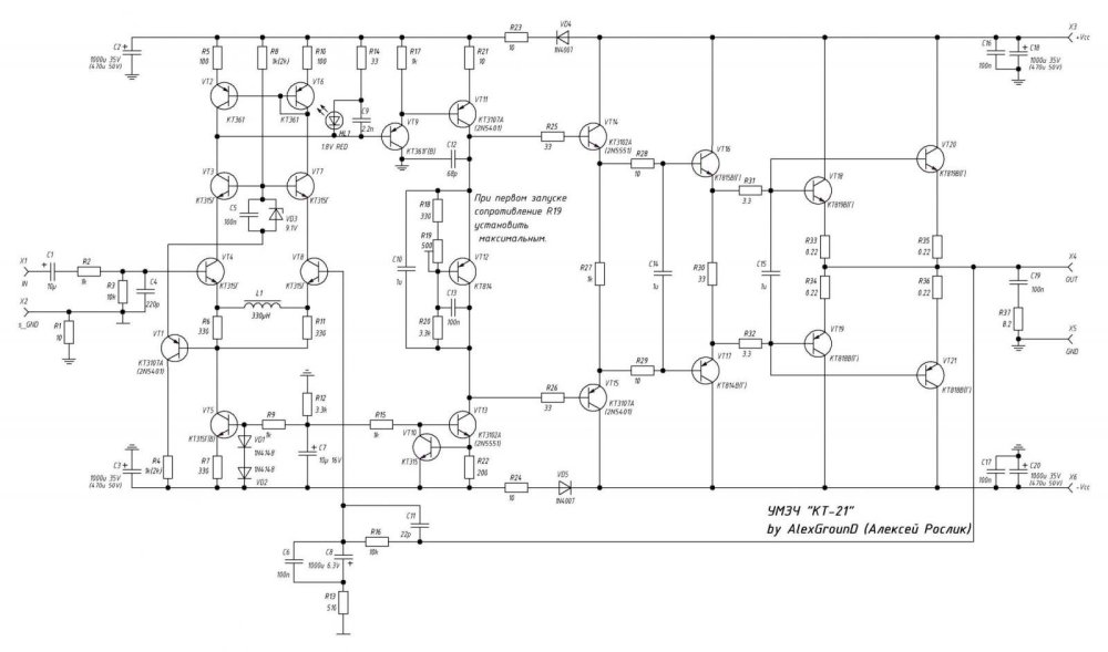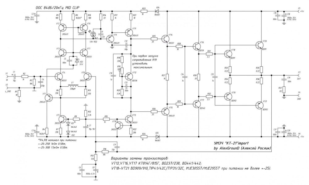 Предлагаю для обсуждения усилитель Алексея Рослика (Alex Ground) КТ-21, который можно собрать как на современных импортных комплектующих, так и на советских транзисторах. Источник: https://cxem.net/sound/amps/amp251.php Технические характеристики За неимением качественного измерительного оборудования, некоторые характеристики будут указаны на основании компьютерного моделирования схемы, они будут отмечены звёздочкой *. Напряжение питания: +-20В...30В; Полоса пропускания -3db: 1.5Гц - 300кГц*; Выходная мощность: 30(80)Вт (При напряжении питания +-20 и +-30В соответственно, на 4Ом); Максимальная скорость нарастания выходного сигнала: 60В/мкС*; Глубина обратной связи: 120дБ/1кГц, 84дБ/20кГц*; Диапазон допустимой нагрузки усилителя: 4 Ом...16 Ом (2 ом при питании не более +-25В); Допустима работа в мостовом включении при нагрузке не менее 4 Ом и питании не более +-25в*. Принципиальная схема: Полное описание: Сверхлинейный УМЗЧ КТ21.pdf Печатные платы: kt21.zip Вариант схемы на советских транзисторах: