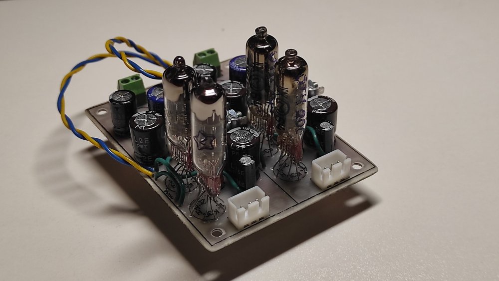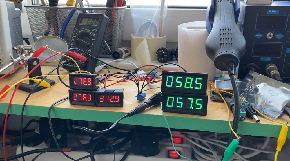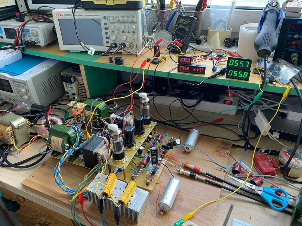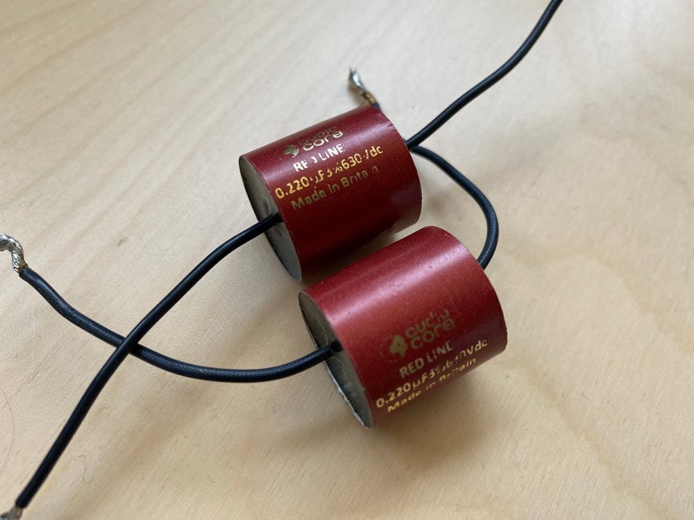 Макет получился настолько основательным, что все еще лежит у меня на столе. Теперь вот думаю какой бы к нему корпус сделать максимально дешевый и простой... Еще закупил на али по распродаже пачку цифровых вольтметров дешевых на разные диапазоны: 0-999 мВ, 0-10В, 0-100В, 0-1000В. Надо будет поприличнее их собрать вместе, но налаживать усилитель с ними очень удобно. Вешаешь по вольтметру в каждую контрольную точку (анодное после моста, анодное по каналам после дросселей, в катоды выходных ламп, в катоды входных). Основной недостаток в общей земле у вольтметра и его источника питания. А так можно собрать себе физическую версию Multisim'а. Еще попробовал поставить конденсаторы ФТ-3 в качестве межкаскадных. С ними очень ровный сбалансированный звук получается. Но у меня по-прежнему фаворитами и по звуку и по габаритам остаются вот такие красные конденсаторы, но все это, конечно, уже субъективно: