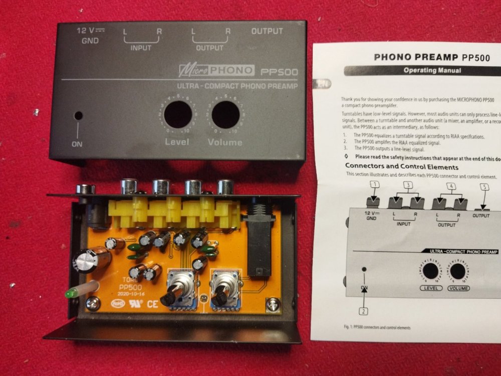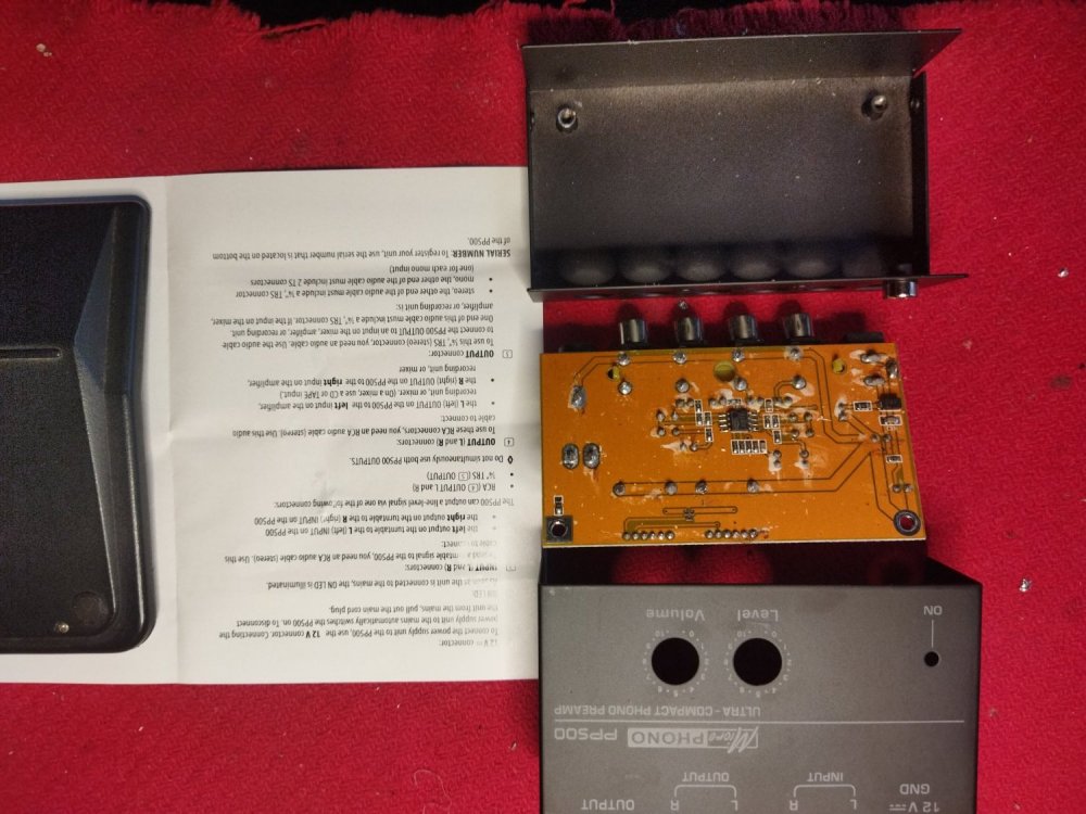Не хочу новую тему открывать из-за малости одной, здесь поделюсь интересным опытом. Купил на Али сей аппарат из любопытства, благо цена смешная и есть информация, что некоторым такое нравится: Включил послушать, играет как-то, но тихо, мой УМ на полной громкости еле дышит, хотя корректоры со стандартным усилением (40 дБ) играют, на средней громкости, очень хорошо. Подал синус 1кГц и 5 мВ rms, на выходе 250 мВ, совпадает с заявленном в паспарту. Прогнал через анти-риаа - завал внизу и слегка завышен верх, меандр показал тоже самое. Конденсаторы в коррекции зелёные майларовые, надо менять, есть печальный опыт применения в пассивной коррекции, и питание надо поднимать, Вольт до 30, заменив электролиты, а то макс входной сигнал на 1 кГц 25 мВ. Операционник в схеме стоИт 4560R. Пока всё... PS - два нижних фото вверх ногами загружаются, извиняюсь, может, модераторы поправят))...