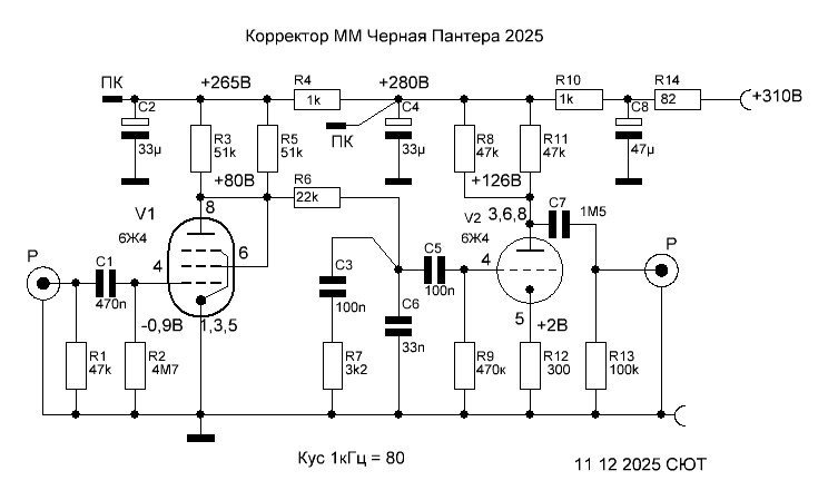 Кстати, о птичках, причёсывая свою коллекцию корректоров, слегка доработал аппарат прошлого года, удалил пару конденсаторов, и он стал абсолютно устойчив, ну и музыкален, схему прилагаю, копирайт тоже: Мадди Уотерс на его Electric Mud просто аки живой))...
