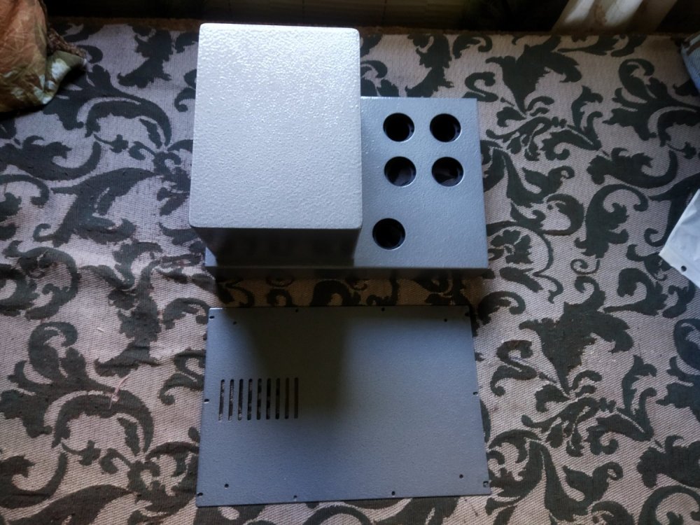Приехал корпус с Озона, серый (приятно удивлён!), надо что-то делать: Просторный, но - блестящий (это - минус, матовый был бы краше, для меня)). То ли лаком покрыт, то ли краска такая... Плюс в том, что никакого запаха! 6П9 залежались в тумбочке, да и кенотроны где-то в сарае - надо "вкручать" паяльник...