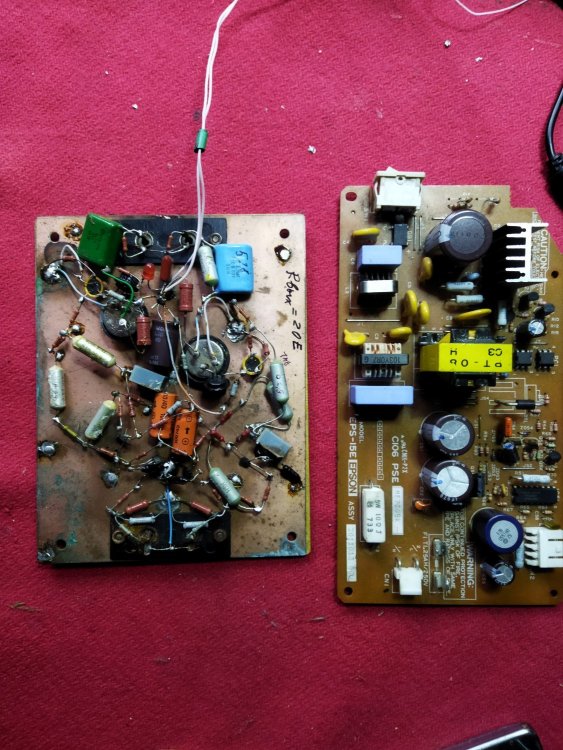 Однажды, от сна восстав, забрёл в свой сарай, пошарить кенотроны для нового проэкта, и набрёл на полуистлевшую коробку из картона, а в ней - свой давний аппаратик, с ИБП от Эпссон: На внешний вид не смотрим, было наводнение три года назад, утки в огороде плавали, и сараю досталось... Включил - работает. Нашёл схему с датой реализации: Далее - МБМ - в помойку, высохли, набрав ёмкости и утечки, проверил меандром - всё в норме: Выкинув полевик в выходном каскаде можно убрать лишнее усиление и избавиться от инверсии сигнала...