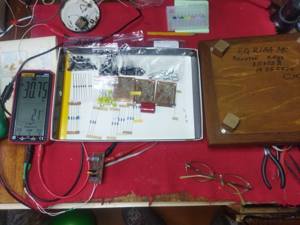 Не хочу новую тему открывать из-за малости одной, здесь поделюсь интересным опытом. Купил на Али сей аппарат из любопытства, благо цена смешная и есть информация, что некоторым такое нравится: Включил послушать, играет как-то, но тихо, мой УМ на полной громкости еле дышит, хотя корректоры со стандартным усилением (40 дБ) играют, на средней громкости, очень хорошо. Подал синус 1кГц и 5 мВ rms, на выходе 250 мВ, совпадает с заявленном в паспарту. Прогнал через анти-риаа - завал внизу и слегка завышен верх, меандр показал тоже самое. Конденсаторы в коррекции зелёные майларовые, надо менять, есть печальный опыт применения в пассивной коррекции, и питание надо поднимать, Вольт до 30, заменив электролиты, а то макс входной сигнал на 1 кГц 25 мВ. Операционник в схеме стоИт 4560R. Пока всё... PS - два нижних фото вверх ногами загружаются, извиняюсь, может, модераторы поправят))...