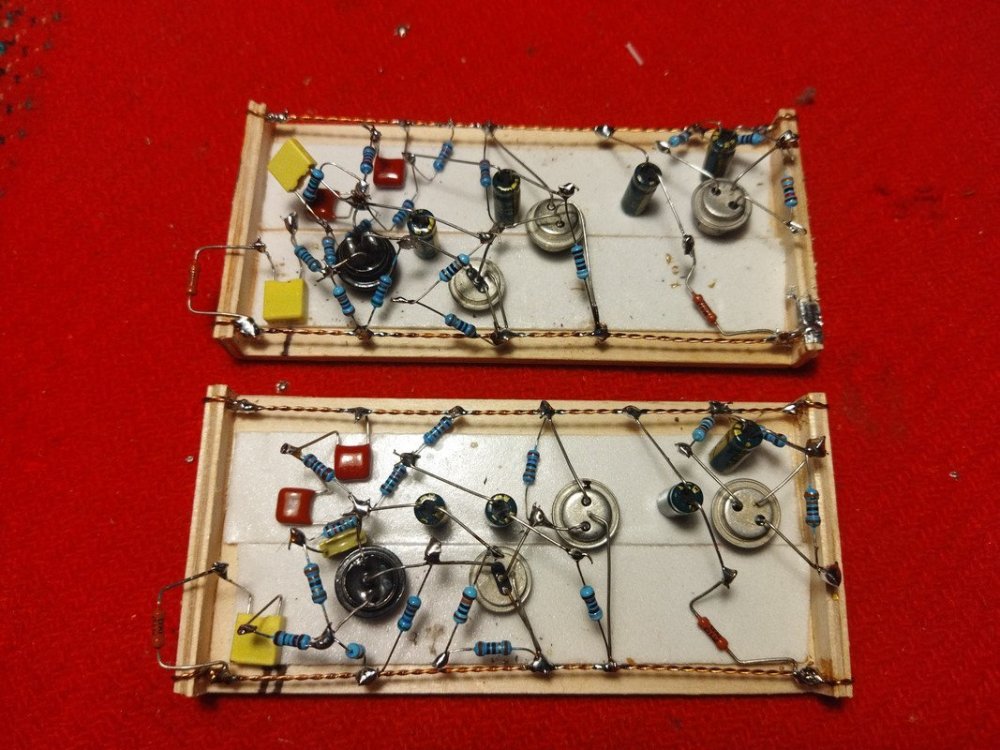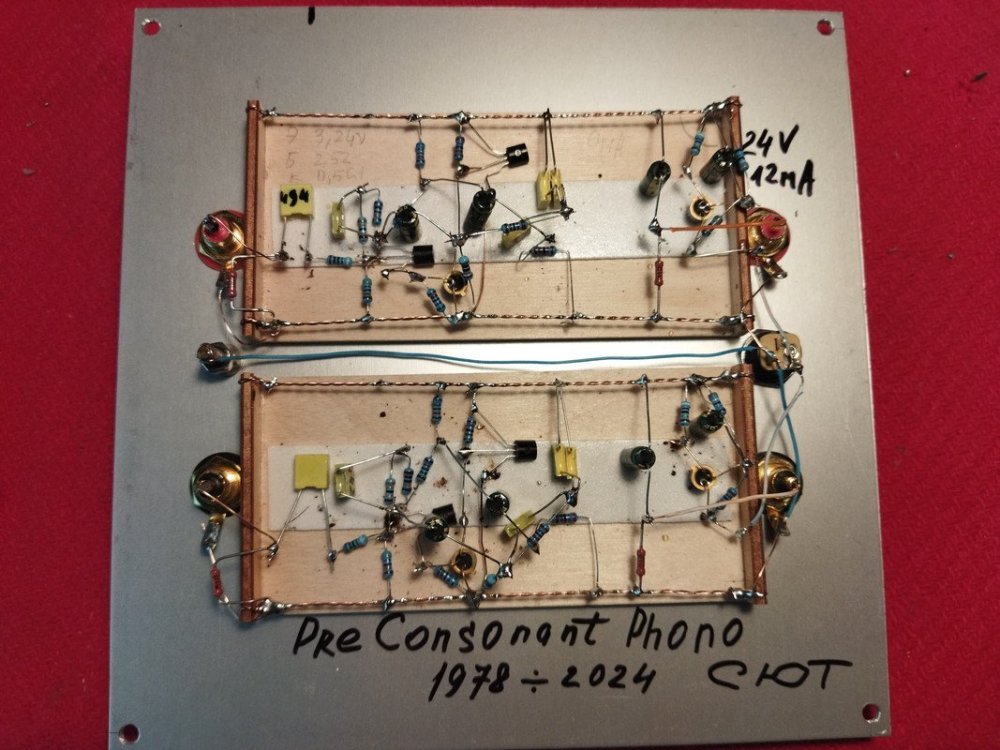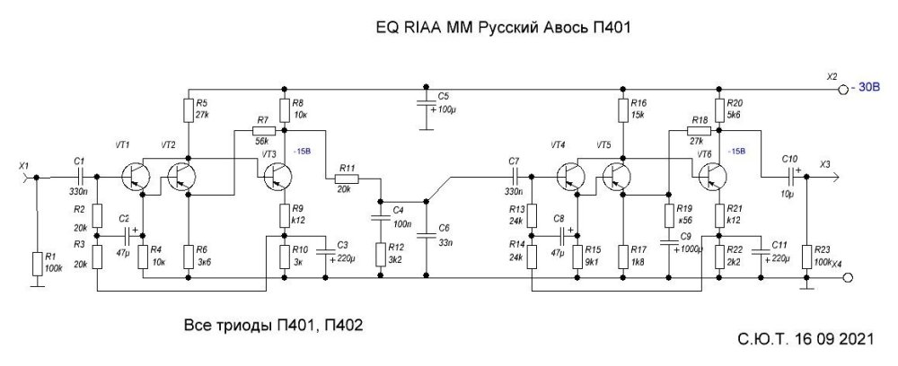 Привет, Александр! Триоды Т1 и Т2 работают в режиме микротоков, всё три триода охвачены глубокой ОС, термостабильность и Ку очень стабильные и не зависят от напряжения питания. Каскад на полевиках становится термостабильным при обеспечении физического контакта корпусов триодов (верхнего и нижнего). Хотя для комнатной температуры это не актуально, в сарае сейчас никто не живёт))... Для тех, кто не дружит с русским языком, повторяю - Ку моих корреторов стараюсь поддерживать близким к стандарту. Чувствительность можно рассчитать арифметически. Кг не измеряю, достаточно осциллографического контроля, шум моих корректоров ниже шума пустой канавки на виниле, что считаю достаточным и т.д. Кривая RIAA выверяется на меандре с цепочкой антириаа на входе корра. Точка.