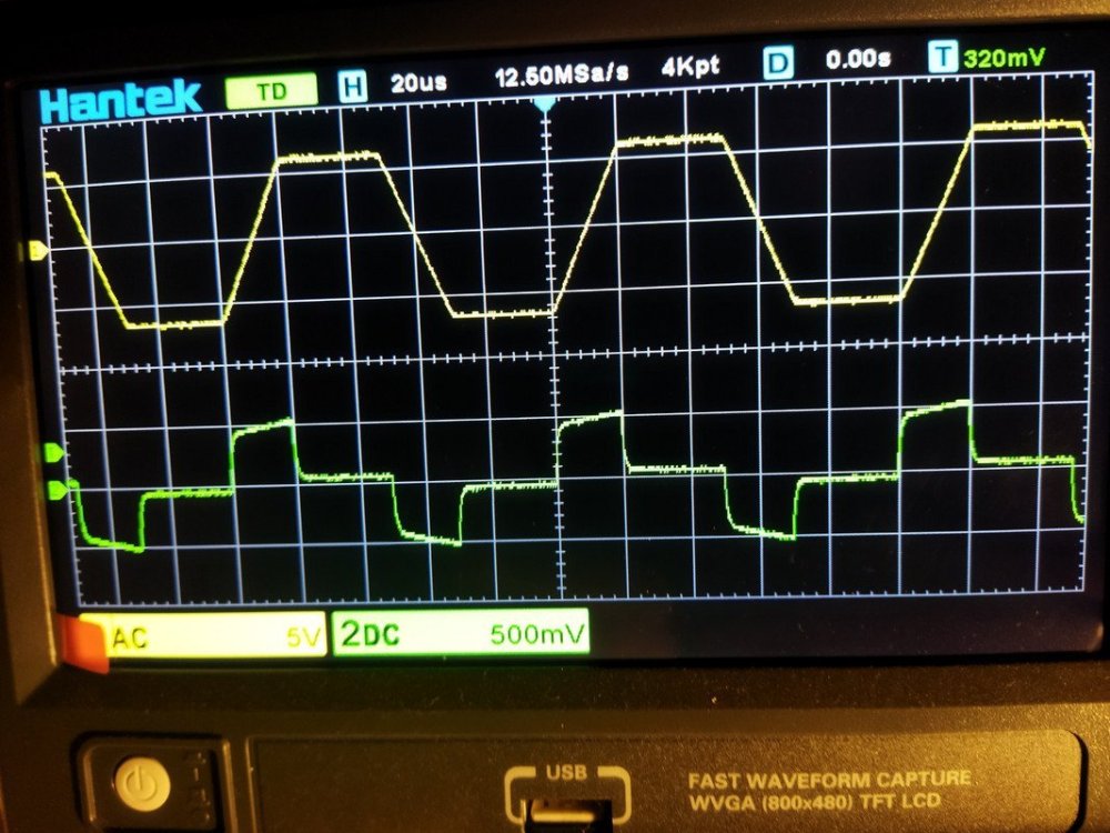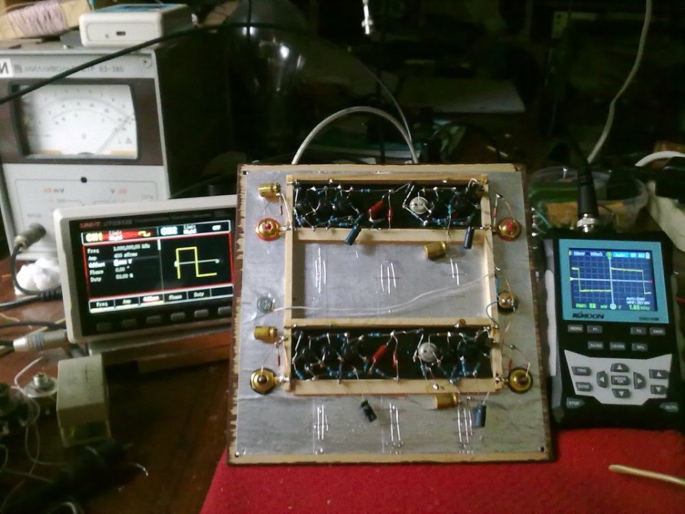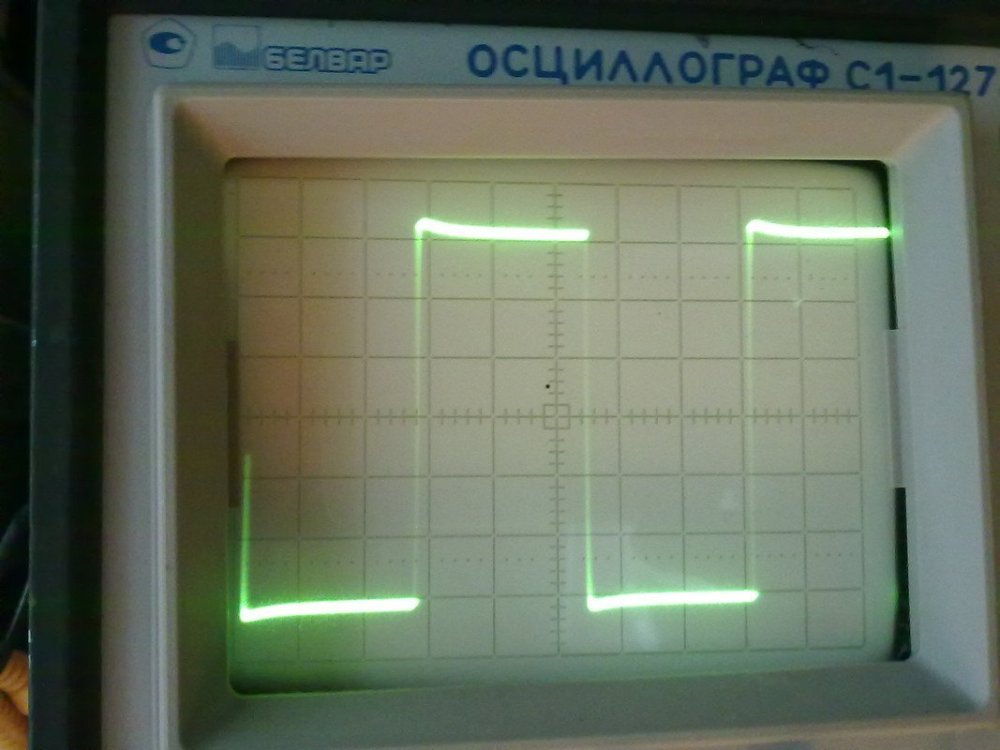 Ещё один удачный гибрид, на отечественных кристаллических триодах. Осцилограмммы показывают форму меандра, получившуюся из иголок на входе, которые образовались после цепочки антириаа (меандр 0,5В в клетке, иголки 0,2В на клетку). В этом году режимы полевиков были отредактированы (нижняя схема):