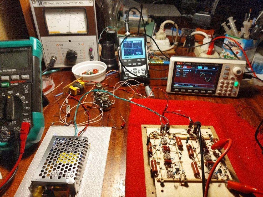 22. Заменил детали коррекции, снял кардиограмму, и послушал на фон и шум - с открытым входом фона ноль и только лёгкий шумок, на полной громкости. Звук тоже впечатляет! Пусть остынут пайки... Усиление 188 на 1 кГц, 45 дБ. Можно уменьшить, заменив резистор в аноде пентода на 51 кОм одним ударом паяльника - пока не стану, пусть разыграется: