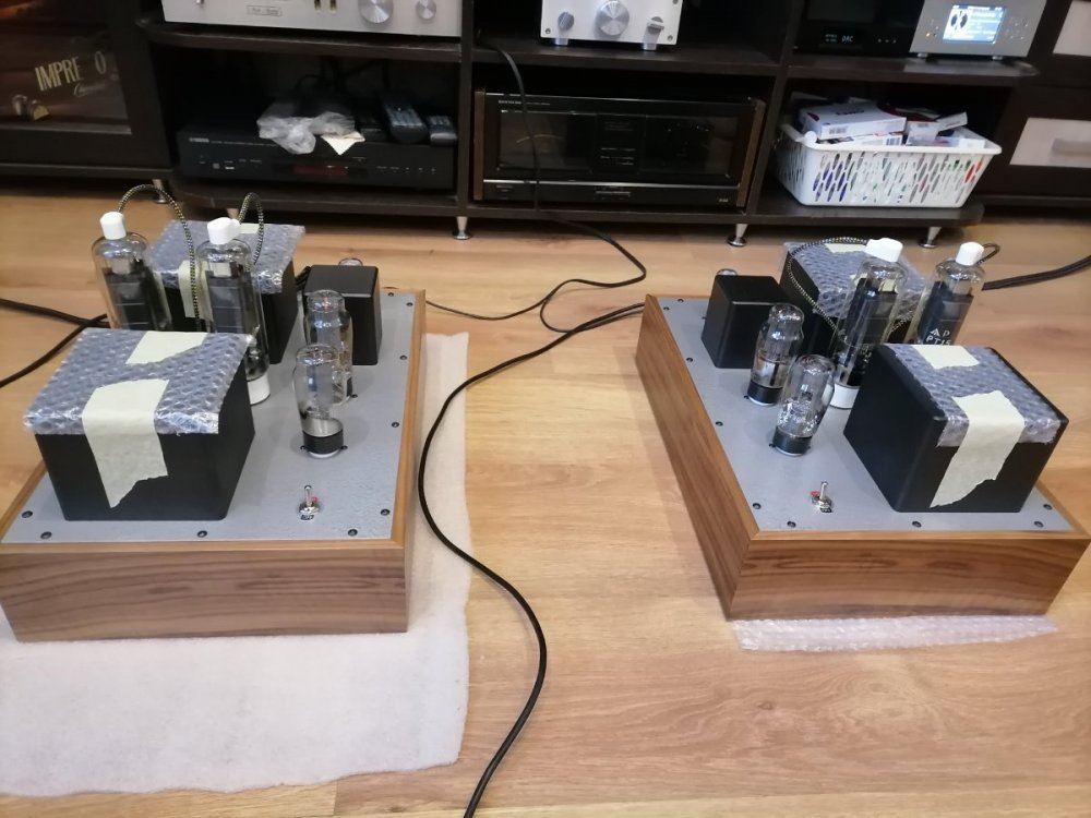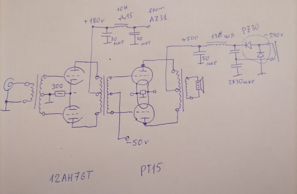 Довелось на кануне 21/22 сотворить РР моноблоки на пентодах РТ15 в триодном включении. Два каскада. Входной каскад - многократно мною проверенный балансный на 12АН7GT с трансформатором в анодах и ФИ трансиком на входе. Его питание - ДППВ на кенотроне AZ31. Выходной каскад на паре пентодов в триодном включении. Смещение фиксированное. - 50в. Балансировка по плечам не предусмотрена, т. к. выходной трансформатор имеет зазор, допускающий разницу токов плеч до 12ма. Анодное +500в. Сформировано удвоением на кенотроне PZ30 (все в даташите на эту лампу). Конденсаторы в анодных цепях - СВВ61.