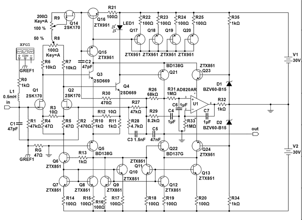 Ну да, симметричная All-Fet топология с квадратным вторым каскадом с ООС. Ничего необычного. Я-же в ответ покажу свой вариант однокаскадной топологии без ООС: prAmp1.pdf