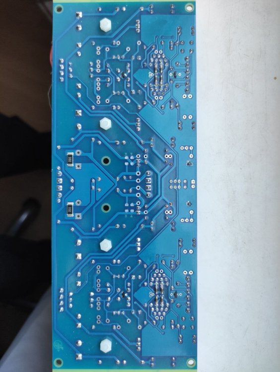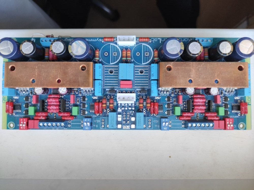 "Вычурность схемотехники" оправдана минимально необходимым количеством элементов. Эта безООС-ная топология симулирует 0,003% искажений, Вы много других примеров видели транзисторных без ООС? В железе сделал три версии, одна без выходного буфера и интегратора и две на данных платах, та что на фото- с не запаянным стабом, он там внешний параллельного типа, а не на LT317A-LT337A как на плате