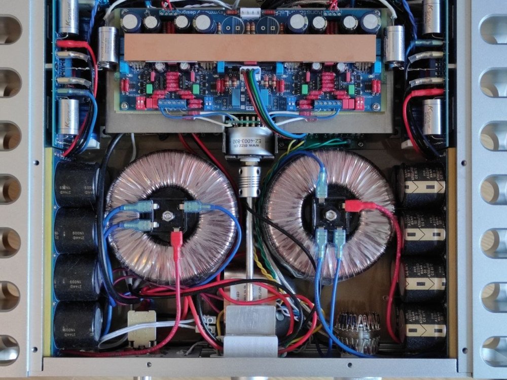 Ну в этом и есть суть моего изобретения! Я выложил модель в симуляторе, уберите обратную связь по току нагрузки и получится обычный классический А-класс, а у меня ток покоя удваивается в момент максимальной загрузки а мощность утраивается! Эти "чудеса" подтвердились в железе! Этим и объясняются небольшие размеры этого "железа"! А теперь подробно: Q4,Q5,Q6,Q7 это разновидность токового зеркала Уилсона где Q4 это повторитель для тока баз Q5-Q6, а Q7-я заменил на J-fet по сравнению с классической схемой, этот транзистор нужно подобрать по Ugs=0V. Q9 - обычная токовая нагрузка для латерала Q10, но его ток пропорционален току нагрузки за счёт подключения R22 к R23-R24 и это в свою очередь приводит к модуляции напряжения на истоковом R18, который задаёт режим по току покоя. А RP3 определяет оперативную величину этого тока. R15, R16 является делителем ООС по переменному току, а за счёт R14-C7 создаётся 100% ООС по постоянному что даёт возможность питать усилитель двухполярным источником без ухода постоянки за пределы единиц mV. C15, C14 не являются нужными для схемы, но без них происходит генерация на частоте порядка 70mHz в пределах 100mV непосредственно между параллельно включенными выходными транзисторами. Происходит это только в том случае если резисторы R23...R28 не сделаны по технологии Теслы и имеют витки намотки! Происходит их взаимодействие между собой, я решил их не менять на безиндуктивные, а зашунтировать советской зелёной керамикой непосредственно между ногами транзисторов снизу платы. Вроде всё объяснил, спрашивайте что непонятно!