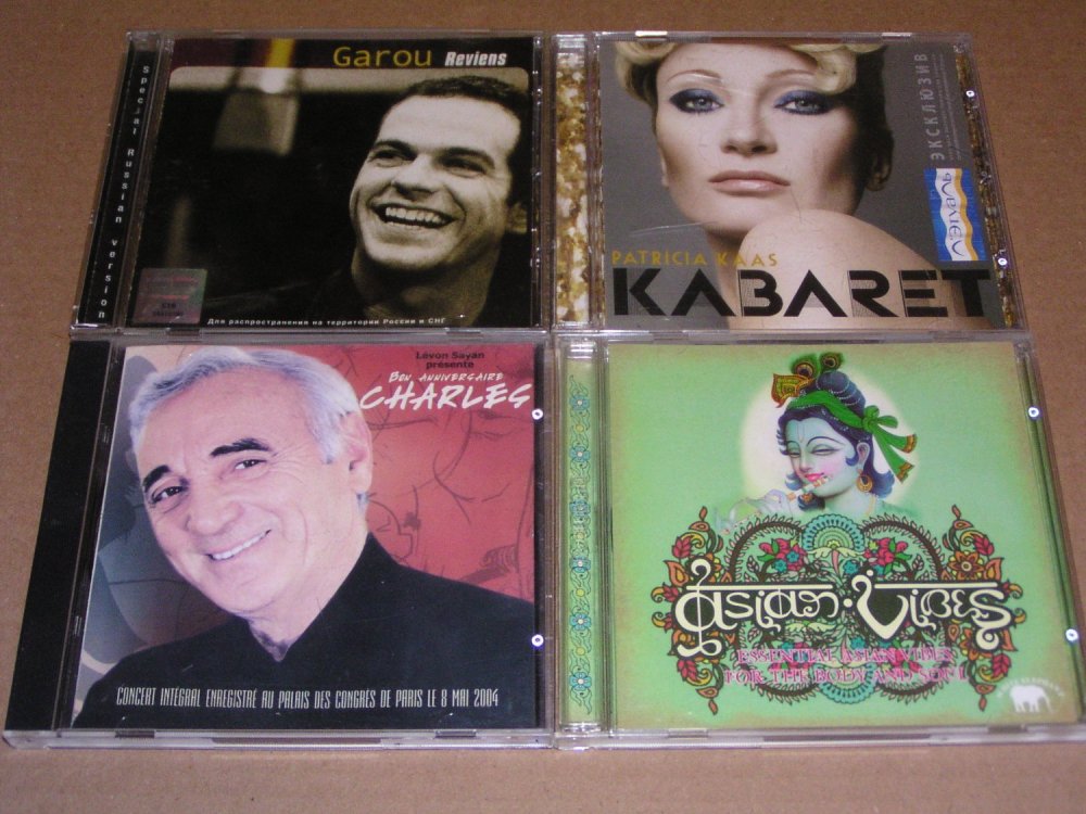 Лот 3. Забугорное. Цена 500 руб. 1. Garou. Reviens. 2, P.Kaas. Kabaret. 3. Bon anniversaire CHARLES (AZNAVOUR). Концерт в парижском Palais des Congrès (8 мая 2004). Российская лицензия. 4. Asian vibes. Essential asian vibes for the body and soul. 2CD -