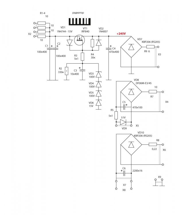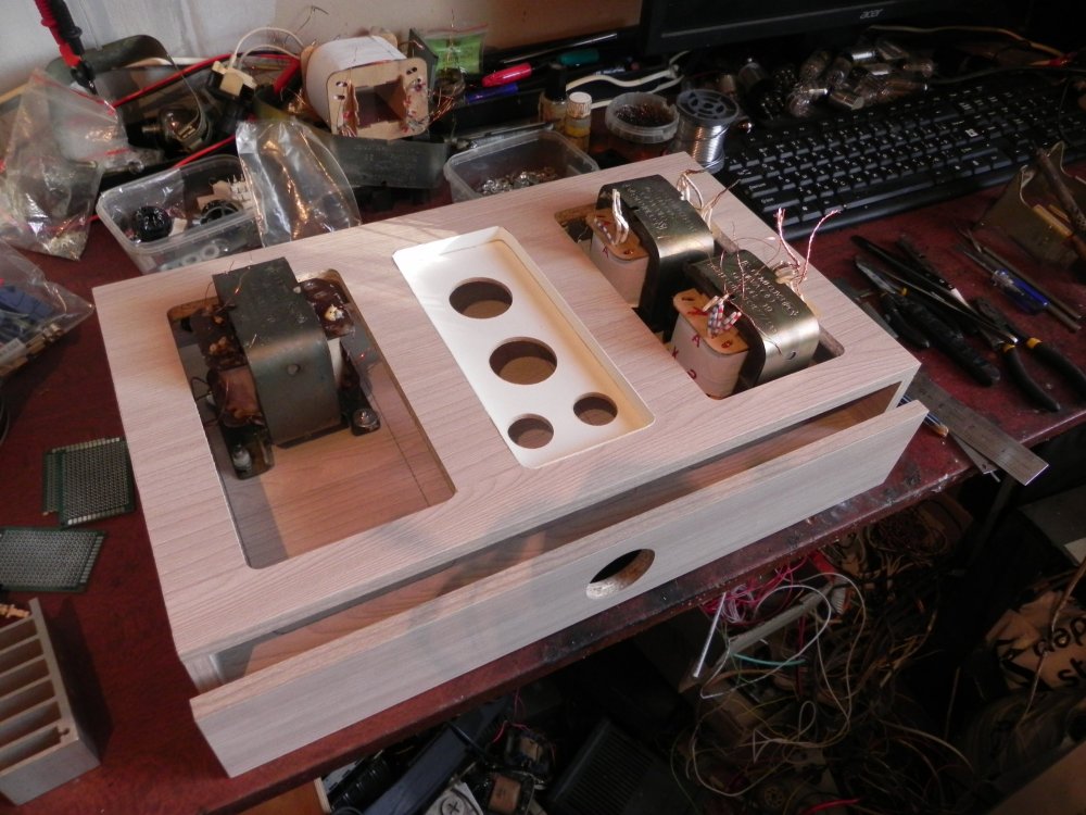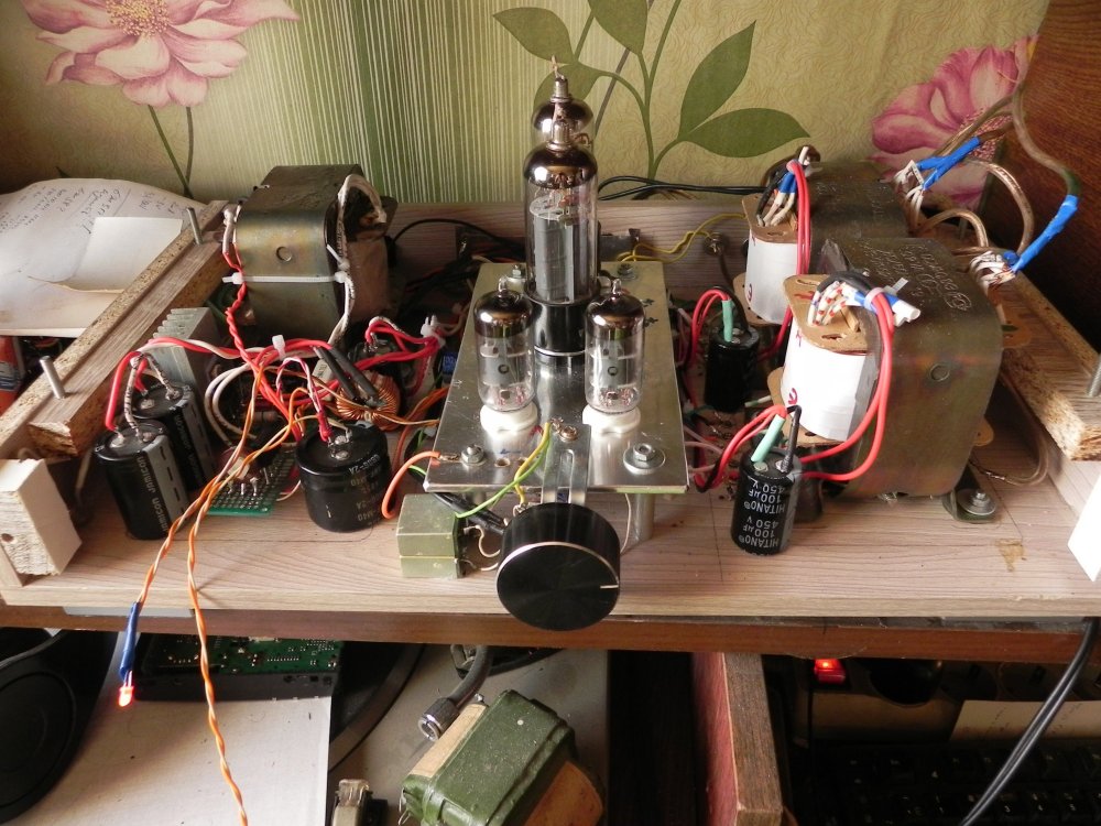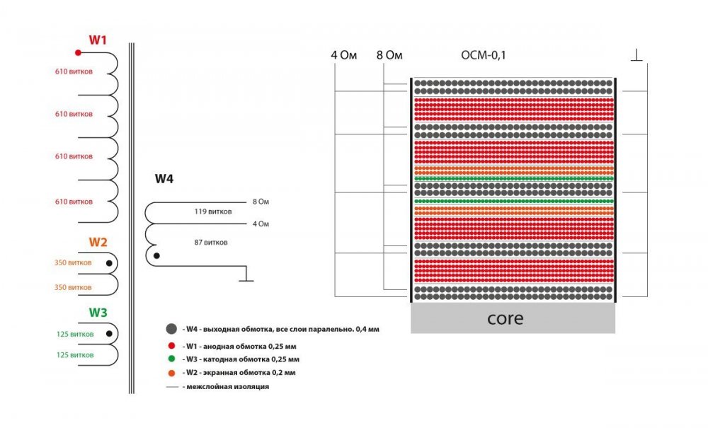 Нарисованной схемы силового транс-ра не. Данные такие: Сердечник на базе ОСМ1- 0,1, сечением 10 см2 Первичная обмотка: 620 витков проводом 0,4 мм. Питание анодных цепей: 672 витка проводом 0,28 мм. Обмотка для смещения: 98 витков проводом 0,2 мм. Обмотка питания накала драйверной лампы: 17 витков проводом 0,88 мм. Две обмотки питания накала выходных ламп: 18 витков проводом 0,88 мм. Все обмотки мотаются с межобмоточными слоями изоляцией 0,1 мм. Это как раз доступный вариант железа ТВЗ. Есть на многих рынках. А облегчил намотку убрав межслойную изоляцию. Общая индукция анодной +катодной обмоток составляет 35 Гн. (по отдельности 24 Гн и 0,39 Гн.)