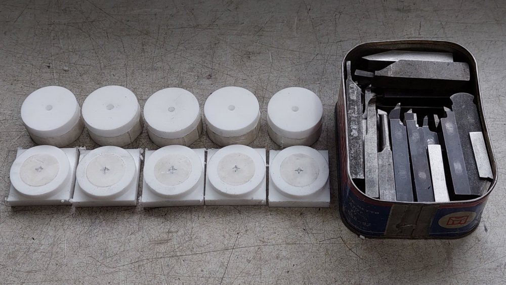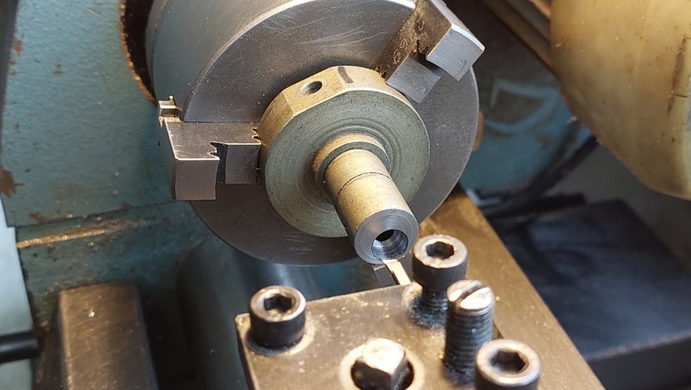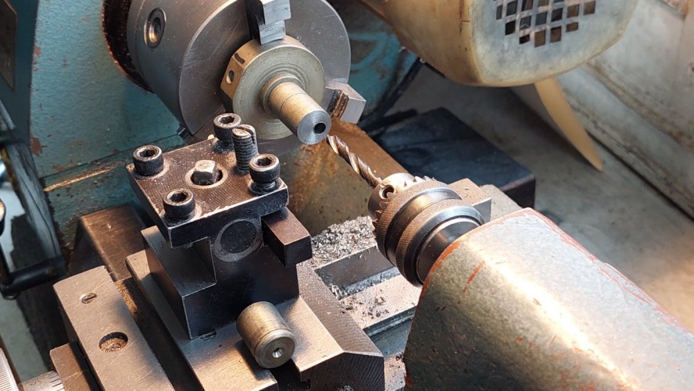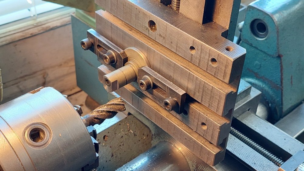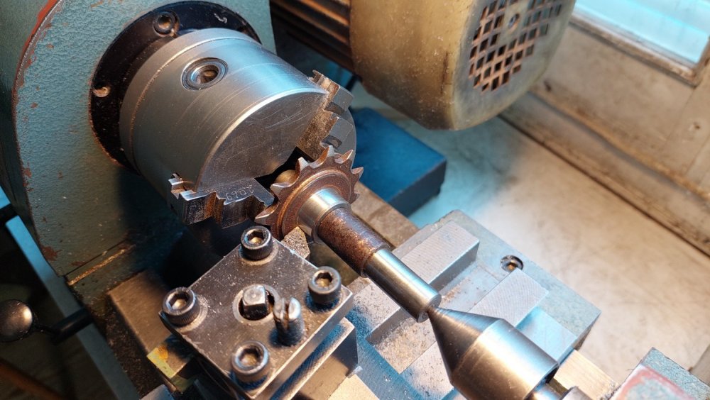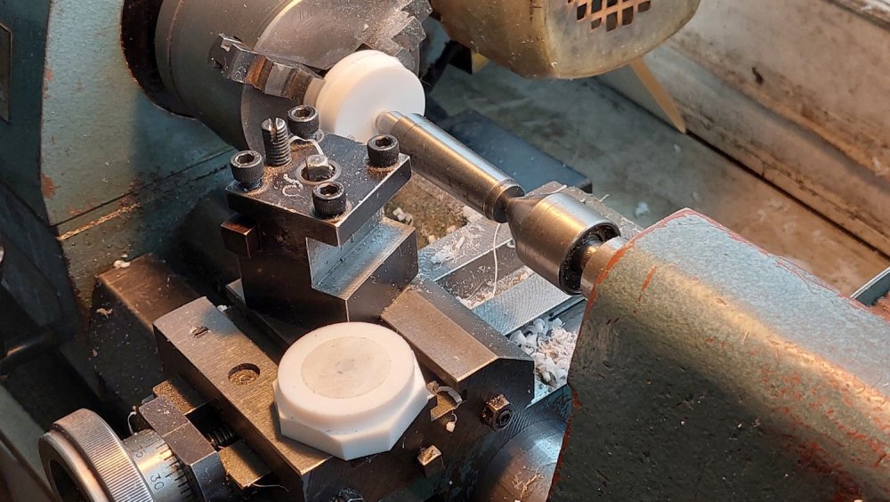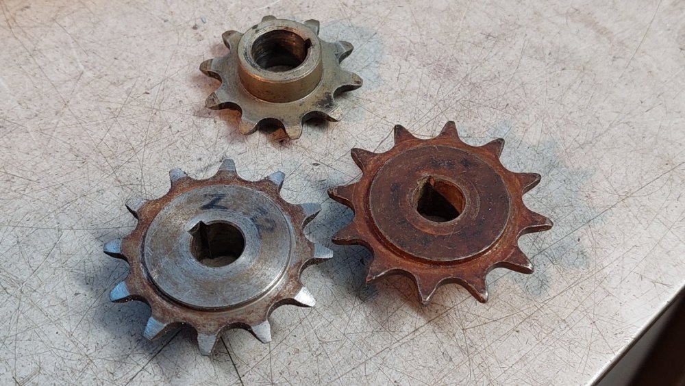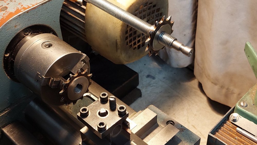 Продолжил работу... - выточил упорные подшипники из фторопласта, - довел размеры звездочек привода, - нарезал в них ходовую резьбу, - изготовил эксцентриковый натяжитель приводной цепи, - пробил шестигранное отверстие под приводной вал в латунной заготовке (ее запрессовка в ведомую звездочку будет с небольшой конусностью 1:50/1:100).