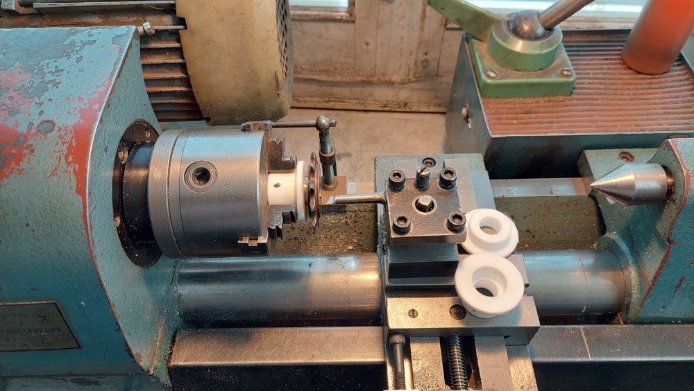 У нас с Вами несколько разные требования к работе подшипника скольжения. В моем случае "текучесть" фторопласта (в определенных пределах) и появляющийся зазор полагаю пойдет на пользу. В данной конструкции даже теоретически не возможно; - обеспечить параллельность четырех винтовых стоек, - точную соосность основания и подъемной платформы, для изготовления всего этого, было использовано довольно примитивное оборудование. Изначально зазоры; - платформа/фторопластовая втулка или - втулка/звездочка даже планировались, либо установка/фиксация подшипника по месту... так и не определился с решением. Прослабить, сделать зазор, всегда можно позже. Полагаю недостаточная жесткость системы и неизбежные зазоры, будут достаточны для нормальной работы. Текучесть фторопласта также сильно зависит от скорости вращения вала и нагрузки. Ранее я обрабатывал на своем станке стяжки основания диаметром 16мм и длинной около метра, укорачивал исходные заготовки, протачивал посадку, нарезал резьбу М10. В шпиндель передней бабки они не проходили, пришлось разобрать заднею бабку и установить фторопластовый подшипник. На больших оборотах подшипник грелся, снизил - пошло нормально, все обработал, зазоры не появились, еще и в будущем возможно послужит. На фото... проточил на конус 1:100; звездочку и латунную вставку, немного притер и с нагревом запрессовал.