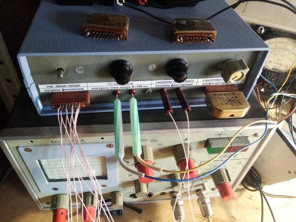 Схемы векторного индикатора для регулировки лазерных головок после замены лазера. 1. - структурная схема. 2. - схема шести канального усилителя для работы с матрицей фотодиодов 3.- коммутатор и усилители для управления катушкой фокуса актуатора 4. - распайка разЪема конфигуратора, цепи питания лазера и опционально подключение стрелочных приборов. остальное - схемы распайки конфигураторов. Конфигураторы - это разЪем затычка, в котором с помощью перемычек и резисторов создано соединение для выбора различных режимов работы прибора. 1 -й конфигуратор позволяет увидеть функцию фокуса (A+C)-(B+D) и отклик фотодиодов E и F (трекинга рад. слежения). 2 -й конфигуратор позволяет независимо увидеть токи фотодиодов в четырех квадрантах координатной плоскости. 3 -й конфигуратор позволяет увидеть функцию фокуса (A-D)-(B-C)/