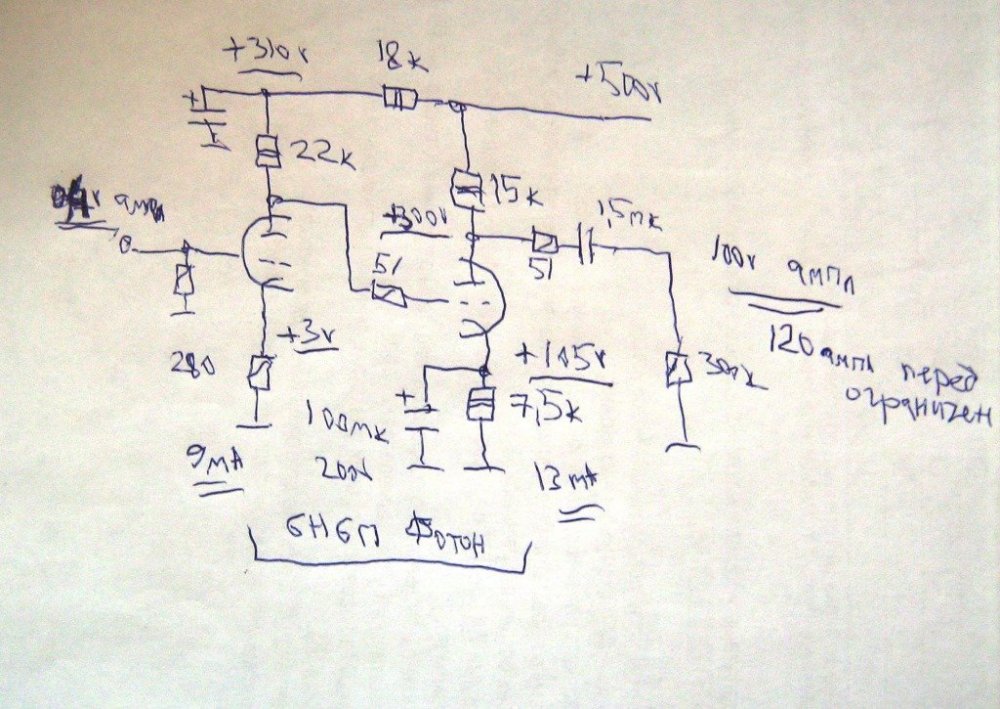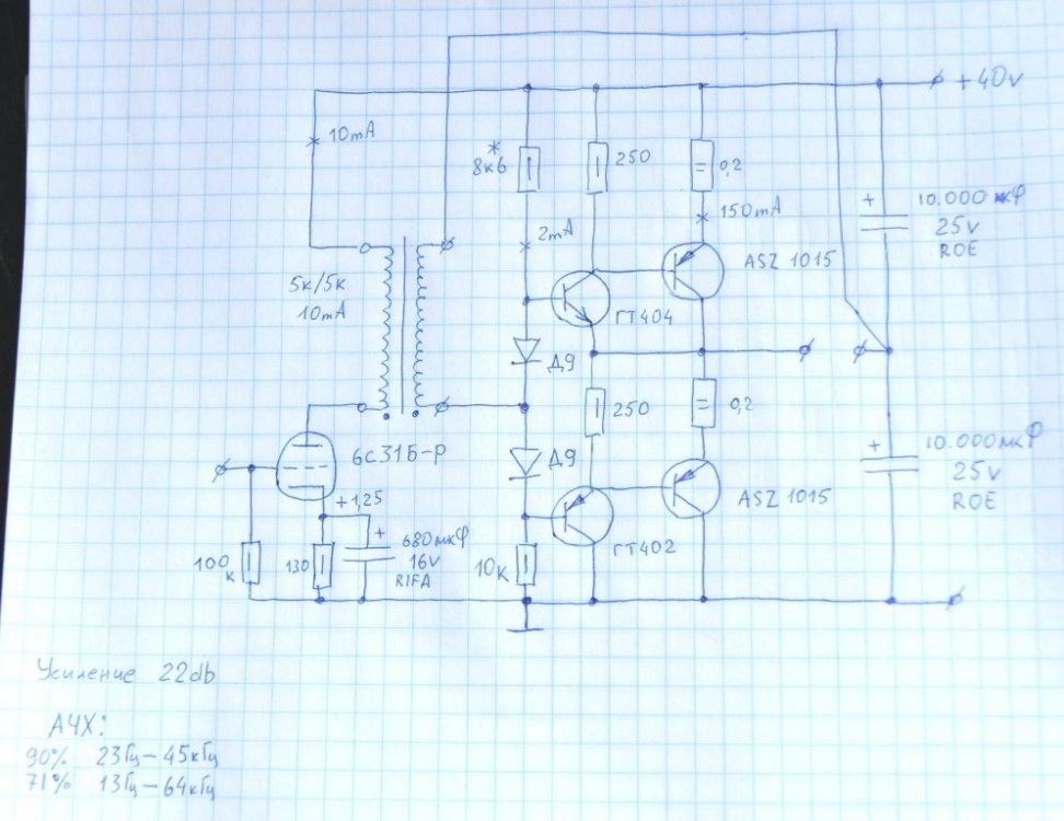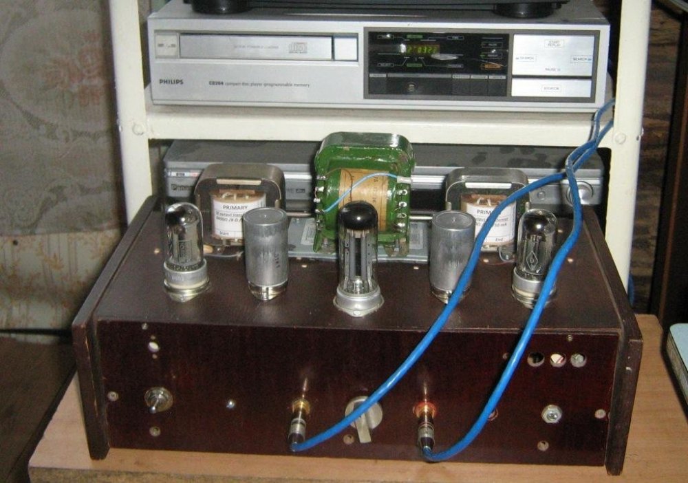 Последние ТВЗ мотал Дмитрий Симонов от Маяка, Снежети Ш19*33, К=27,5. Сделаны так же, питание с началом обмотки. Усь все тот же лофтин на 4п1л. Катод 4л1п через 3*1к МЛТ-2, всего 3к, 6вт, и 30мкф*450в К78-17 на +пит, включен "ULTRAPATH"-конденсатором. Кен тоже прямонакальный и локтальный AZ21, итого 5 развязанных накалов. Целью было уйти от 2п1п, она хорошо, но мало. 2ж27л в триоде, мю=20, само то. Но не просто... да и лофтин надо оставить. В итоге все срослось, выдавил из 4п1л ровный синус амплитудой 4,5в, что есть 1,2вт на 8ом, это как раз мах для 4п1л. 2ж27л тоже близко к пределу, ток 4ма. Чувств. 0,7в, то что доктор прописал. ПС: до сих пор схемы единой так и нет, года три... ПС2: главное - поёт, и классно. ПС3: корпус от Одиссея 001, че только не делал с 2005г