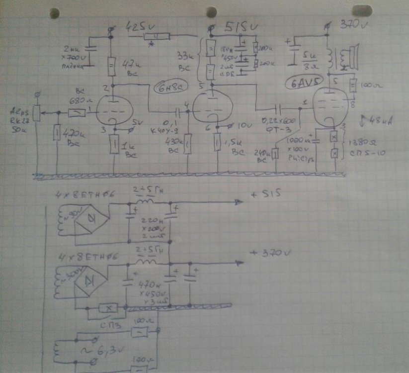 Питаю 6с4с постоянкой много лет, накал ТОРики Василия Карта, ~6,3 в-4 диода д304-10.000мкф-проволочн. с5-17в 0,39ома 0,5вт-10.000мкф. д304 просто потому, что с германием =6,3 в как раз, а Шоттки и кремний не хватает, вот и все. -