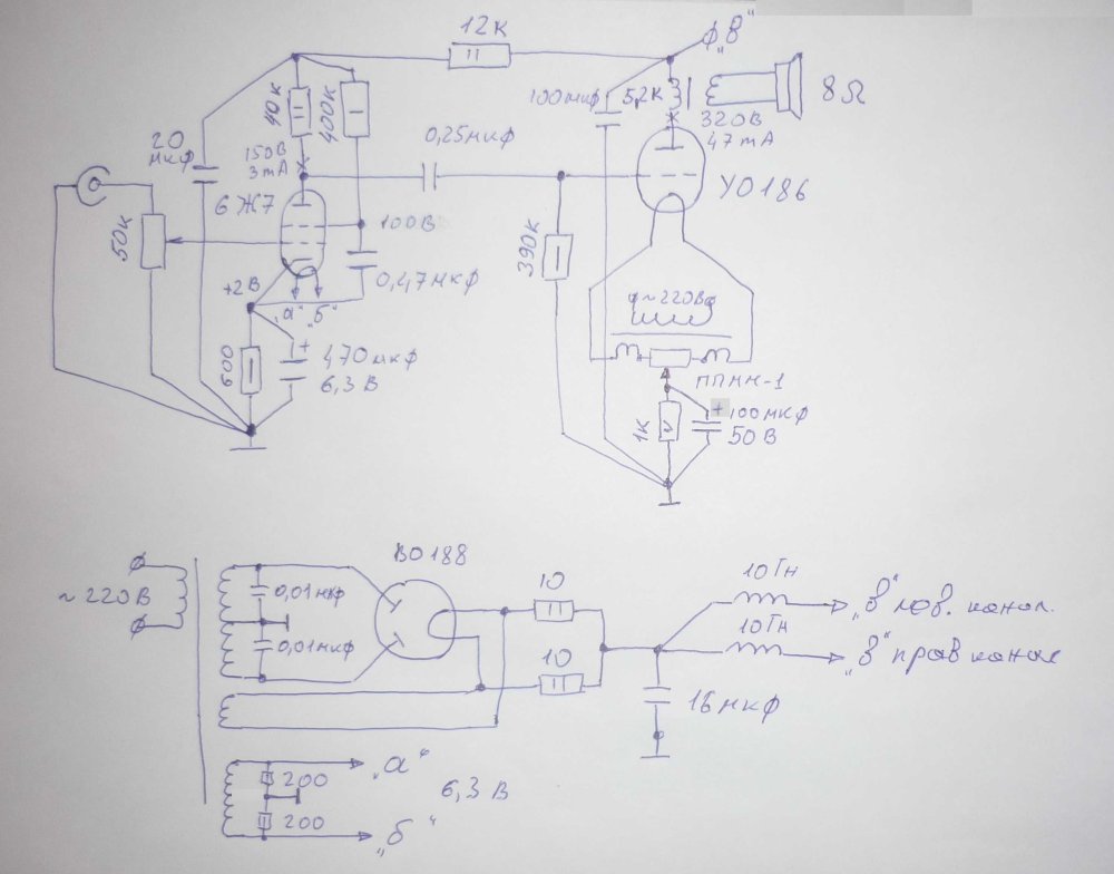 1. Давно драйвер на триодах, почти по Бруски, 6sn7/6н8с с Еа=500в