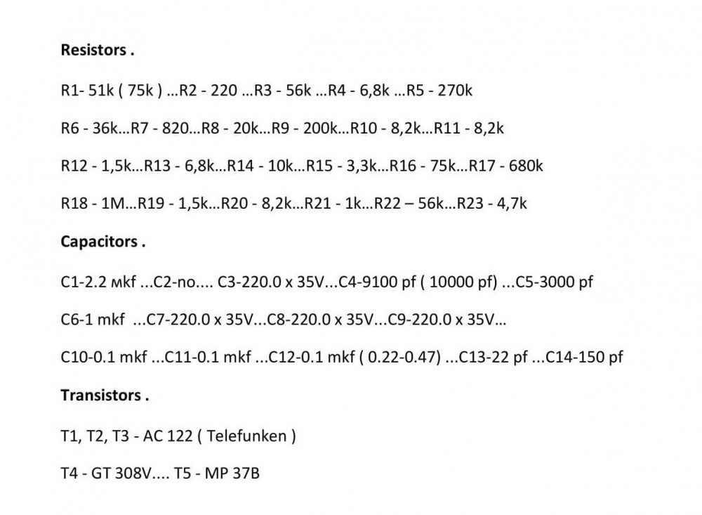 Собирал клон этой схемы для себя ( пару лет назад ) . С небольшими переделками - другие транзисторы ( АС-122 , ГТ-308 , МП-37 ) , изменил номиналы рокот-фильтра , и применил аккумуляторы для питания . Звук этой схемы очень хороший .