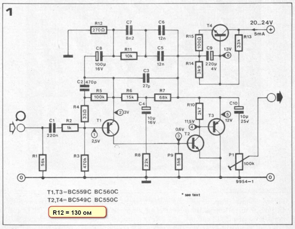 4. Простой корректор на транзисторах из журнала Электор . В исходной схеме - усиление 32 дб /1кГц . Уменьшение номинала R12 позволяет увеличить усиление . Звук хороший , дважды изготавливал такой корректор - на кремнии , и на германии . Нравятся оба варианта . Elektor 1978-07_08.pdf