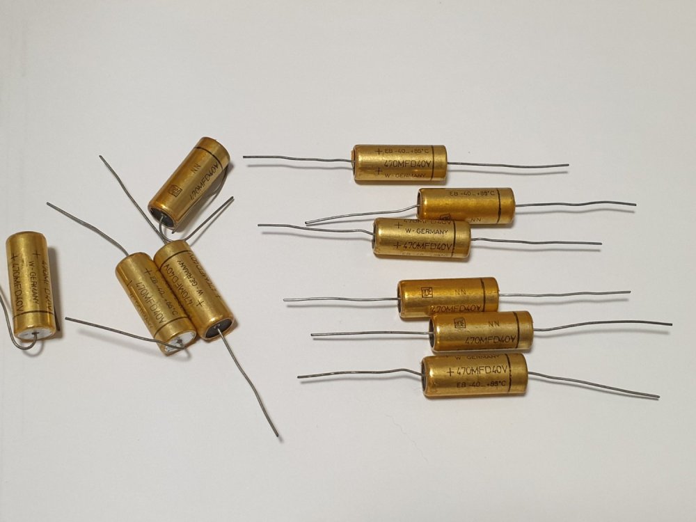 Также есть ROE GOLD 470 мкФ 40 В - 7000 ч 85°C осевой Технические характеристики: - Производитель: ROE (Vishay Roederstein) - Серия: EB - Обозначение производителя: EB 00HD347G00B - Тип: Электролитический конденсатор - 40 В - номинальное значение 470 мкФ - Номинальный допуск: от -10% до +50% ...( по состоянию на сентябрь 2024 г.): +7,5%! - 7000 часов выдержки при 85°C! - 200 000 часов при 40°C! - Г x Д 12 x 25 мм - осевые соединения Сделаны в Германии. Цена 500 руб. шт Всего 40шт.