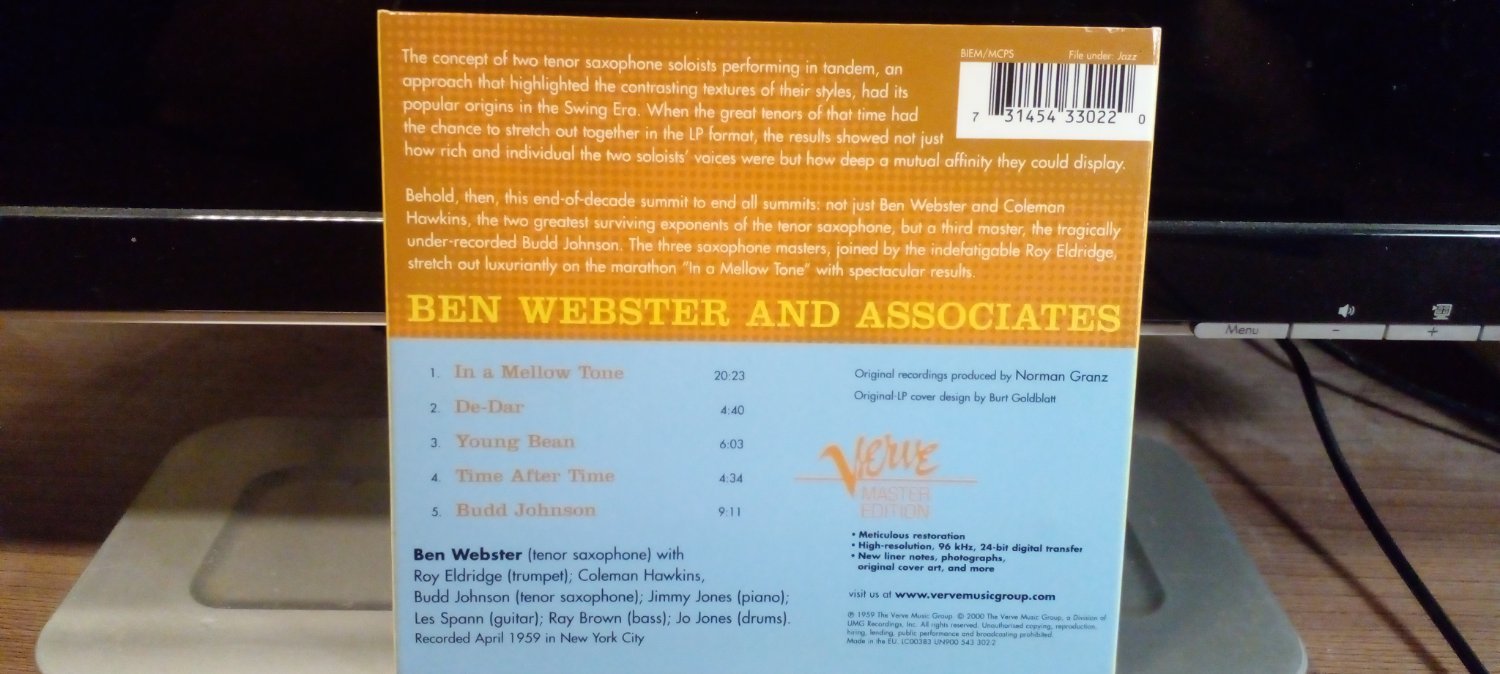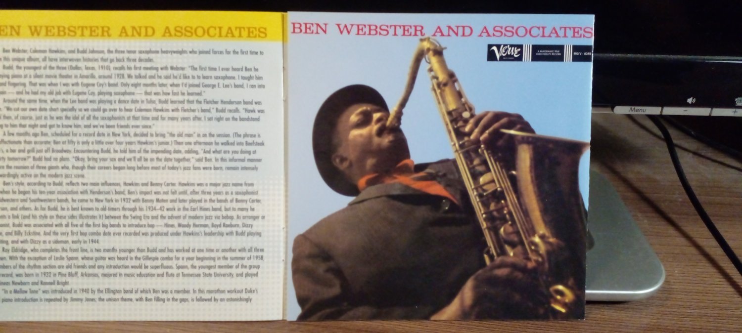 Трудно представить академический американский джаз середины прошлого века без Бена Уэбстера. С кем только не играл этот выдающийся саксофонист, просто перечислить невозможно. Но наиболее знаковые работы, с моей т.з.,это игра Бена с бэндом Герцога (Дюк Эллингтон). Несмотря на присутствие в бэнде таких махров-саксофонистов, как Пол Гонзалвес, Джонни Ходжес, Гарри Кэрни, Коулмен Хокинс, Уэбстер стоял от них обособленно, т.е. его игра моментально, с первых аккордов выделялась своей необычностью, в плане прочтения музыкального материала. Рассказать словами это явление невозможно, конечно, нужно слушать и слушать на хорошей ламповой аппаратуре. Диск записан Норманом Гранцем, талантливым звукорежем на фирме Верве.
