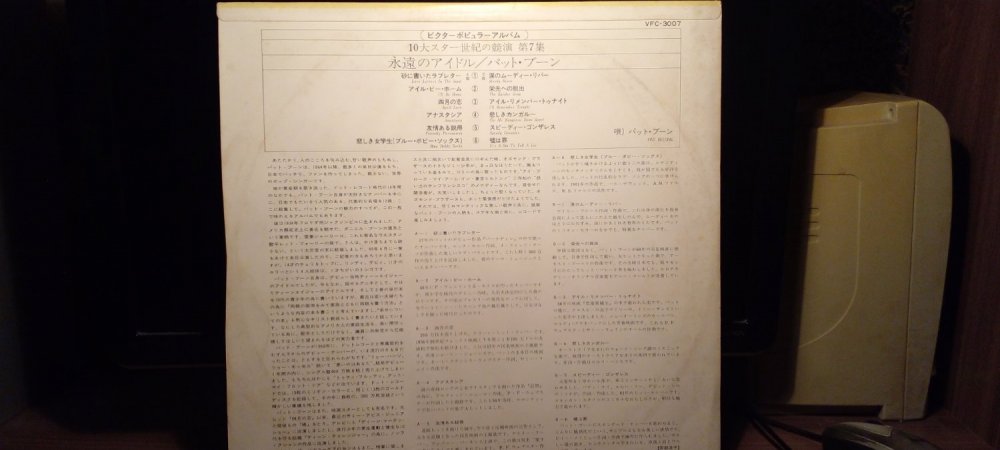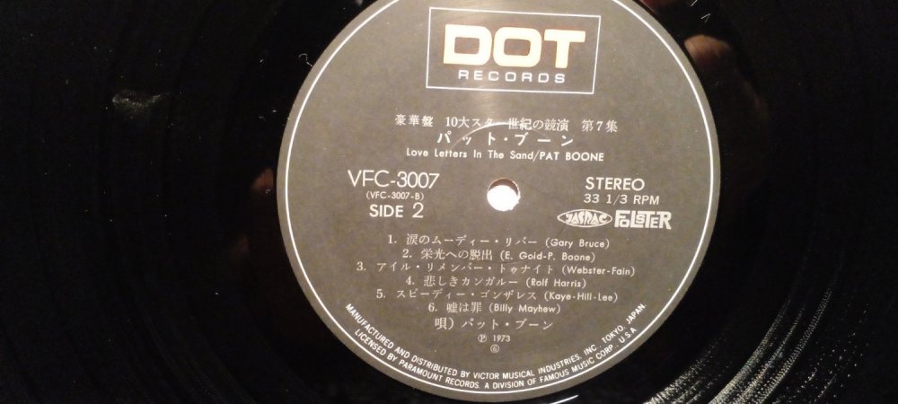 Пэт Бун 1973 года, номерной диск, сделан в Японии по американской лицензии от фирмы Дот. Для указанного года, состояние диска просто великолепное. Диск примечателен, в моём понимании, очень шикарной композицией Speedy Gonzales, знаменитой в те годы, переписываемой любителями -меломанами, с магнитофона на магнитофон, да и на рентгеновской плёнке, помнится, попадалась мне эта вещуга на скорости 78. -