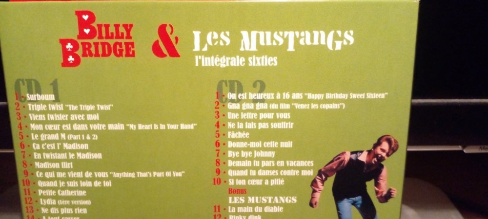 Залез по стремянке на стеллажи с винилом и компактами, да и застрял там на пол-дня, даже кофе в термосочке с собой прихватил. Перелопатил несколько сотен винилов и компактов, уже и не помню что там есть, да нашёл вот этот двойной альбом Билли Бриджа, французского рок-певца, времён Джонни Халлидея . Нужно сказать, что влияние Халлидея очень сильно сказывается на звучании, но слушается приятно, не навязчиво. Голос Билли Бриджа мягкий, весёлый, я бы сказал -летний, радостный. Стиль музыки-твист, рок-н-ролл, всё поётся на французском языке. Конечно, до Джонни Халлидея ему как пешком до Луны, но слушается клёво, во всяком случае не так, как вся эта современная шняга. -