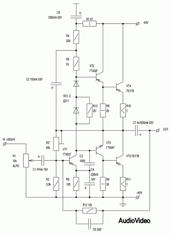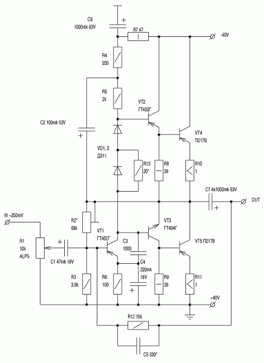 У него ещё стоваттник германиевый есть на П210, собирал его - валит адово, но корпус надо огромный, чтобы ОСМ-0,4 влез с отдельными обмотками питания на каждый канал, общую нельзя - генерит. Это стало для меня неприятным сюрпризом, так как собирал в корпусе сотого трансляционника, а там 250 силовик, когда собрал стерео (с общей обмоткой питания, хотя в инструкции от Жана было использовать отдельные - видно он на эти грабли наступал, но в статье не указал), трабла и вылезла. Теперь жду, когда подвернется тор 0,4 - может тогда без замены корпуса обойдется. Вот схема его, кстати