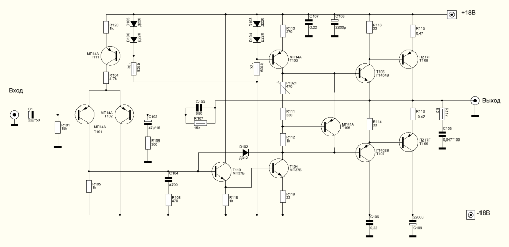 Собрал макет. Не пыхнуло синим пламенем, но и не стабилизирует - на входе 22В, на выходе 21,5... Неплохо бы карту напряжений на элементах и как производится подстройка значения выходного напряжения? Стабилитроны работают - на VD105, 106 примерно по 6,5В, на VD109, 110 - 15В относительно общего провода. Защиту пробовать не стал)