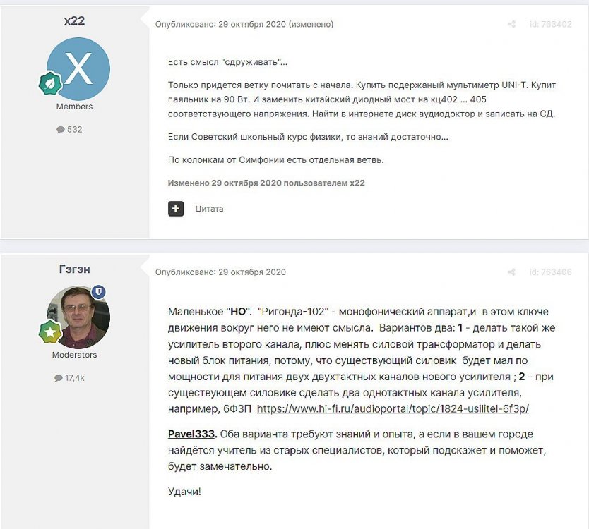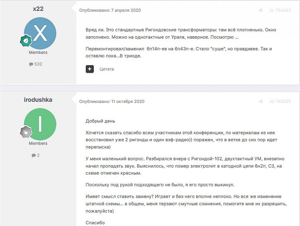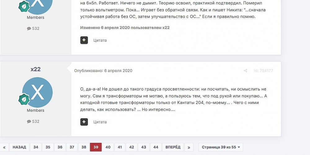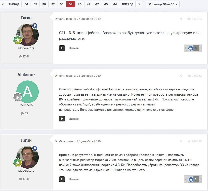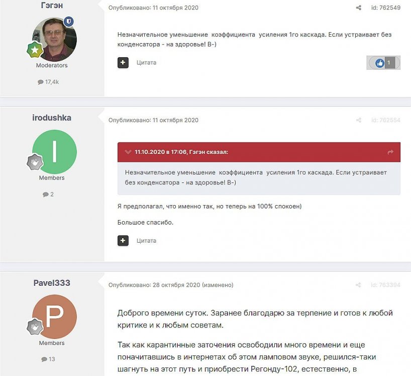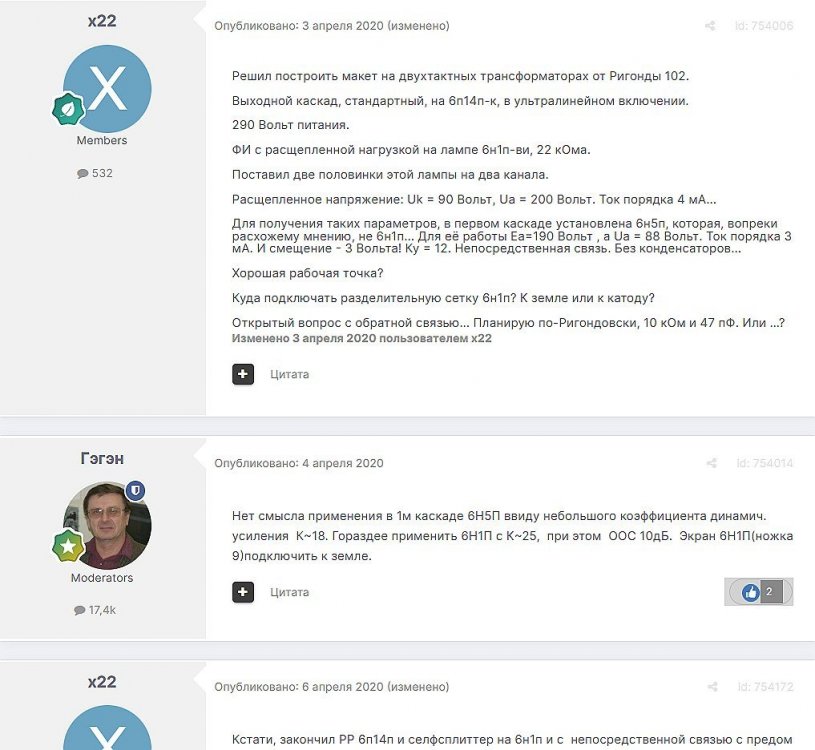 9. uriy Опубликовано: 15 апреля (изменено) доброго дня... собрал данный усилитель SE на два канала..в место ТБ делители .всё работает но .. есть вопрос по напряжениям в катодах и анодах преда... если смотреть на схему ..то там напряжения указаны ровно на оборот чем у меня ведь в катоде первого каскада 2к7 а в катоде второго 3к3 и 6к8 FB идёт через обмотку на землю...дают 2к2 так ? или я что то накосячил... или в схеме неправильно указано? _________________________________________________________________________________________________________________________________________________________________________ Гэгэн Опубликовано: 15 апреля В вашей схеме всё нормально, напряжения - тоже. При одинаковых Ra=220k, в катодах стоят сопротивления разных номиналов, во втором катоде - суммарное меньше; значит напряжение смещения должно быть меньше, ток через лампу немного больше и напряжение на аноде лампы будет меньше. При условии, что разброс характеристик половин лампы невелик. Аттач. uriy2 Опубликовано: 15 апреля Спасибо x22 Опубликовано: 16 апреля (изменено) Добрый день! В радиоприемниках индикаторы позволяли точнее настроить аппапрат на принимаемую радиостанцию. Какая цель размещения этих индикаторов в Вашем усилителе? Какие акустические системы используются? Гэгэн s Опубликовано: 16 апреля "Цель" обыкновенная, мыргалки-моргушки для "услады глаз". В- x22 Опубликовано: 16 апреля (изменено) Так-то оно так, да ведь по "схеме" видно, что автор применил усилитель для звукового сопровождения видео. Одним глазом смотришь видео, а другим, - индикаторы. Если сидишь в полумраке и музыку слушаешь, изумрудные переливы индикаторов скрашивают одиночество: как танцующие девушки. Возможно ... А здесь смотришь видео и индикаторы одновременно. Глаза разбегаются. Может предусмотрен какой-то отключатель индикаторов? Или специальные колпачки на лампы-индикаторы, как на голову ловчему соколу? Нет! Должен быть смысл! Какой? uriy2 Опубликовано: 26 апреля (изменено) Анатолий Иосифович Здравствуйте, вопрос такой- можно ли запитать вот таких две схемы драйвера для 6е1п от поднятия потенциала накала +22в но с дополнительной фильтрацией сколько по току сожрут две платы не знаю...не грамотный я...мож х22 знает он грамотный очень Изменено 26 апреля пользователем uriy2 ошибся Гэгэн Опубликовано: 26 апреля Эта схема управления при напряжении питания 18В, по току ориентировочно около 3,5-4 мА, две платы примерно 8мА. Т.е. схема BIAS их не "потянет" x22 Опубликовано: 26 апреля (изменено) Ах! Uriy2! Вот всё-то Вы додумываете, да придумываете! Мой вопрос был простой: "Не мешают ли эти индикаторы просмотру видео? Ведь они находятся в поле зрения!" В аудио я сам их хочу поставить: музыку слушаю ушами и смотрю на индикаторы глазами. А здесь, - видео! iarick Опубликовано: 13 июля Добрый день, прошу прощения если подобные вопросы уже задавались, но когда я последний раз смотрел эту ветку было 8 страниц.... сейчас 47... Отсмотреть все не реально по времени... Суть: Собираю 2х такт (6н2п+6п14п) на ТВЗ от Ригонды и не могу его нормально настроить. Вопросы: 1. Подскажите "классические" книжки по ламповой технике (в частности усилителям) которые можно прочитать в отпуске для удаления пробелов в понимании темы.... 2.У меня с БП на ТВЗ идет порядка 330в, на Анод 6п14п (относительно катода) порядка 317в... Не много? Лампа выдержит? Сразу оговорюсь, что токи лам пока не понятны (усь не настроен), предварительные попытки настройки попадали в диапазон 25-30 милиА