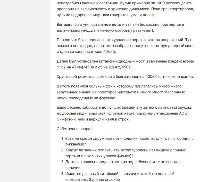 10. Красота страшная сила! Президент на силовом трансформаторе, монтаж мала куча или куча мала. Серый конденсатор справа ЛСМ . Видно "мастера" по соплям. ../../../../uploads/emoticons/gigi.gif.d726b6b808557ca13d4240570ca5821e.gif _______________________________________________________________________________________________________________________________________________________________________________ 1 uriy2 Опубликовано: 8 февраля я привык делать красиво и не из чего попало по возможности лазерная резка ...заводские платы и тд .. файлы делаю сам но собирал я только гитарные усилители что немного другое .. и поэтому вопросы по обвесу лампы были ну а обсуждать звук Ригонды не собираюсь как и Fender champ также напримерна guitarpleer ru сколько ушей столько и мнений и больше вопросов по Ригонде не имею общую температуру по данному форуму понял ________________________________________________________________________________________________________________________________________________________________________________
