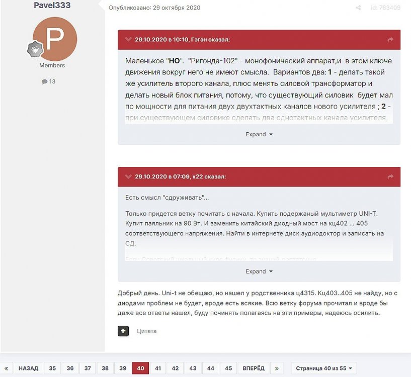 11. Единственное в катоде и аноде 6н9с стоят переменники и в катоде 6п6с тоже для подстроики режимов для работы с 6Ф6С, 6п6с, 6п3с, пока работает с 6п6с. На вторую сетку 6п6с будет галетник с переключением пентод-триод-УЛ-псевдотриод. Сразу скажу ТВЗ Ригонды не расчитан под эти лампы и ничего приличного там можно не ждать. Впрочем если интересно скрины ачх и кни будут после отстроики. Позже ооос подберем и выключатель он/офф ооос. Сейчас до искажения 1,5 ватта и 6 ватт максимальной на 8 ом, при 0,8в на входе. Анодный ток 50 мА (больше не советую твз входит в насыщение, да и по его проводу придел) напруга анода 303 в. Бп на кенотроне 5Ц4С, фильтры LC. Бареттр в накале 6н9с, просто была лишняя панелька и тс в накал 6,7 вольт давал. _____________________________________________________________________________________________________________________________________________________________________ uriy2 а вот ещё хочу спросить про отличие некоторых номиналов в разных редакциях схем по какой лучше собрать ? как в 1966 г ? ________________________________________________________________________________________________________________________________________________________________________