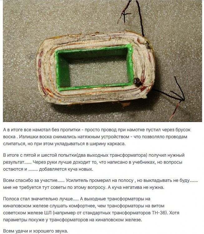 4. Трансформаторы установил. И запустил. В принципе , чего желал -получил. Тут стояли выходные трансформаторы из готовленные из одного кинаповского дросселя для накалов ламп - (у кинаповского дросселя провод в навал, диаметр провода 0,505 мм по лаку, индуктивность маленькая и для анодного напряжения не подходит). В принципе был доволен, когда сделал первоначальные выходные трансформаторы из дроссельного железа. Потом были ещё несколько выходных трансформаторов из таких же дросселей, с таким же количеством витков, но с другим секционированием..... Начал делать секционирование по приведённой картинке из учебника. Здесь, которые стояли были сделаны по схеме - правый столбец, вторая сверху. На других были, по схеме, правый столбец, верхняя картинка. Пробовал варианты с разным сечением первички и вторички. Количество витков было на основе очень мне понравившегося трансформатора ТВ-2Ш2, только было добавлена вторая вторичная обмотка, а сечения проводов соблюдены. Секционирование сделано по картинке , приведённой выше.