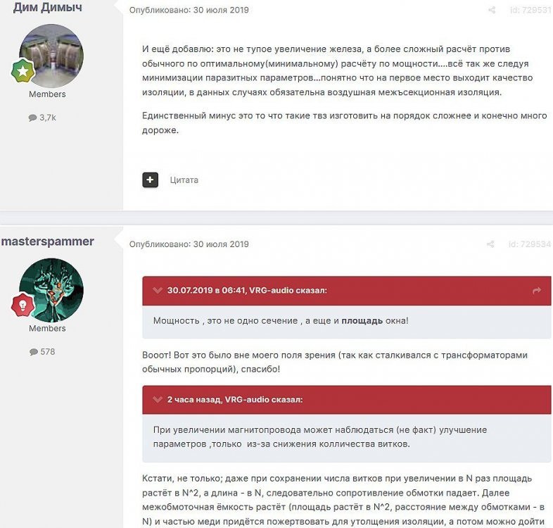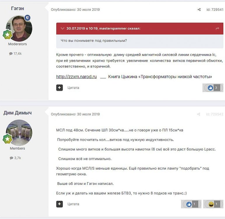 14. Optimus Опубликовано: 11 декабря 2018 (изменено) Активное сопротивление надо еще снижать. Оно должно быть в пределах 10% от внутреннего лампы. В вашем случае около 20 ом. Снизить количество витков и увеличить толщину провода надо. На стандартном железе тяжело намотать выходник для МГ. Снизьте альфу. Хотя бы до 8. Разницу вы все равно не услышите. Изменено 11 декабря 2018 пользователем Optimus _____________________________________________________________________________________________________________________________________________________________________________________ Гость qa7 Опубликовано: 11 декабря 2018 (изменено) В МГ (3х6с19п) Rакт.1 = 71 Ом , w1= 3520 витков 0.76мм w2 = 152 витка 1.17мм Альфа = 3217:240=13,4 (Iа=120мА) я в мини (2х6с19п) Rакт.1 = 100 Ом, Альфа = 2142 : 360 = 5.95, так? (Iа=80мА) Ri 6с19п=720 Ом , Ri 2х6с19п=360 Ом , значит 360 Ом : 10 = 36 Ом = Rакт1 ??? но в МГ = 71 Ом. Не слишком малое Rакт1 требуется? Изменено 11 декабря 2018 пользователем qa7 _________________________________________________________________________________________________________________________________________________________________________ Optimus Опубликовано: 11 декабря 2018 Я режимов в МГ и данных намоточных не помню. Если ваши вписываются в концепцию то может. Я просто советовал исходя из общеприменительных рекомендаций. Активное сопротивление первички все же хочется поменьше. Если есть желание намотать побольше проволоки, то тогда может имеет смысл взять железо с расширенным окном, чтоб потолще проволока поместилась. Альфу я смотрел в даташите (200 ом для двух), теперь вижу что там по режиму 360 для двоих. Выходники в МГ очень специфические. _____________________________________________________________________________________________________________________________________________________________________ Гость qa7 Опубликовано: 11 декабря 2018 Позволю себе выложить конспектик: Wizard: Размерчики ТВЗ: высота снаружи 192 мм,ширина снаружи 228 мм,толшина набора 85 мм, высота внутри (окно) 92 мм,ширина внутри (окно)128 мм.Объём стали 2720 куб.см,масса стали 18,8 кг.Длина магнитносиловой линии 59,7 см,средняя длина витка обмоток 44,3 см. КПД ТВЗ 0,99,т.е. 99%.Масса ТВЗ около 40 кг.Измеренные значения: индуктивность при 20Гц около 20 Гн,инд.рассеяния 2,4 мГн,емкость,приведённая к первичной обмотке 5000 пФ, сопротивление первичной обмотки на постоянном токе 71 Ом. Коэффициент трансформации 0,04 (или в переводе на украинский 25).Первичная обмотка - 3520 вит. провода в изоляции 0,76мм,вторичная - на каждой из двух катушек по 76 витков,включённых затем последовательно,т.е. всего 152 витка провода в изоляции 1,17 мм.На каждой катушке по 1760 витков первички,т.к. ТВЗ стержневого типа.Первичка имеет 16 секций,вторичка - 17 секций,т.е. всего по 33 секции на каждой катушке.Расчётное сопротивление нагрузки около 6 Ом. Толщина бумажных прокладок между обмотками 0,544 мм.Пропитка отсутствует.Толщина немагнитной прокладки - 0,224 мм.Сталь горячекатанная 0,35 мм,нарубленная специально из листов с сохранением продольной текстуры. Забыл добавить,что сечение железки 42,5 кв.см,а ширина нарубленных полосок - 50 мм.Индукция около 400 Гс. Ток анода лампы первого каскада 40 мА,ток анода каждой из трёх ламп второго (и последнего) каскада - 40 мА тоже. Смещение 6С19П выбрано минус 90 В,что при токе 40 мА соответствует напряжению анод - катод 230 В,при этом в рабочей точке внутреннее сопротивление для одной лампы,найденное графоаналитически,составляет 720 Ом,т.е. для трёх ламп - 240 Ом. _______________________________________________________________________________________________________________________________________________________________________________________ VRG-audio Опубликовано: 11 декабря 2018 Вообще то у одной 6С19П внутр.сопротивление около 300ом. Т.е две образ