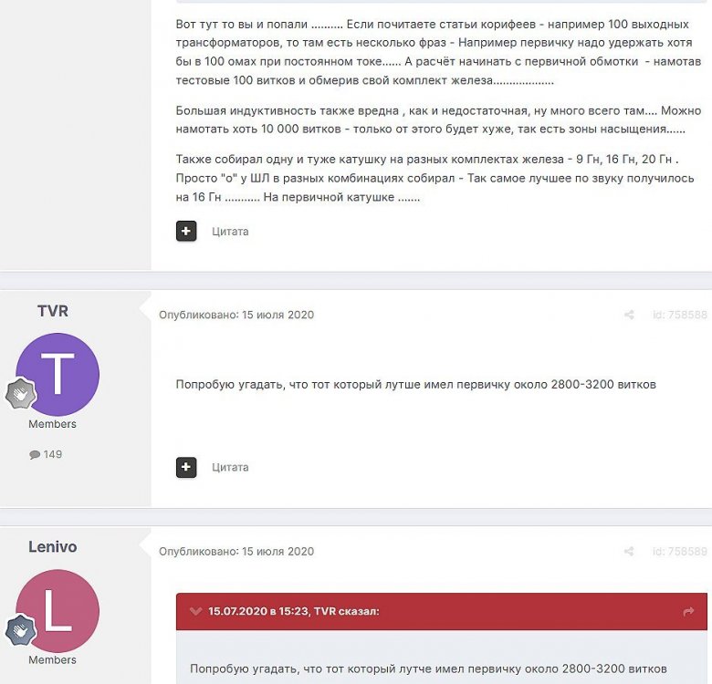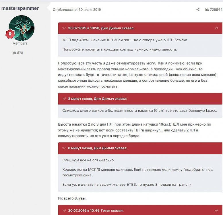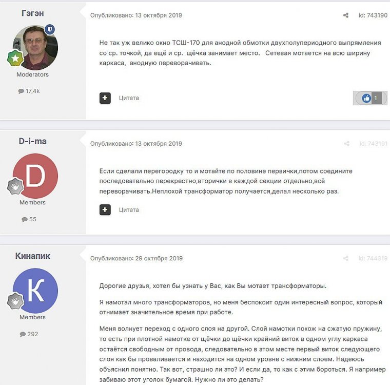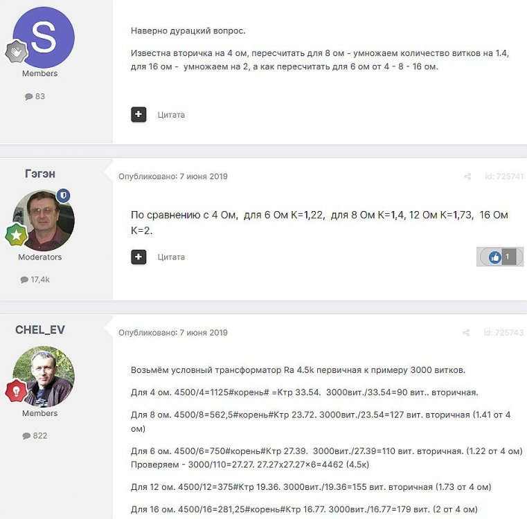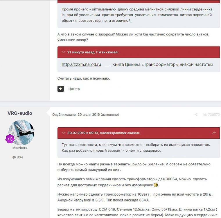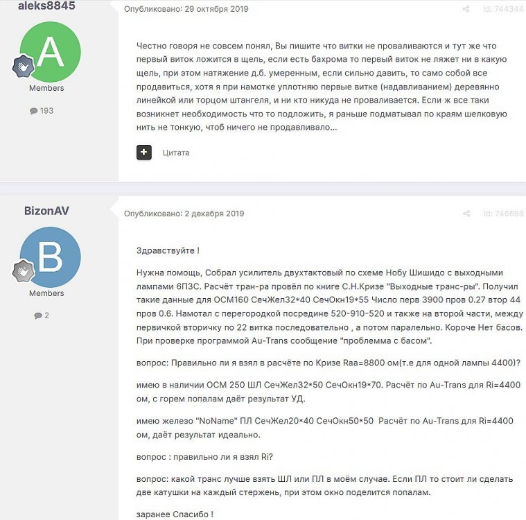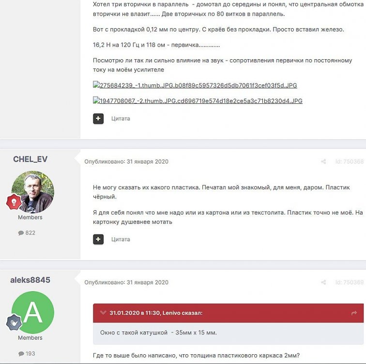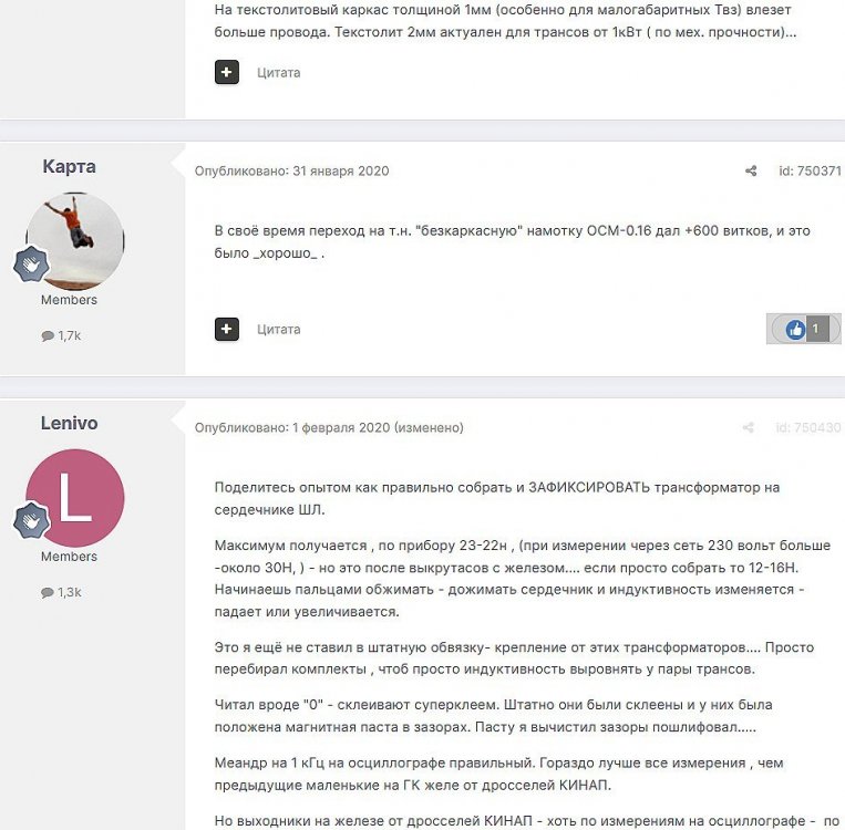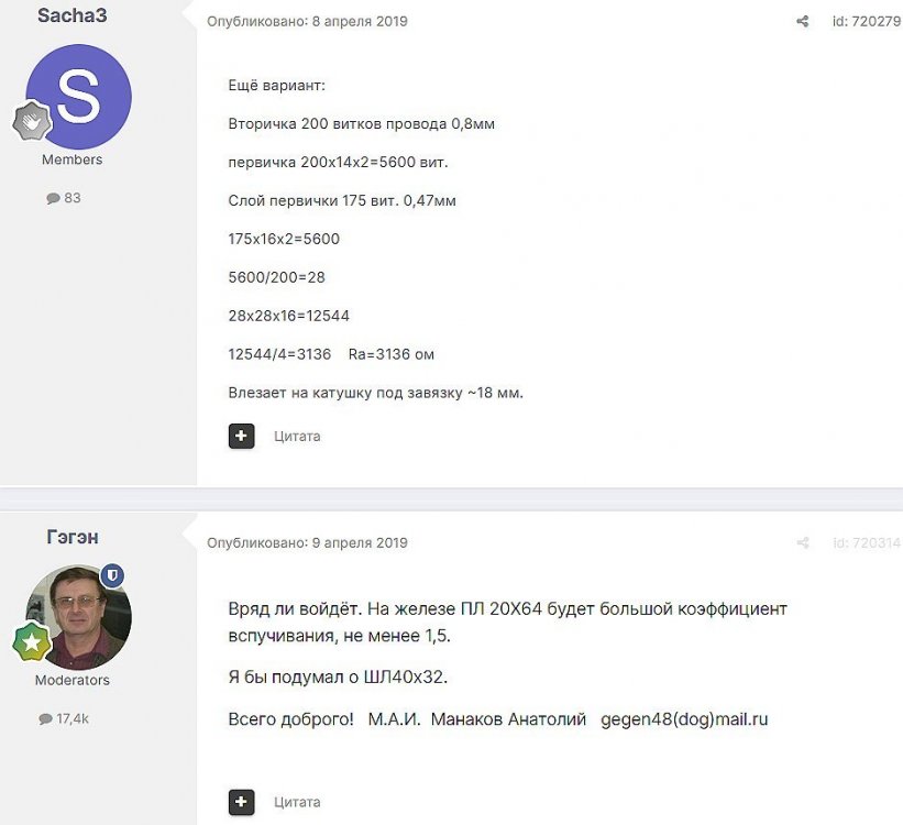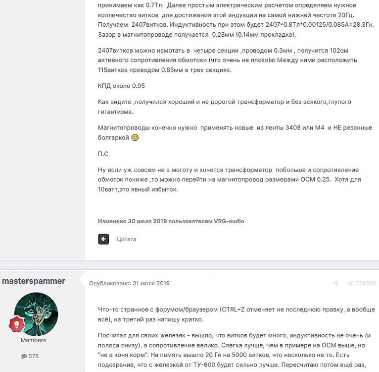 12. Гость qa7 Опубликовано: 24 декабря 2018 (изменено) Wadia 23 на AD1865 и Tannoy 15DMT II пойдет? А мотать не надо, все намотано, я про коммутацию спросил _______________________________________________________________________________________________________________________________________________________________________ Optimus Опубликовано: 24 декабря 2018 Зачем спрашивать то, что самому попробовать даже быстрее чем на форуме вопросы задать? Кстати на рисунке прикол не только в коммутации, но и в том что вторичка намотана в разные стороны. ___________________________________________________________________________________________________________________________________________________________ Sceptic Опубликовано: 25 декабря 2018 Так привыкли с детского сада. ____________________________________________________________________________________________________________________________________________________________ K.U.E. Опубликовано: 23 января 2019 Подскажите,катодную обмотку можно намотать поверху уже намотанной катушки?Где оптимально её располагать? _________________________________________________________________________________________________________________________________________________________________________________ Гэгэн Опубликовано: 23 января 2019 Можно. Обычно - первой. Всего доброго! М.А.И. Манаков Анатолий gegen48(dog)mail.ru _________________________________________________________________________________________________________________________________________________________ Sacha3 Опубликовано: 6 апреля 2019 Попалось мне железо ШЛ, много, штук 30. Не стандартное, или ШЛ40х32х100х40, или ПЛ20х32х100х40. В справочниках нет такого. Собраны на нем были трансформаторы (судя по пустым катушкам) с размером сердечника 40х64 из 8 штук с зазором 1 мм, прокладки из текстолита. Хочу попробовать намотать на них выходной транс для усилителя «Двухтактный УНЧ 6П3С, EL34» Манакова Анатолия, только лампы 6550. Использовать 4 сердечника как ПЛ20х64х100х40 с двумя катушками. Взялся за расчеты по книге Цыкина «Трансформаторы низкой частоты» 1955г и Васильченко Е.В. «Расчет и изготовление выходного трансформатора лампового УМЗЧ.»( по книге Войшвилло “Усилители низкой частоты” издания 1953г) Триод, кл "А", Ra - 3,2k, Rн - 16 Ом, Ea – 390 v, Ia - 73-76mA, Fн – 20 гц, Fв – 20 кгц, Qc – 12,8 см2, lc – 29,96 см2, площадь окна – 40 см2. габарит намотки 97х37 У Васильченко расчет ведется в Excel, вот что получилось: w1 = 3013 вит. d1 = 0,41 мм. w2 = 211 вит. d2 = 1,08 мм. L1 = 18,26 Гн В книге Цыкина две формулы для определения количества витков первичной обмотки. По одной получается 3415 витков По другой – 6345 витков. Далее он советует выбирать большее. Разница почти двукратная, на верно что то не так сделал. d1 = 0,44 мм. w2 = 239 вит. d2 = 1,15 мм. L1 = 27,53 Гн Прикинул с заполнением, окно заполняется чуть больше чем на половину. Сижу в ступоре. Кто то писал что расчет выходного 30% математика и 70% практика, наверно правда. ______________________________________________________________________________________________________________________________________________________________________________________ SSnessarev Опубликовано: 6 апреля 2019 Я бы взял 8 сердечников. ШЛ40×64 просто здорово. С таким окном , можно и провод потолще взять. Также сделать правильную изоляцию межслойную и межсекционную, с увеличением толщины оной с удалением от сердечника. Большое окно это хорошо ____________________________________________________________________________________________________________________________________________________________ CHEL_EV Опубликовано: 7 апреля 2019 Если Вам подходит данный Ra, то Ктр получается 14 или 15 для 16-ти Om. Возьмите вторичный провод и намотайте его. Количество намотанных витков умножаем на Ктр, и вы увидете сколько мотать вторичного провода в витках. Далее мотаете один слой первичного провода, считаете витки, и думаете уже как распределить обмотки. У вас должно получится типа 2-1-2-1-2 на каждой катушке. Итого шесть вторичных об