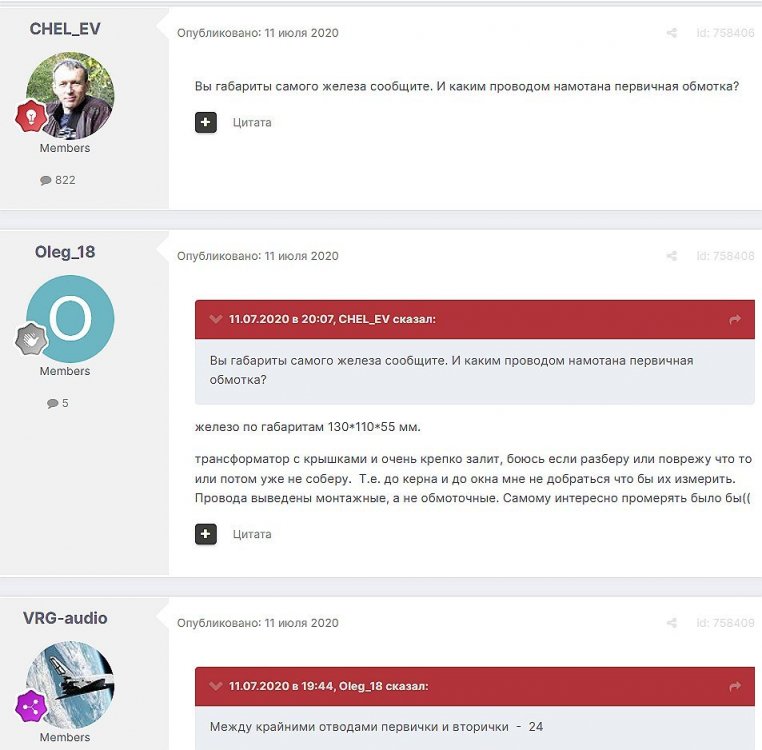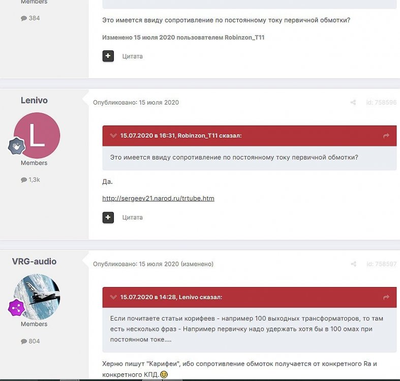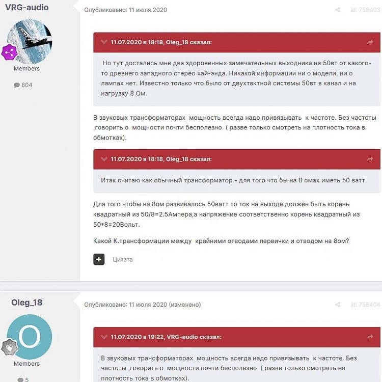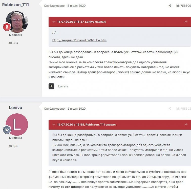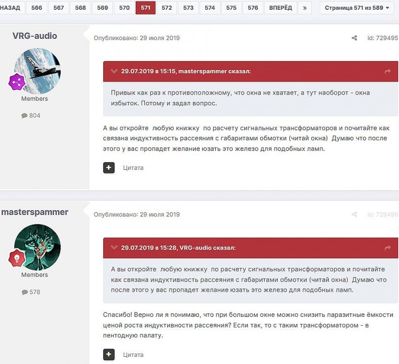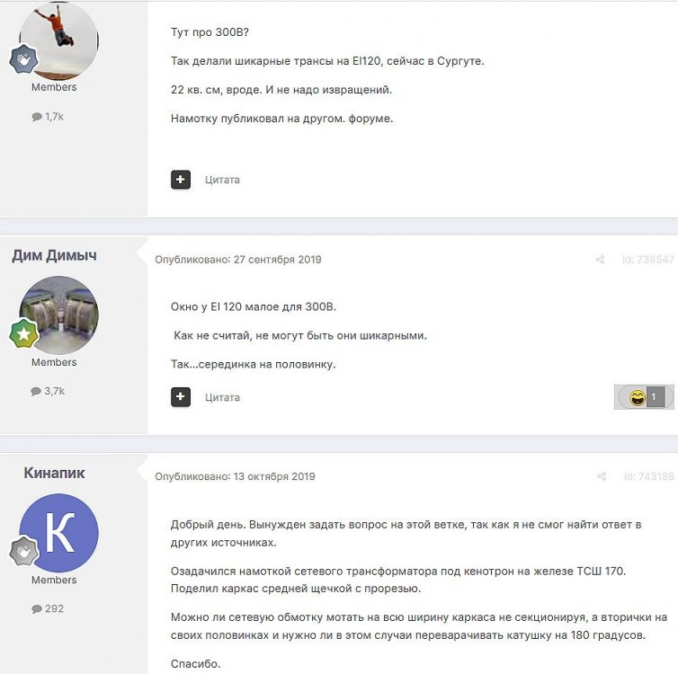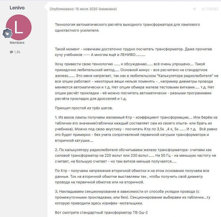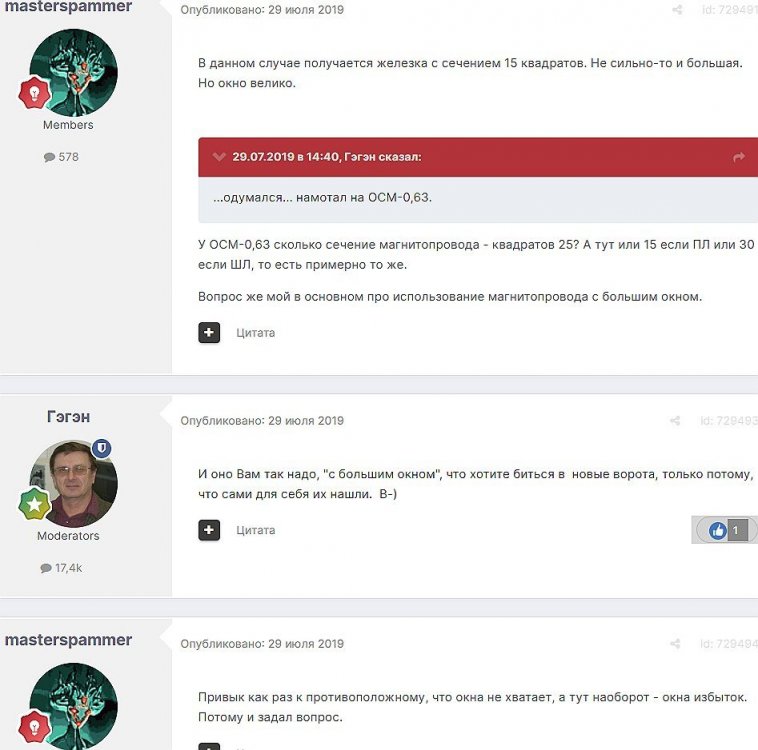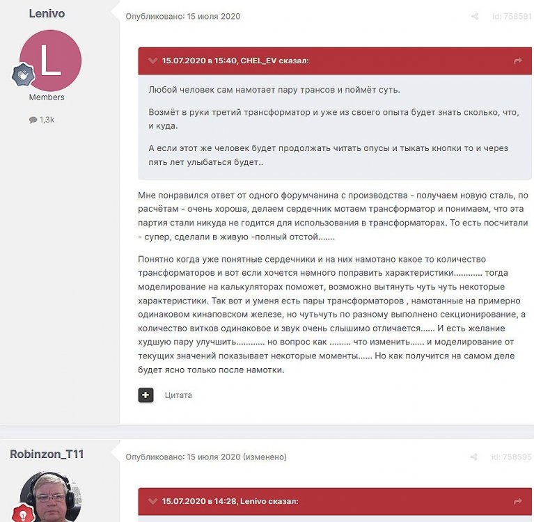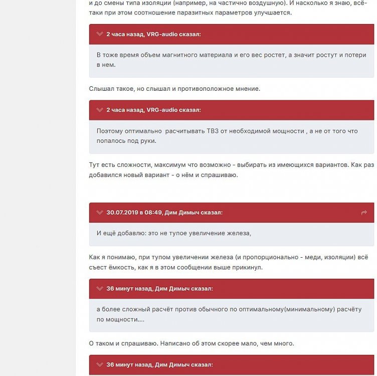 12. Гость qa7 Опубликовано: 24 декабря 2018 (изменено) Wadia 23 на AD1865 и Tannoy 15DMT II пойдет? А мотать не надо, все намотано, я про коммутацию спросил _______________________________________________________________________________________________________________________________________________________________________ Optimus Опубликовано: 24 декабря 2018 Зачем спрашивать то, что самому попробовать даже быстрее чем на форуме вопросы задать? Кстати на рисунке прикол не только в коммутации, но и в том что вторичка намотана в разные стороны. ___________________________________________________________________________________________________________________________________________________________ Sceptic Опубликовано: 25 декабря 2018 Так привыкли с детского сада. ____________________________________________________________________________________________________________________________________________________________ K.U.E. Опубликовано: 23 января 2019 Подскажите,катодную обмотку можно намотать поверху уже намотанной катушки?Где оптимально её располагать? _________________________________________________________________________________________________________________________________________________________________________________ Гэгэн Опубликовано: 23 января 2019 Можно. Обычно - первой. Всего доброго! М.А.И. Манаков Анатолий gegen48(dog)mail.ru _________________________________________________________________________________________________________________________________________________________ Sacha3 Опубликовано: 6 апреля 2019 Попалось мне железо ШЛ, много, штук 30. Не стандартное, или ШЛ40х32х100х40, или ПЛ20х32х100х40. В справочниках нет такого. Собраны на нем были трансформаторы (судя по пустым катушкам) с размером сердечника 40х64 из 8 штук с зазором 1 мм, прокладки из текстолита. Хочу попробовать намотать на них выходной транс для усилителя «Двухтактный УНЧ 6П3С, EL34» Манакова Анатолия, только лампы 6550. Использовать 4 сердечника как ПЛ20х64х100х40 с двумя катушками. Взялся за расчеты по книге Цыкина «Трансформаторы низкой частоты» 1955г и Васильченко Е.В. «Расчет и изготовление выходного трансформатора лампового УМЗЧ.»( по книге Войшвилло “Усилители низкой частоты” издания 1953г) Триод, кл "А", Ra - 3,2k, Rн - 16 Ом, Ea – 390 v, Ia - 73-76mA, Fн – 20 гц, Fв – 20 кгц, Qc – 12,8 см2, lc – 29,96 см2, площадь окна – 40 см2. габарит намотки 97х37 У Васильченко расчет ведется в Excel, вот что получилось: w1 = 3013 вит. d1 = 0,41 мм. w2 = 211 вит. d2 = 1,08 мм. L1 = 18,26 Гн В книге Цыкина две формулы для определения количества витков первичной обмотки. По одной получается 3415 витков По другой – 6345 витков. Далее он советует выбирать большее. Разница почти двукратная, на верно что то не так сделал. d1 = 0,44 мм. w2 = 239 вит. d2 = 1,15 мм. L1 = 27,53 Гн Прикинул с заполнением, окно заполняется чуть больше чем на половину. Сижу в ступоре. Кто то писал что расчет выходного 30% математика и 70% практика, наверно правда. ______________________________________________________________________________________________________________________________________________________________________________________ SSnessarev Опубликовано: 6 апреля 2019 Я бы взял 8 сердечников. ШЛ40×64 просто здорово. С таким окном , можно и провод потолще взять. Также сделать правильную изоляцию межслойную и межсекционную, с увеличением толщины оной с удалением от сердечника. Большое окно это хорошо ____________________________________________________________________________________________________________________________________________________________ CHEL_EV Опубликовано: 7 апреля 2019 Если Вам подходит данный Ra, то Ктр получается 14 или 15 для 16-ти Om. Возьмите вторичный провод и намотайте его. Количество намотанных витков умножаем на Ктр, и вы увидете сколько мотать вторичного провода в витках. Далее мотаете один слой первичного провода, считаете витки, и думаете уже как распределить обмотки. У вас должно получится типа 2-1-2-1-2 на каждой катушке. Итого шесть вторичных об