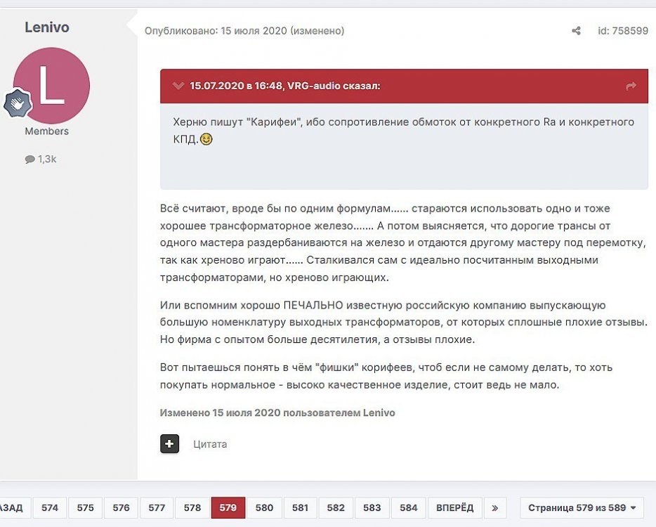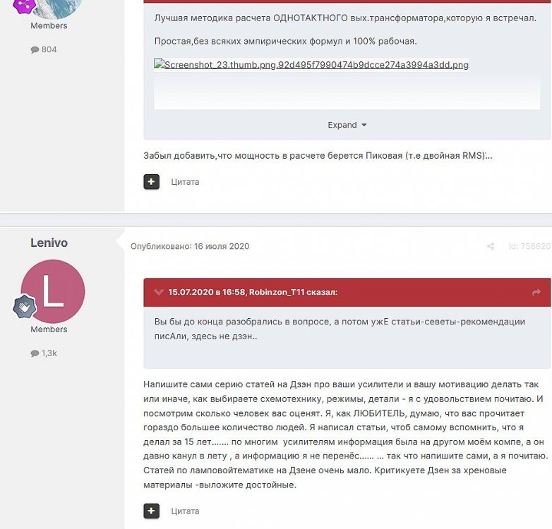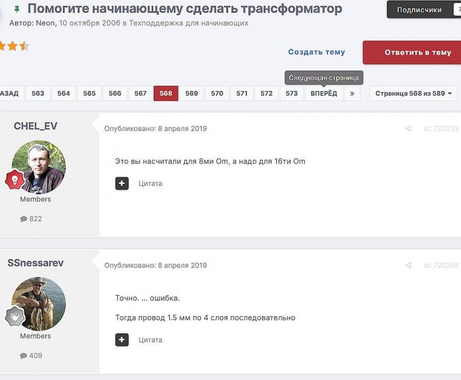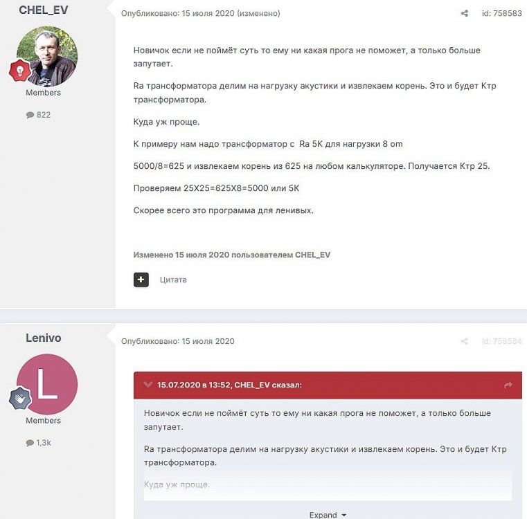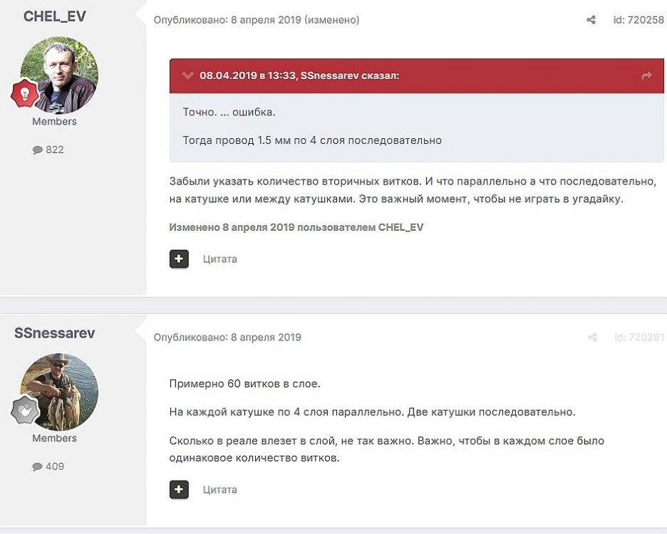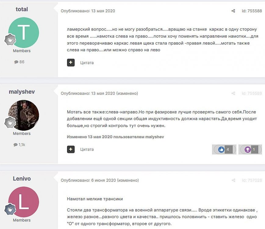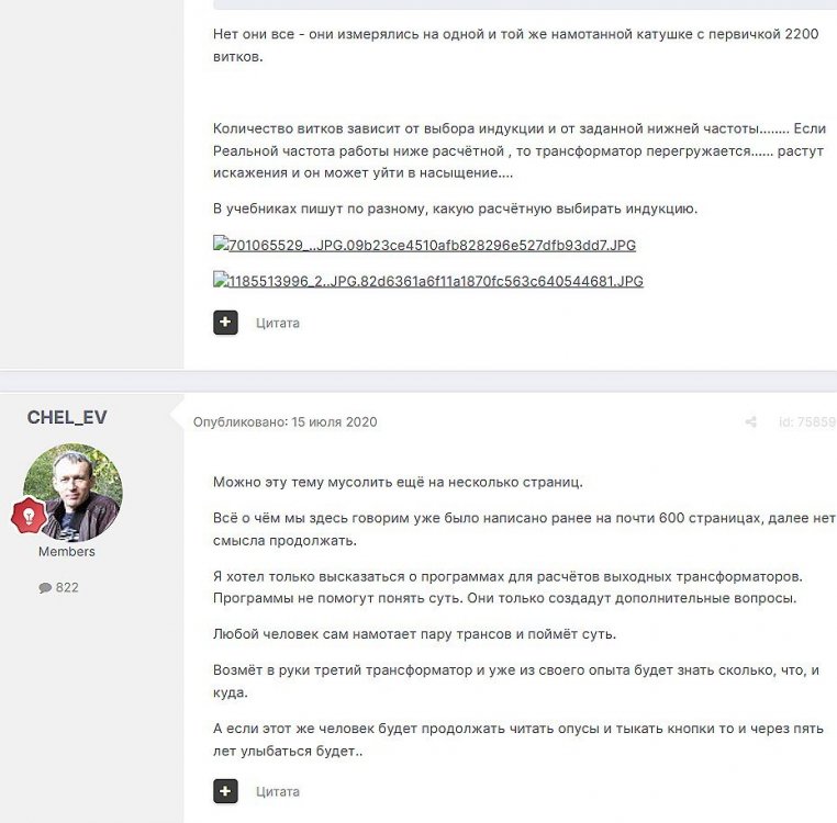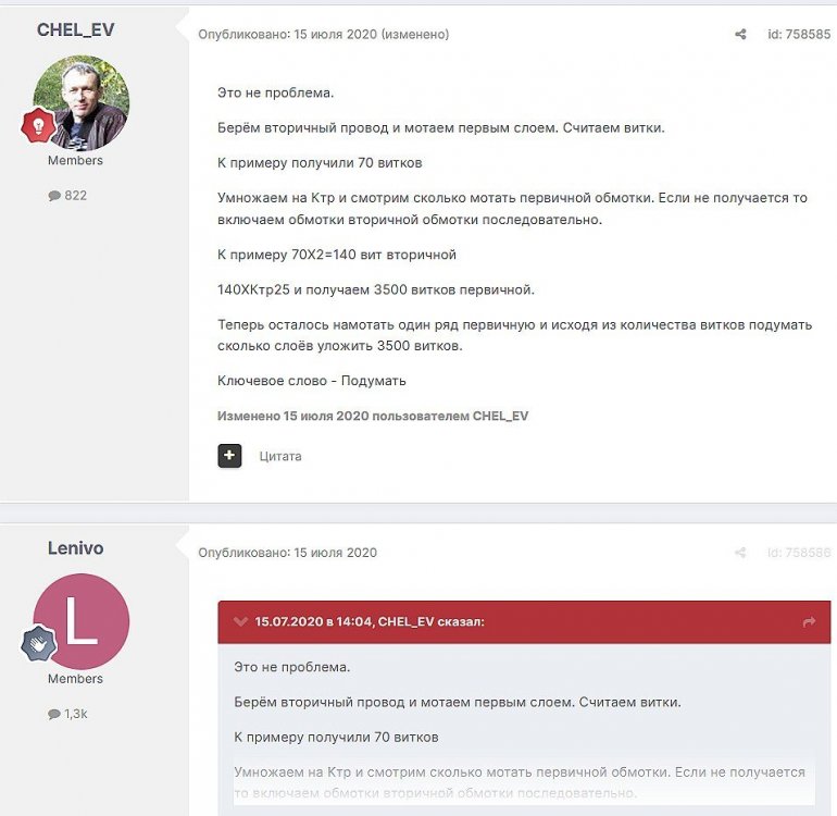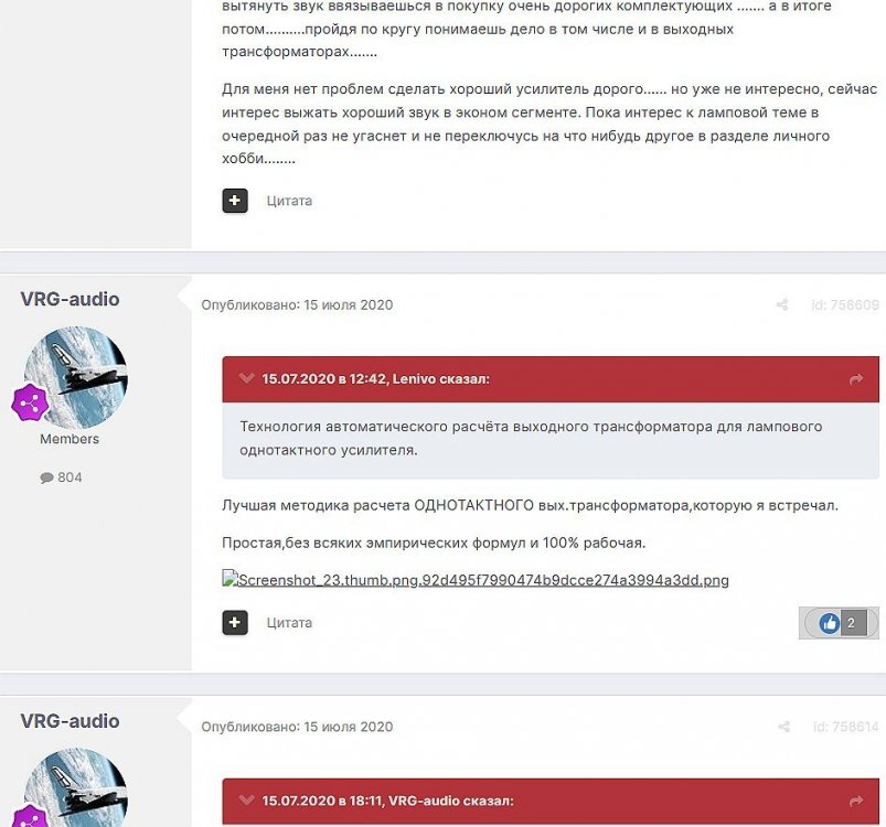 12. Гость qa7 Опубликовано: 24 декабря 2018 (изменено) Wadia 23 на AD1865 и Tannoy 15DMT II пойдет? А мотать не надо, все намотано, я про коммутацию спросил _______________________________________________________________________________________________________________________________________________________________________ Optimus Опубликовано: 24 декабря 2018 Зачем спрашивать то, что самому попробовать даже быстрее чем на форуме вопросы задать? Кстати на рисунке прикол не только в коммутации, но и в том что вторичка намотана в разные стороны. ___________________________________________________________________________________________________________________________________________________________ Sceptic Опубликовано: 25 декабря 2018 Так привыкли с детского сада. ____________________________________________________________________________________________________________________________________________________________ K.U.E. Опубликовано: 23 января 2019 Подскажите,катодную обмотку можно намотать поверху уже намотанной катушки?Где оптимально её располагать? _________________________________________________________________________________________________________________________________________________________________________________ Гэгэн Опубликовано: 23 января 2019 Можно. Обычно - первой. Всего доброго! М.А.И. Манаков Анатолий gegen48(dog)mail.ru _________________________________________________________________________________________________________________________________________________________ Sacha3 Опубликовано: 6 апреля 2019 Попалось мне железо ШЛ, много, штук 30. Не стандартное, или ШЛ40х32х100х40, или ПЛ20х32х100х40. В справочниках нет такого. Собраны на нем были трансформаторы (судя по пустым катушкам) с размером сердечника 40х64 из 8 штук с зазором 1 мм, прокладки из текстолита. Хочу попробовать намотать на них выходной транс для усилителя «Двухтактный УНЧ 6П3С, EL34» Манакова Анатолия, только лампы 6550. Использовать 4 сердечника как ПЛ20х64х100х40 с двумя катушками. Взялся за расчеты по книге Цыкина «Трансформаторы низкой частоты» 1955г и Васильченко Е.В. «Расчет и изготовление выходного трансформатора лампового УМЗЧ.»( по книге Войшвилло “Усилители низкой частоты” издания 1953г) Триод, кл "А", Ra - 3,2k, Rн - 16 Ом, Ea – 390 v, Ia - 73-76mA, Fн – 20 гц, Fв – 20 кгц, Qc – 12,8 см2, lc – 29,96 см2, площадь окна – 40 см2. габарит намотки 97х37 У Васильченко расчет ведется в Excel, вот что получилось: w1 = 3013 вит. d1 = 0,41 мм. w2 = 211 вит. d2 = 1,08 мм. L1 = 18,26 Гн В книге Цыкина две формулы для определения количества витков первичной обмотки. По одной получается 3415 витков По другой – 6345 витков. Далее он советует выбирать большее. Разница почти двукратная, на верно что то не так сделал. d1 = 0,44 мм. w2 = 239 вит. d2 = 1,15 мм. L1 = 27,53 Гн Прикинул с заполнением, окно заполняется чуть больше чем на половину. Сижу в ступоре. Кто то писал что расчет выходного 30% математика и 70% практика, наверно правда. ______________________________________________________________________________________________________________________________________________________________________________________ SSnessarev Опубликовано: 6 апреля 2019 Я бы взял 8 сердечников. ШЛ40×64 просто здорово. С таким окном , можно и провод потолще взять. Также сделать правильную изоляцию межслойную и межсекционную, с увеличением толщины оной с удалением от сердечника. Большое окно это хорошо ____________________________________________________________________________________________________________________________________________________________ CHEL_EV Опубликовано: 7 апреля 2019 Если Вам подходит данный Ra, то Ктр получается 14 или 15 для 16-ти Om. Возьмите вторичный провод и намотайте его. Количество намотанных витков умножаем на Ктр, и вы увидете сколько мотать вторичного провода в витках. Далее мотаете один слой первичного провода, считаете витки, и думаете уже как распределить обмотки. У вас должно получится типа 2-1-2-1-2 на каждой катушке. Итого шесть вторичных об
