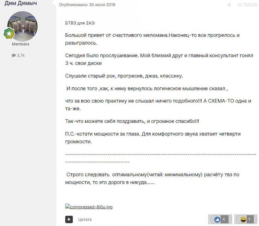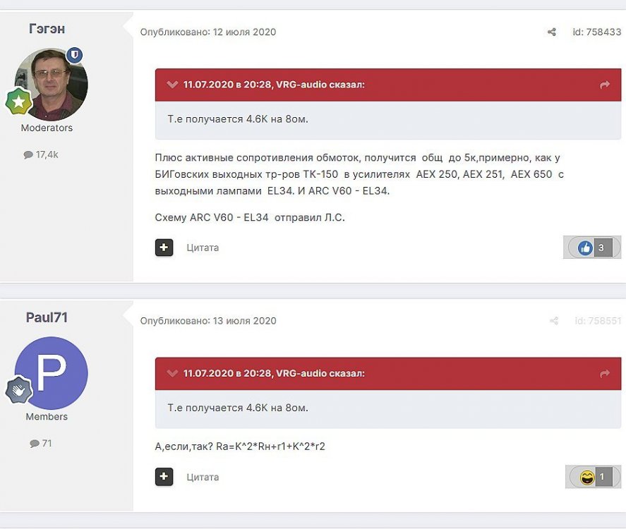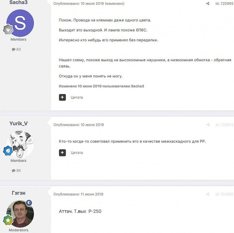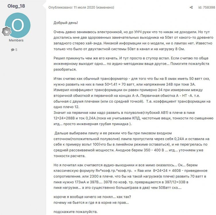 13. Гость qa7 Опубликовано: 11 декабря 2018 Это на HiB C-core 1200витков и 27Гн? ________________________________________________________________________________________________________________________________________________________________________ Сергей Алекс. Опубликовано: 11 декабря 2018 (изменено) Это для режима 40 мА / 230 В. Позже, насколько я помню, был другой, с током побольше и внутренним меньше. В вашем случае, чтобы получить приемлемые параметры при небольшом окне, стоит ограничиться приведённым сопротивлением нагрузки 2-2,5 кОм для двух ламп, либо выбирать другое железо с окном побольше. И нужно учитывать, что при режиме, отличном от ЧТУ, разброс между лампами увеличивается, поэтому желательно снимать ВАХи каждой лампы самому. ______________________________________________________________________________________________________________________________________________________________ Гость qa7 Опубликовано: 11 декабря 2018 Сообщение от qa7 ...Ri= 720 Ом для одной 6с19п. Сергей Алекс. писал: Именно так, а не Ri=300 Ом при 95 мА/110 В Ug=-7 В по паспорту для 6с19п. Цитата у меня именно так Ra=2.14 кОм (см.фото) P.S: Wizard:" ..Если без стёба и флейма,то нагрузка для ОДНОЙ штуки 6С19П составляет 9350 Ом,т.е. для трех:3117 Ом." ________________________________________________________________________________________________________________________________________________________________________ VRG-audio Опубликовано: 11 декабря 2018 Нет , это на нормальном , холоднокатанном, штампованном железе типа М6 или Российском аналоге 3408. При соблюдении условий зазора в 0.13мм На ХайБи СиКоре будет более 30Гн. _______________________________________________________________________________________________________________________________________________________________________________________ Гэгэн Опубликовано: 14 декабря 2018 (изменено) qa7 писал: Рассчитывать Ri нужно исходя из реальной рабочей точки и режимов лампы в ней, также и Ra и Y. Аттач. _______________________________________________________________________________________________________________________________________________________ Гость qa7 Опубликовано: 14 декабря 2018 Анатолий Иосифович, режимы уже заданы применением в МГ: Ua=230v la=40mA Ug=-90v _______________________________________________________________________________________________________________________________________________________________________________________ Гэгэн Опубликовано: 15 декабря 2018 Не сотвори себе кумира.... И что, разве это линейные режимы? Постройте и посчитайте сами. Разгадка не имеет никакого смысла, если Вы не нашли её сами. _________________________________________________________________________________________________________________________________________________________ Гость qa7 Опубликовано: 19 декабря 2018 Да Анатолий Иосифович, Вы правы. ЮАМ молчит в почту, поэтому "отдуваться" буду сам: действительно при Ua=230V ; Ia=40mA ; Ri 6с19п=550 Ohm; при Ua=178V ; Ia=55mA ; Ri 6с19п=400 Ohm С уважением, Сергей. ____________________________________________________________________________________________________________________________________________________________________________________ Гость qa7 Опубликовано: 24 декабря 2018 Заметно ли на слух, если изменить простую последовательную коммутацию первички (1-2-3-4.. секции) на "необычную"?: P.S: в моем случае первички всего три секции . ___________________________________________________________________________________________________________________________________________________________________________________ Optimus Опубликовано: 24 декабря 2018 Вы столько вопросов задаете на которые вам никто никогда не ответит. Сами бы уже намотали так и так и сравнили бы для себя. Я вам совет один дам, чтоб жилось легче. Хороший дорогой источник, и хорошие дорогие АС это гораздо важнее чем намотка транса. Будет у вас хорошие источник и АС усилитель и с обычной намоткой 3+2 будет звучать очень хорошо. Это конечно с учетом что мотается на приличном железе.