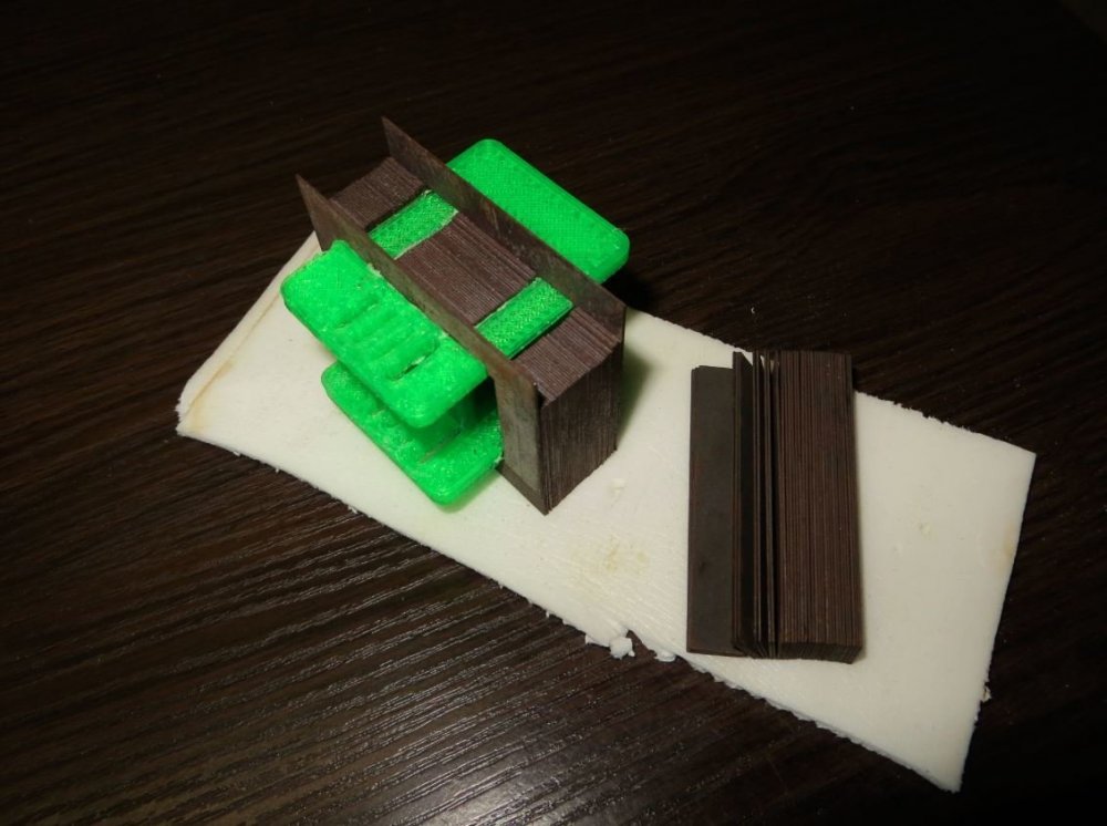 4. Алгоритм получился такой. 1.Подобрать более менее железо одинаковое с измерением на одной катушке. 2. Отшлифовать и притереть торцы у сердечников - чтоб слипались. 3. Предварительно собрать и пометить половинки ''O''. 4. На торцы "О" внутри катушек наклеить бумажную прокладку с одной стороны . Потом шкуркой выровнять торцы у бумажной прокладки в заподлицо с железом. 5. Собрать с железные сердечники с катушкой. Торцы без бумажной прокладки проклеить капелькой цианкрилатовым клеем - и сжать струбциной. То есть у "О" жестко склеена только та часть, которая без прокладки. 6. Сердечник с катушкой обжать в фурнитуре. При этом контролируя прибором индуктивность - От обжима индуктивность гуляет +- 6Гн. Выровнять индуктивность у пары трансформаторов. Если пережать - то сердечник "разламывается по склейке" и индуктивность сразу падает (у меня до 8 Гн). Обжимать медленно -тисками или струбциной. Не стучать молотком - иначе сердечник разламывается. 7. Проварить в парафине. Мне подобрать нормальное подходящее железо было достаточно трудно. Может у кого достаточные запасы или есть доступ к производству или к ремонтному фонду - тем легче подобрать парные трансформаторы нужных размеров и нужного качества. Основные "затыки" - одинакоковые по габаритам трансформаторы имеют разное железо - разная ширина середечников, разная толщина навивки. Одни горячекатанные, другие из холоднокатанного железа. Часть сердечников откровенно похабного качества - торцы не зашлифованы - навивка рассыпается. Половинки имеют разное количество слоев в навивке.......Бывают половинки из разных комплектов - пропилы не совпадают( при соприкосновении с одной стороны с другой стороны может быть зазор до двух мм). Купить - набор железа? Так он золотой получается - 6-12 т.р. только за железо. А тут куча более менее подходящих трансформаторов - обойдется в 1000 рублей на барахолке-разборке. Зелёные трансформаторы имеют чаще всего лучшее железо, но так как зелёной мастикой замазывается весь брак сборки - то очень много зелёных сердечников после разборки только на выброс. Поставил на свой основной ламповый усилитель SE c3m+EL84 . Там стояли трансформаторы от "Золотой середины". Сперва поставил маленькие трансформаторы, намотанные на железе от Дросселей КИНАП. Слушал около недели. Ну а сейчас поставил Вот эти трансформаторы на ШЛ железе. Вроде было все промеряно, но до последнего переживал - до крышки усилителя по габаритам всего 3 мм осталось, но пришлось вырезать часть ребра жесткости в тепловом экране...... Всё-таки снижение сопротивления первичной обмотки по постоянному току очень хорошо " слышится". Усилитель стал копать "глубже". Больше деталей, лучше микротембры. Звук -более быстрый - более легкий стал....... Результат уже нравится... Но трансформаторам надо ещё разыграться какое то время. Кинаповские маленькие трансформаторы на этом усилителе тоже показали себя очень даже неплохо, но по детальности проигрывают трансам на ШЛ железе. Трансформаторы от "Золотой Середины" Хороши и простояли на этом усилителе более 6 лет...... По индуктивности примерно одинаковы с трансформаторами на ШЛ железе -при измерении прибором DE5000. А вот сопротивление первичной обмотки по постоянному току почти в три раза больше........ Хотя железо лучше - у "Золотой середины" - железо М6. Сперва получилось 25Гн на одном и 14 Гн на другом, пос